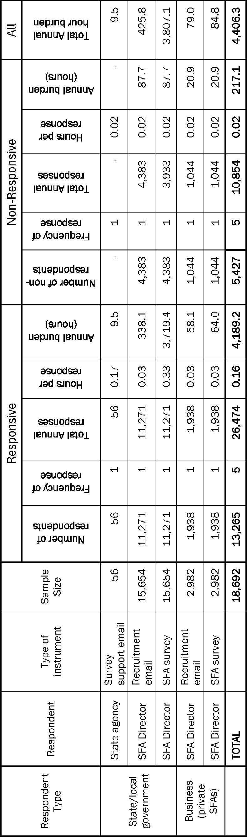 Estimated Number of Responses per Respondent: State Agency Director respondents will be asked to provide a current list of SFAs operating Child Nutrition Programs, as needed, and distribute a survey support email to these respondent groups annually (three times total, in SY 2025-2026, SY 2027-2028, and SY 2028-2029). SFAs will be asked to complete the web survey once per year.