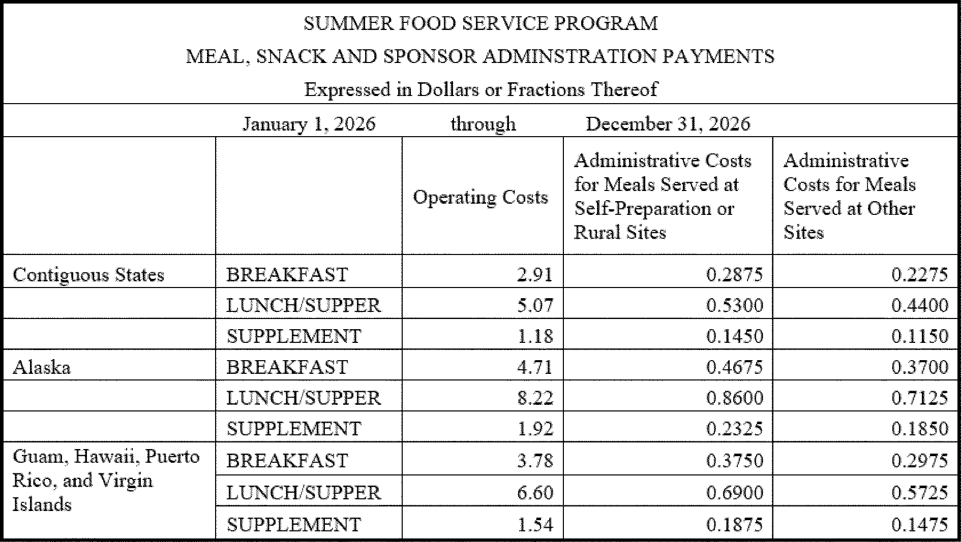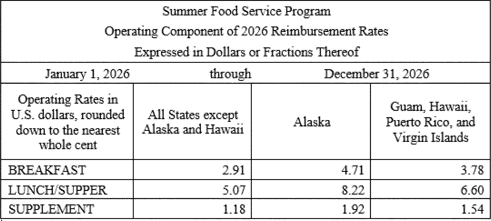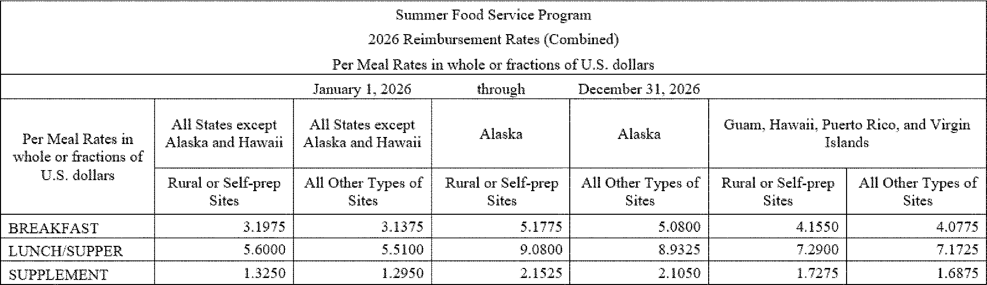 All States except Alaska and Hawaii —Breakfast—2 dollars and 91 cents (10 cents increase from the 2025 reimbursement rate), Lunch or Supper—5 dollars and 7 cents