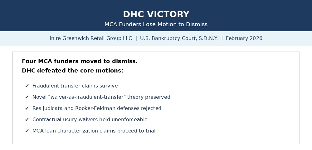 In In re Greenwich Retail Group LLC, decided February 20, 2026, Judge Michael E. Wiles of the U.S. Bankruptcy Court for the Southern District of New York denied motions to dismiss filed by four MCA funders—preserving our client’s claims that the MCA agreements were disguised usurious loans and securing the right to pursue recovery of all prior payments through the bankruptcy process.