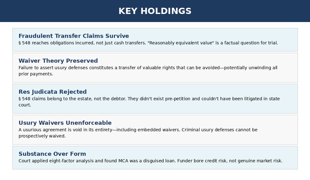 - Contractual Waivers Are Void. The court confirmed that usury waivers embedded in MCA agreements are unenforceable—the entire usurious contract is void, including any waivers.