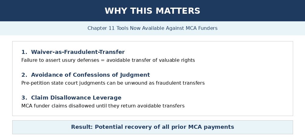 - Claim Disallowance Leverage. Under § 502(d), an MCA funder’s claim can be disallowed until it returns any avoidable transfers. This creates powerful negotiating leverage.