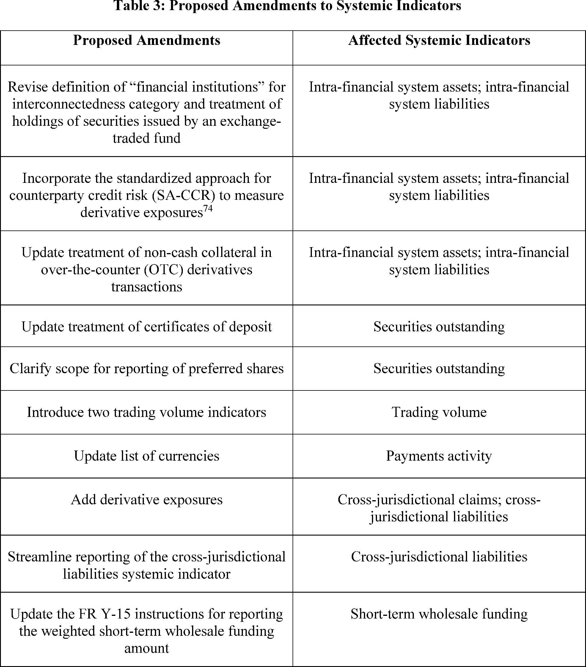 As section II.F of this **SUPPLEMENTARY INFORMATION** describes in detail, the proposal would make multiple changes to the intra-financial system assets and intra-financial system liabilities systemic indicators.