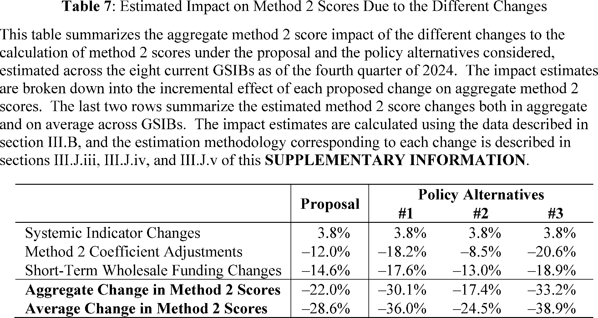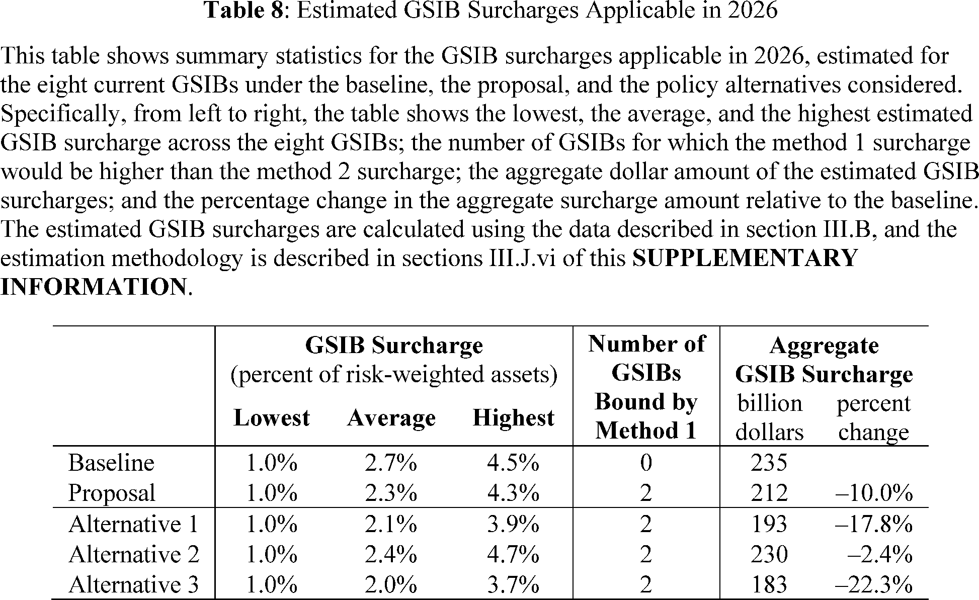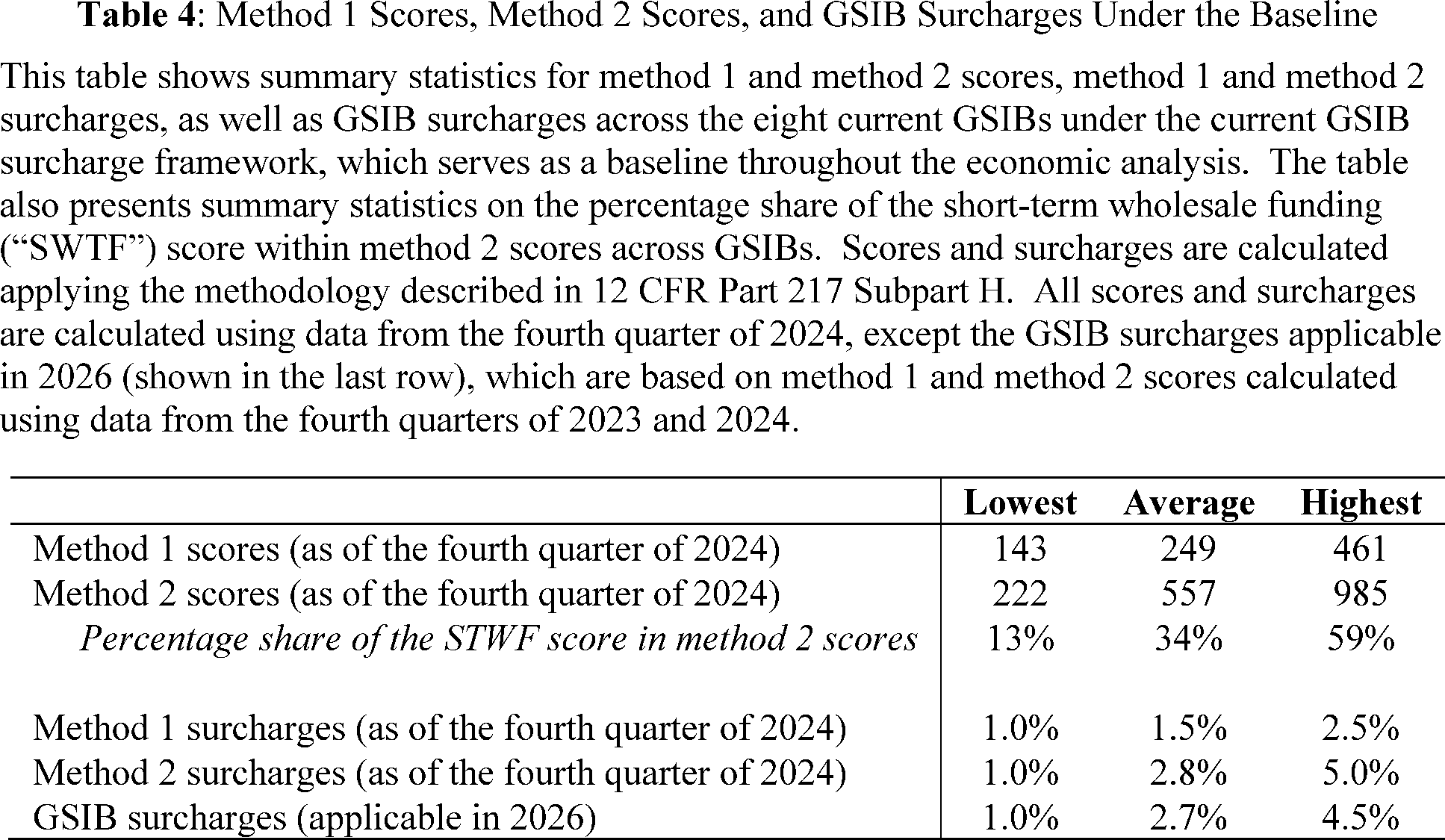 To estimate method 1 and method 2 surcharges as of the fourth quarter of 2023, the analysis respectively calculates method 1 and method 2 scores as of the fourth quarter of 2023, applying the methodology described in sections III.J.i to III.J.v of this **SUPPLEMENTARY INFORMATION** with the following modifications. Under Alternative 1, the analysis calculates updated method 2 systemic indicator coefficients by using the ratio of the CPI-W index as of December 31, 2015, and December 31, 2023 (instead of December 31, 2024). Under Alternative 2, the analysis calculates updated method 2 indicator coefficients by using the average of the euro-denominated aggregate global indicator amounts as of the end of 2022 and 2023 (instead of 2023 and 2024) and the average of daily euro-dollar exchange rates from 2021 to 2023 (instead of 2022 to 2024). The analysis uses the updated coefficient for the short-term wholesale funding component calculated as of the fourth quarter of 2024 because the aggregate weight of this component would be calibrated to 20 percent as of this date under both the proposal and the alternatives.