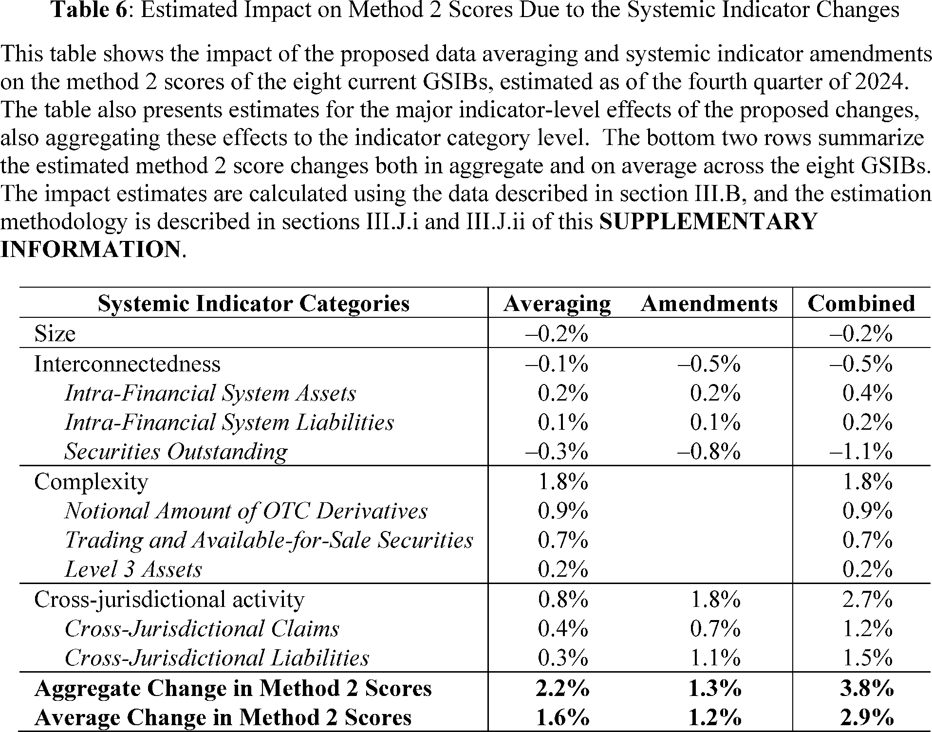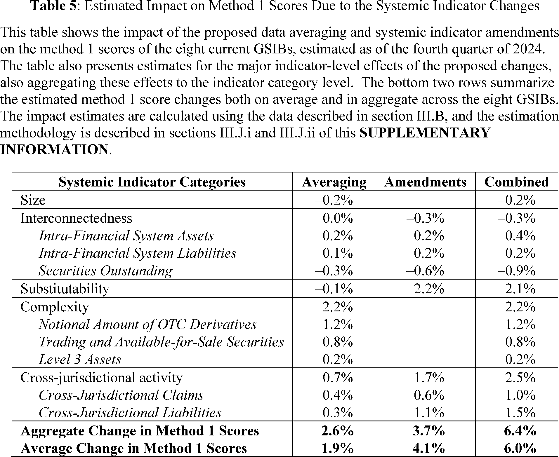 The analysis obtains the baseline amount of each indicator from FR Y-15 filings as of the fourth quarters of 2023 (or 2024). By contrast, depending on the specific proposed amendment, the analysis obtains the revised amount of each indicator from FR Y-15 filings, the Board's special data collection, and the Basel Committee on Banking Supervision's GSIB assessment exercise, described in section III.B of this **SUPPLEMENTARY INFORMATION**. For some indicators, the revised amount as of the fourth quarter of 2023 (or 2024) is reported, or calculated from data reported, in FR Y-15 filings and the GSIB assessment exercise. For other indicators, the analysis estimates the revised amount as of the fourth quarter of 2023 (or 2024) using data reported on the Board's special data collection as of the second quarter of 2023 by applying the following methodology. First, the analysis calculates the percent difference between a given indicator's baseline and revised amount as of the second quarter of 2023, reported in FR Y-15 filings and the Board's special data collection, respectively. If a proposed amendment only affects a subcomponent of an indicator, then the analysis calculates this percent difference for that particular component; otherwise, the analysis calculates the percent difference for the entire indicator. Second, the analysis estimates the indicator's revised amount as of the fourth quarter of 2023 (or 2024) by multiplying the indicator's, or its subcomponent's, baseline amount as of the fourth quarter of 2023 (or 2024) by one plus the percent change calculated in the first step.