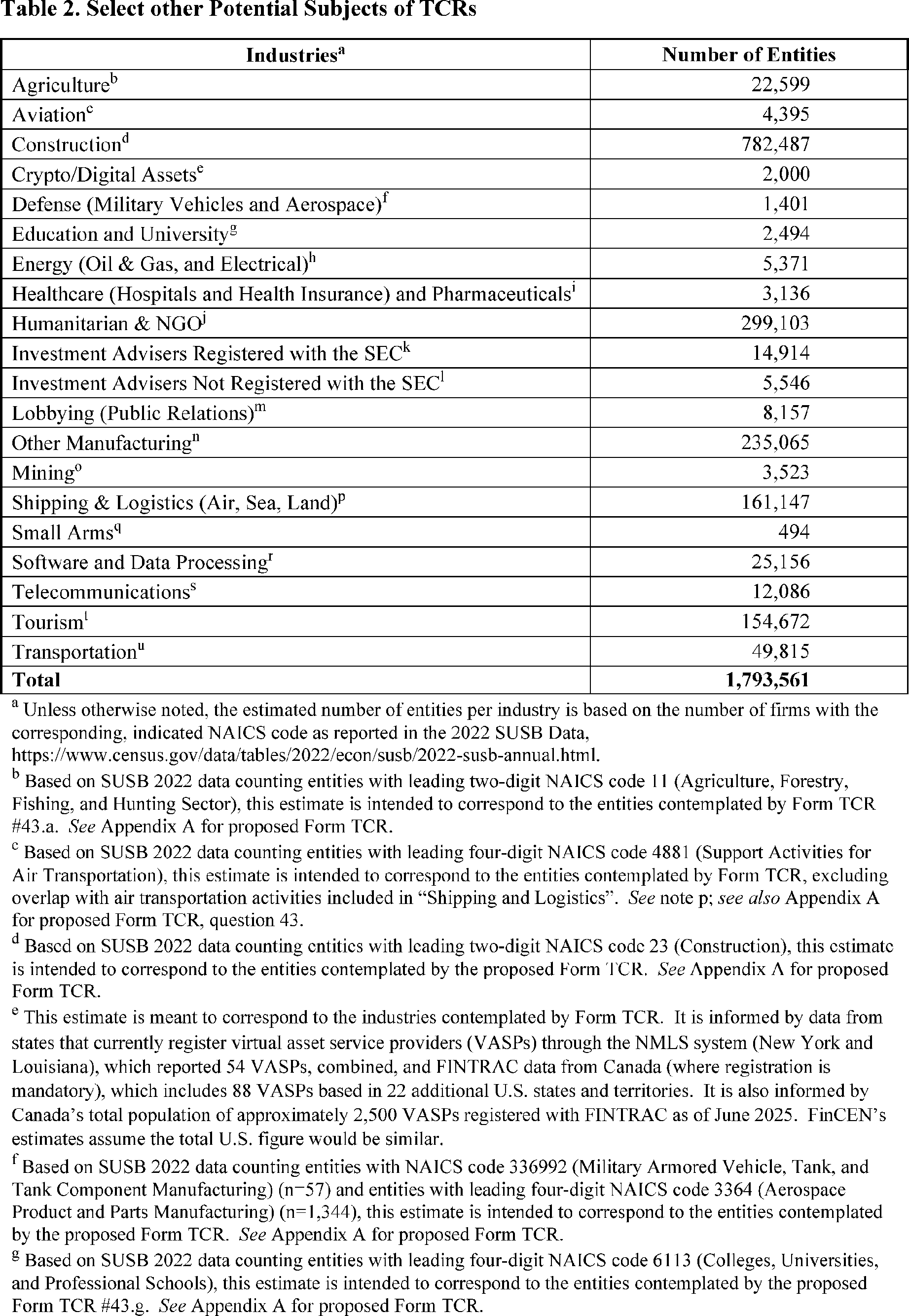 If the Form TCR relates solely to potential violations of IEEPA, TWEA, or the Kingpin Act (*i.e.,* there are no potential violations of the BSA) and the subject of the Form TCR alleged to have committed such potential violations is a financial institution, this question could be completed to indicate the type of financial institution that has committed the potential violation. Similarly, for a Form TCR involving a potential violation of the BSA allegedly committed by a non-financial entity (*e.g.,* violations of the requirement to file Form 8300 by a non-financial trade or business), information about the entity type could be provided in response to the BSA-related question below.