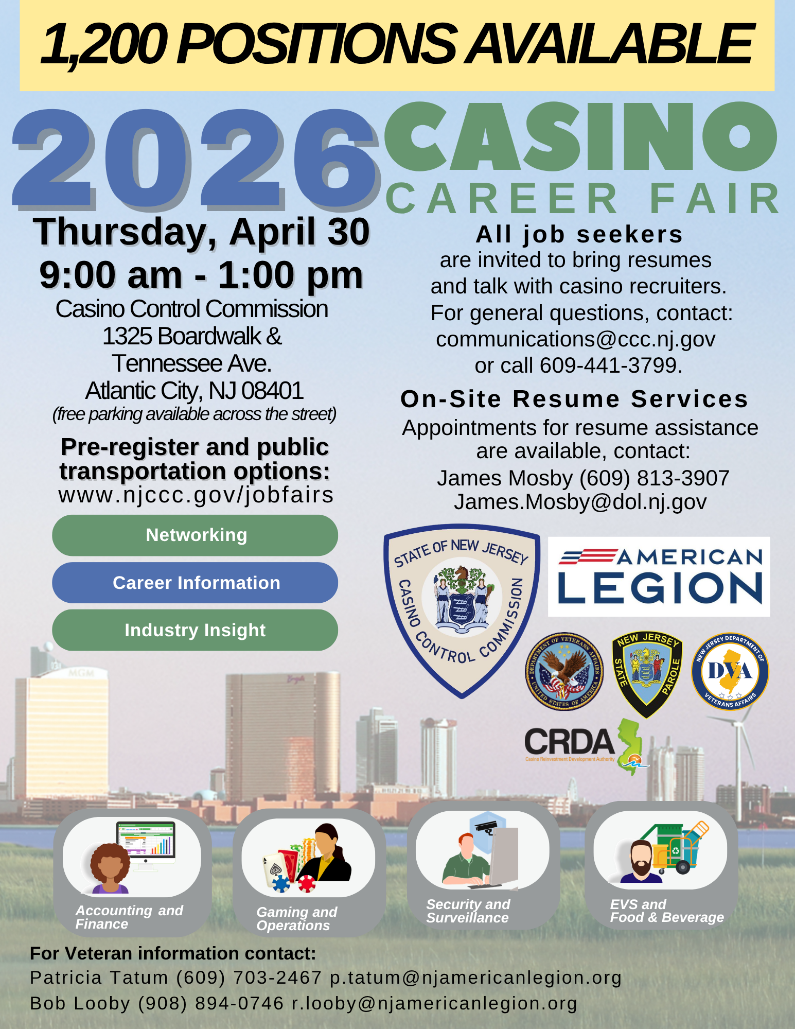 The NJ Casino Control Commission issued an announcement publicizing an upcoming Casino Career Fair scheduled for April 30, 2026, offering approximately 1,200 job positions. The announcement serves as an informational notice about the event rather than a regulatory action or compliance requirement. No new rules, obligations, or enforcement actions are established by this document.