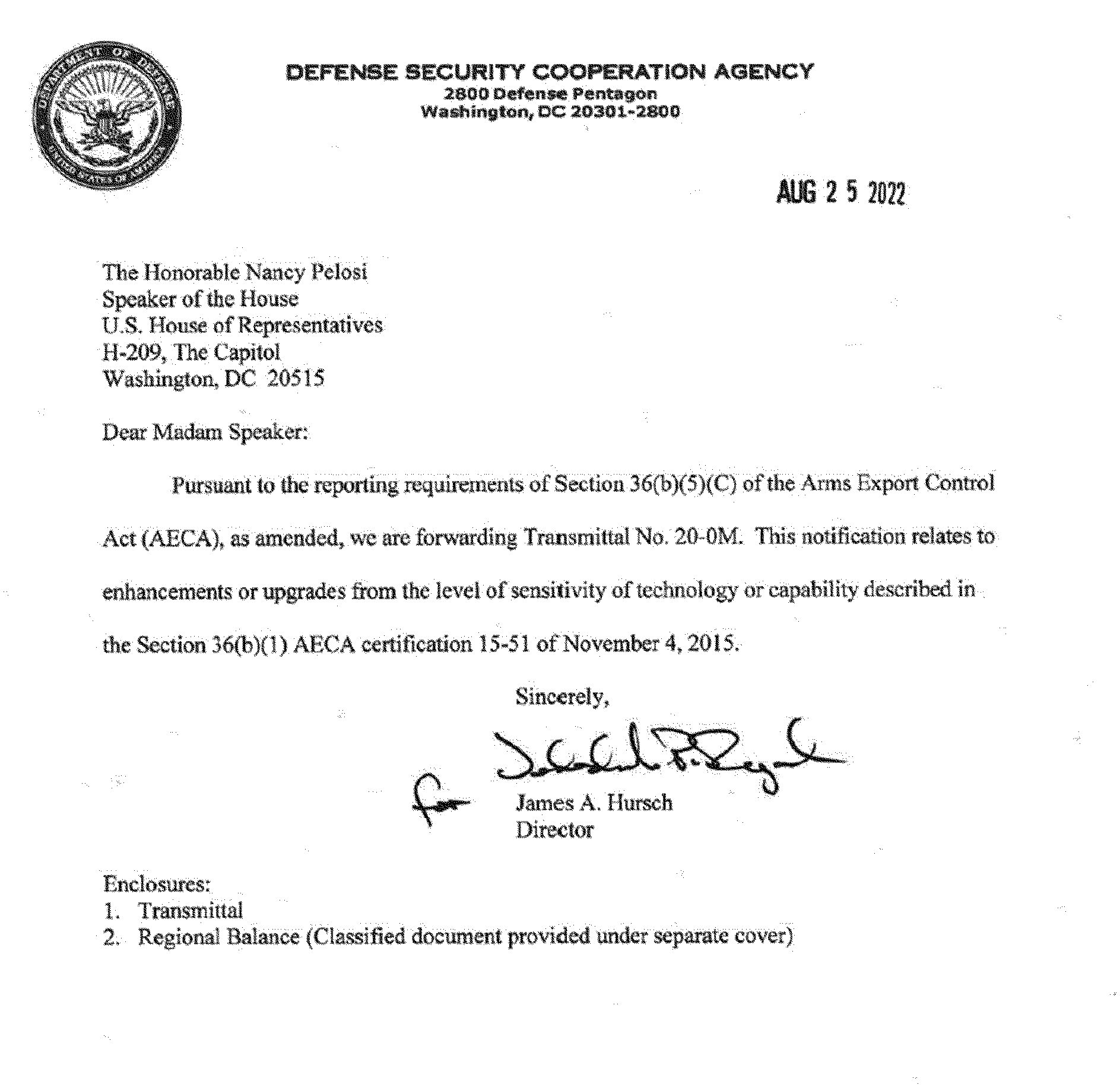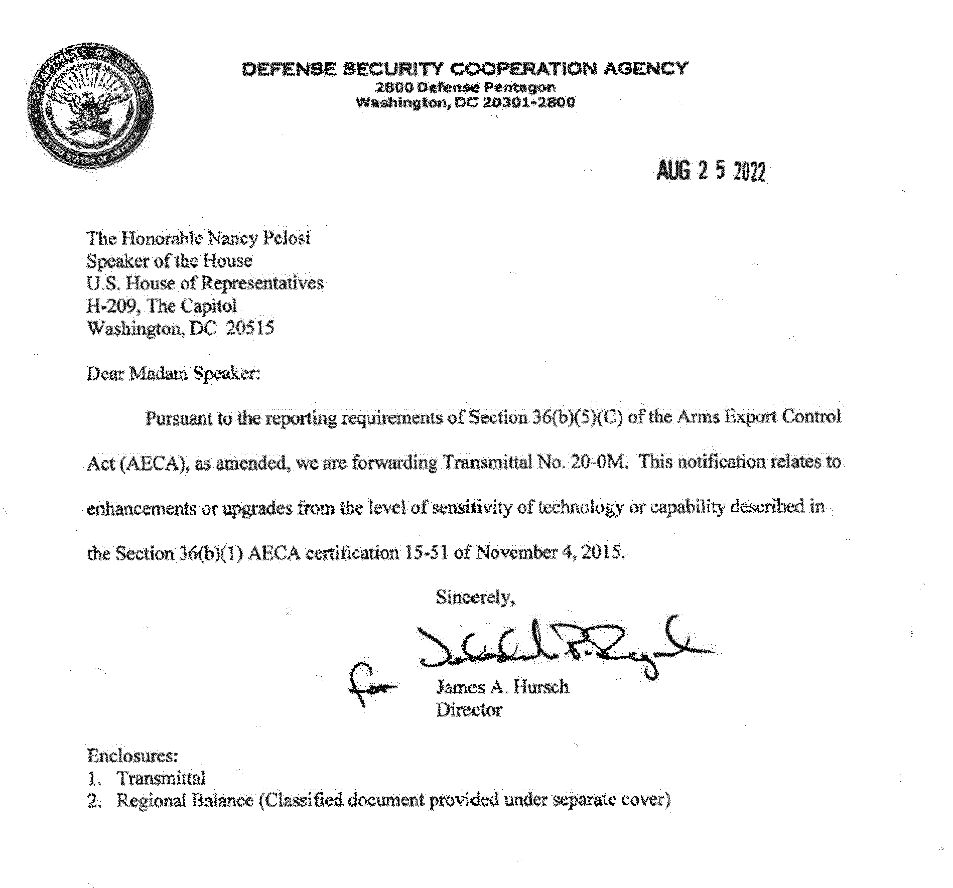 On August 25, 2022, Congress was notified by congressional certification transmittal number 20-0M of the inclusion of the following additional MDE items and support items: eight-hundred (800) GBU-56V1 Laser Joint Direct Attack Munitions (LJDAM) (consisting of eight-hundred (800) KMU-556 tail kits; eight-hundred (800) DSU-40 Laser Sensors, and eight-hundred (800) MK-84 bombs); two-hundred (200) GBU-56V3 Laser JDAMs (consisting of two-hundred (200) KMU-557 tail kits; two-hundred (200) DSU-42 Laser Sensors, and two-hundred (200) BLU-109 bombs; three-thousand (3,000) FMU-139 fuzes; and associated munitions support items. The total cost of the new MDE articles was $69 million and did not result in a net increase in the total cost of MDE. The total case value remained $380 million.