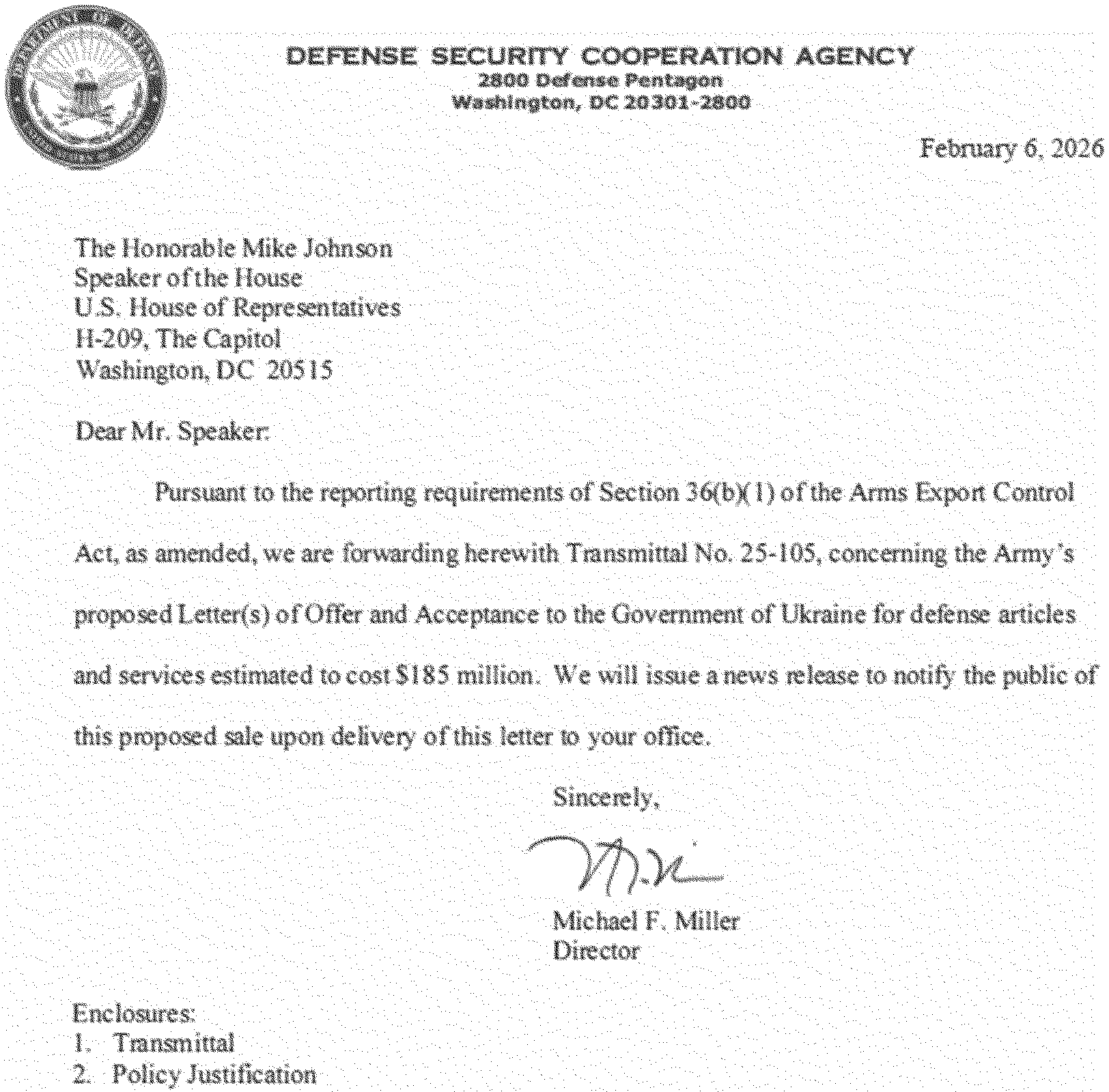 The Defense Security Cooperation Agency published the unclassified text of an arms sales notification (Transmittal 25-105) for a proposed sale to Ukraine. The notification fulfills Section 155 of Public Law 104-164 requirements for Congressional notification of foreign military sales exceeding $14 million. The sale consists of Class IX spare parts valued at $185 million, funded through Foreign Military Financing, with no Major Defense Equipment included.\n\nAffected parties include the Government of Ukraine as the prospective purchaser, U.S. defense contractors as potential vendors, and Congressional committees as required reviewers under the Arms Export Control Act. This is a routine statutory notification; no compliance obligations are imposed on private parties beyond existing export control requirements.