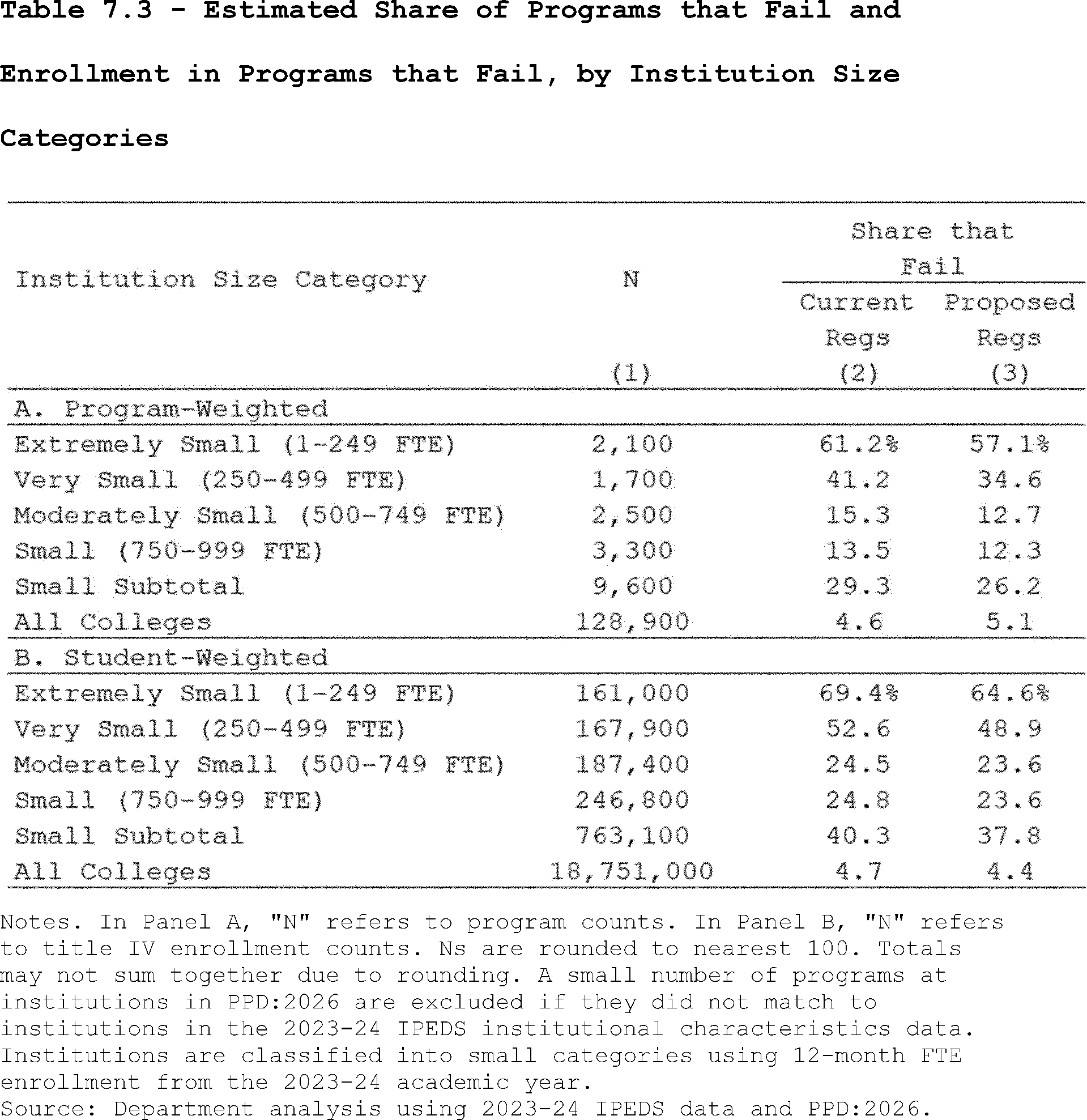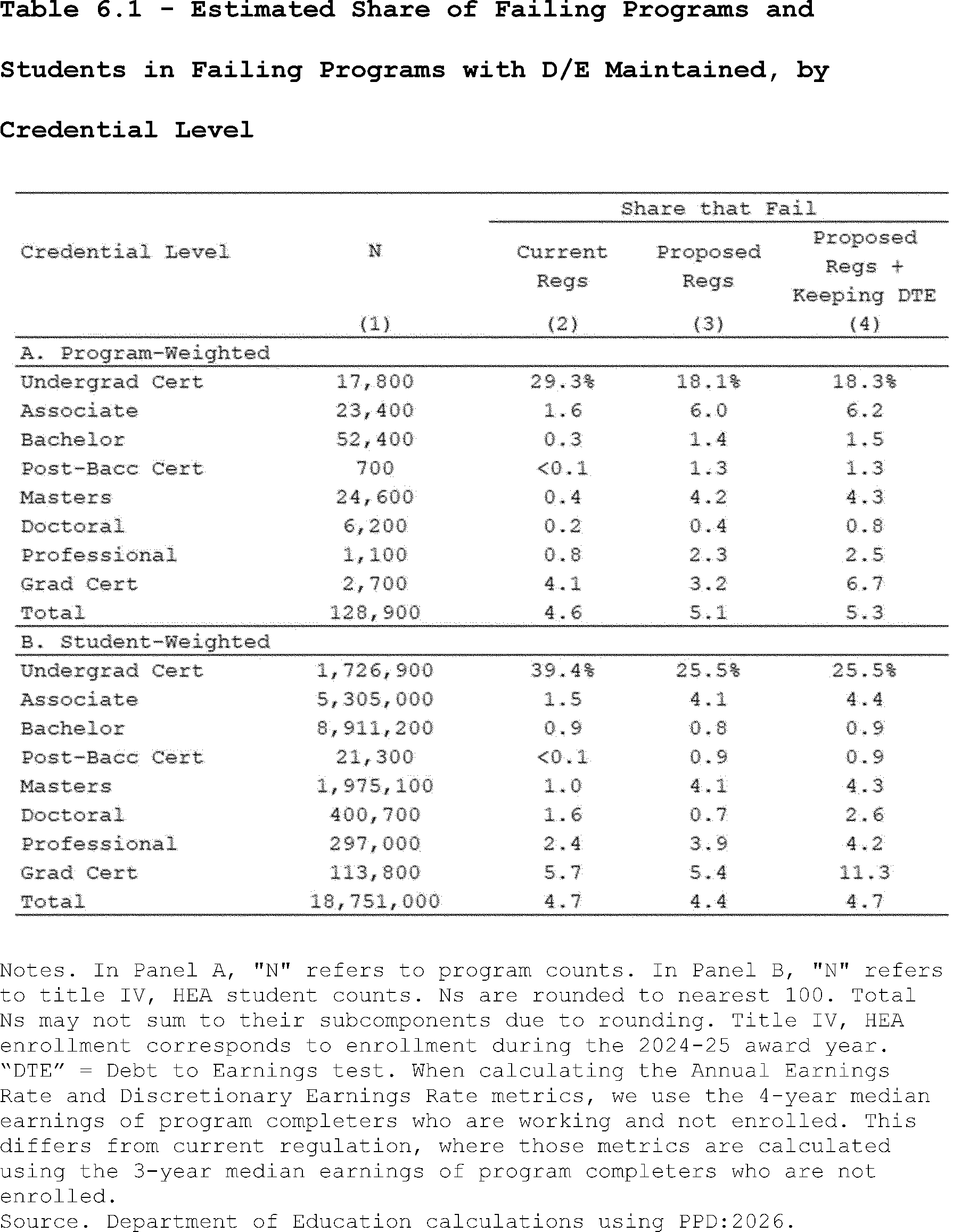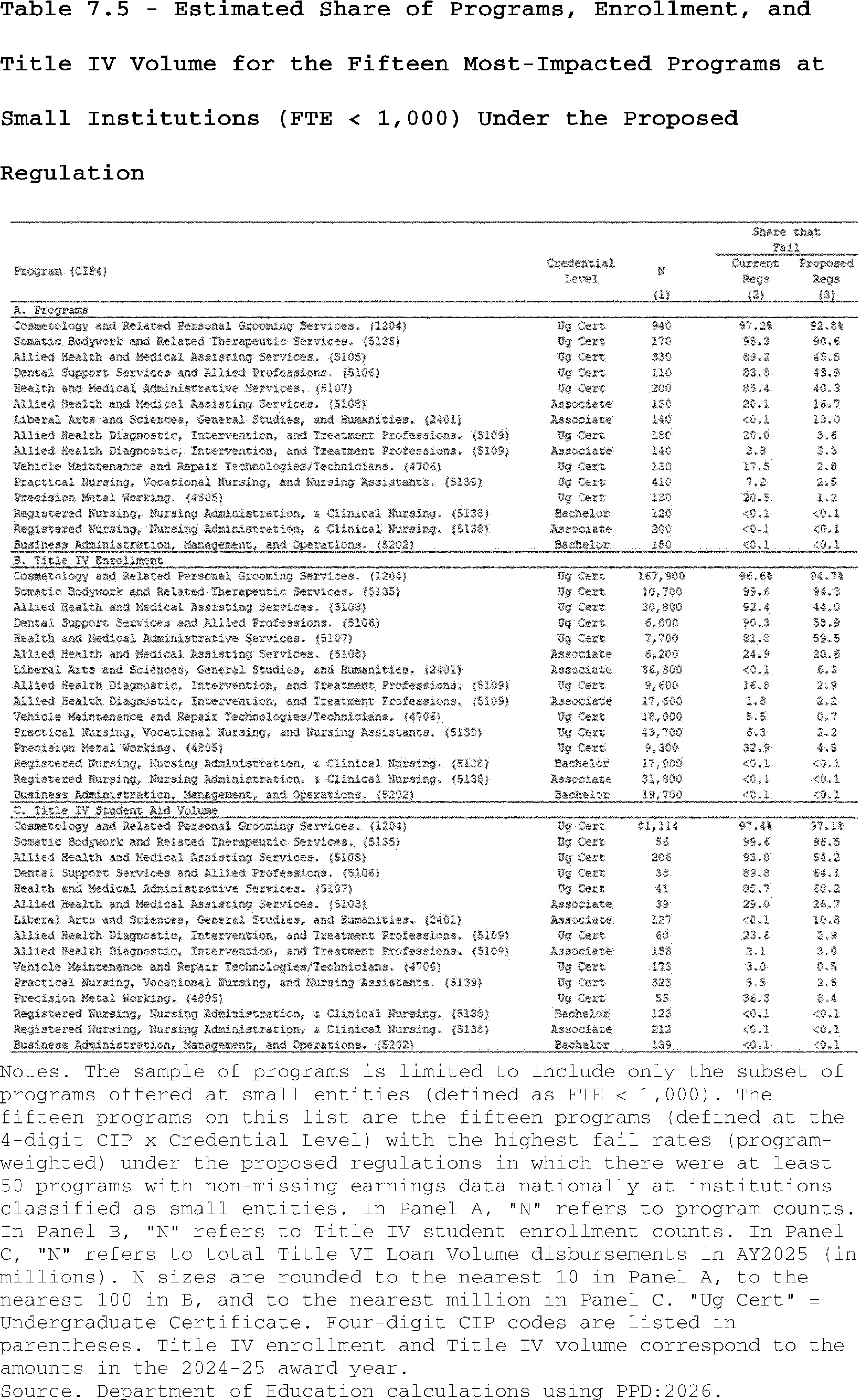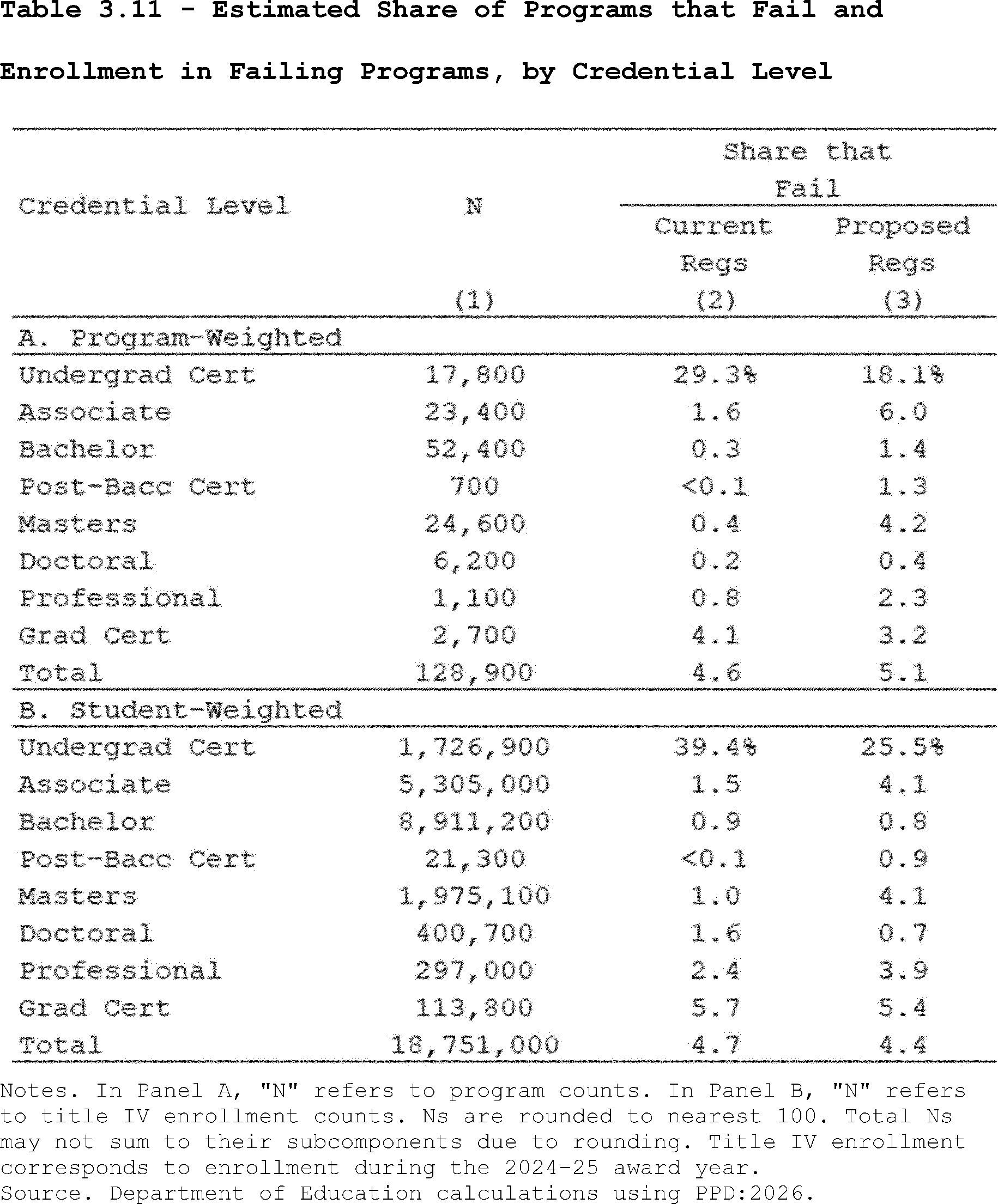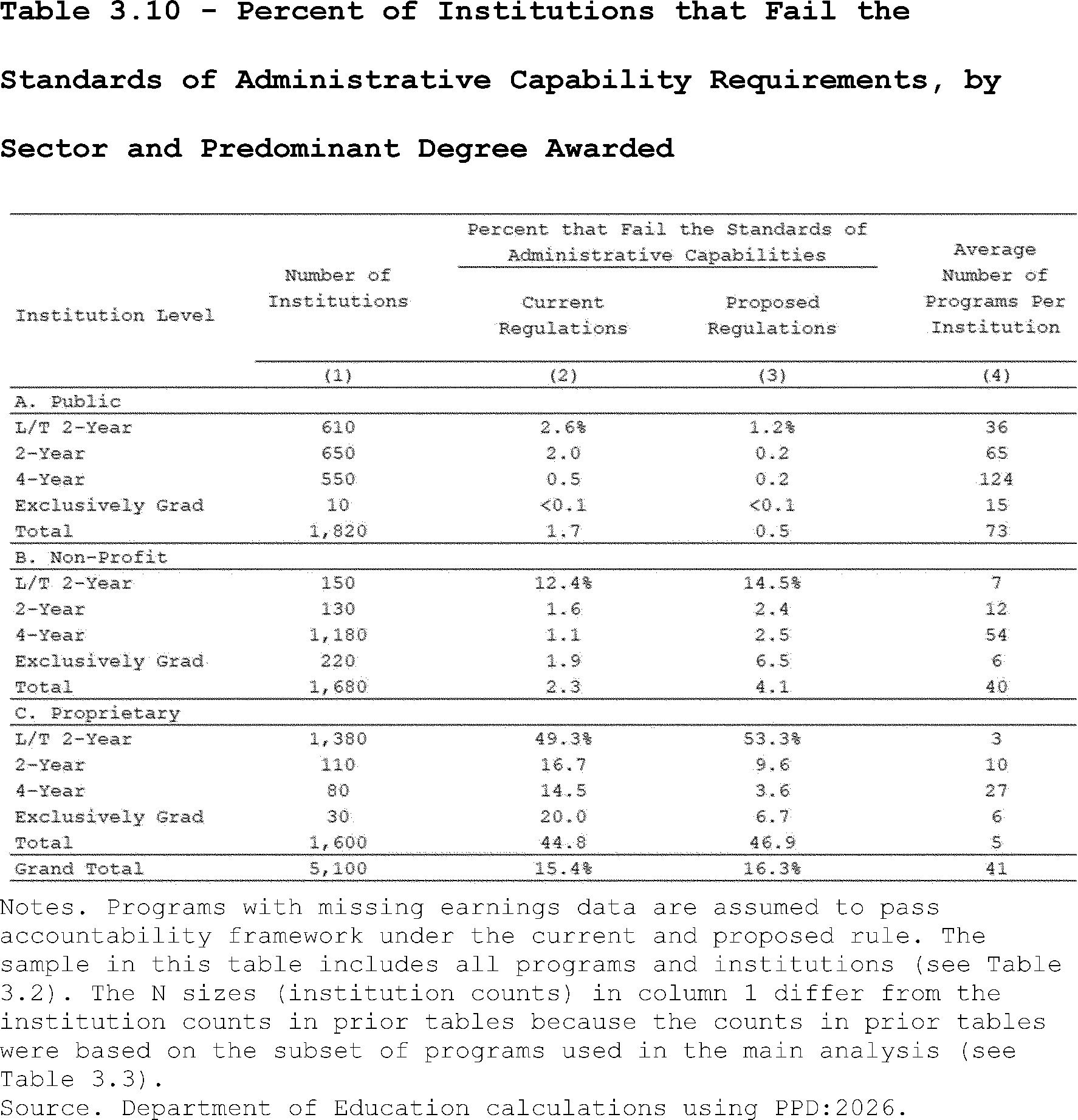 Our estimates may slightly overcount the share of programs that lose access to Pell Grants under the proposed regulation's revisions to the standards of administrative capabilities. This is because the revised standards in the proposed regulation apply to institutions after three years of failing the revised earnings premium metric. However, as described above, we do not observe multiple, consecutive years of program-level earnings data in PPD:2026. Thus, our estimates may slightly overcount the share of programs that are impacted by the proposed regulation's revisions to the standards of administrative capabilities since we assume they fail this standard after failing the accountability framework in a single year.