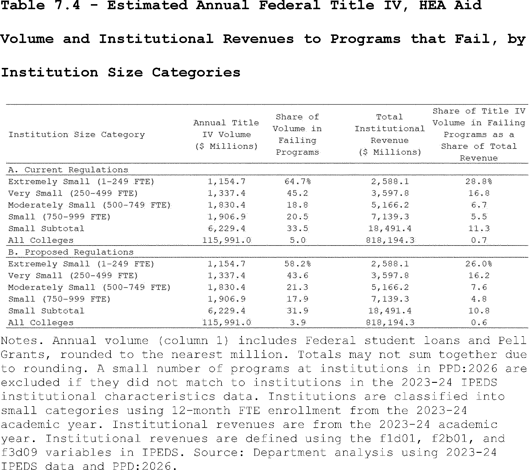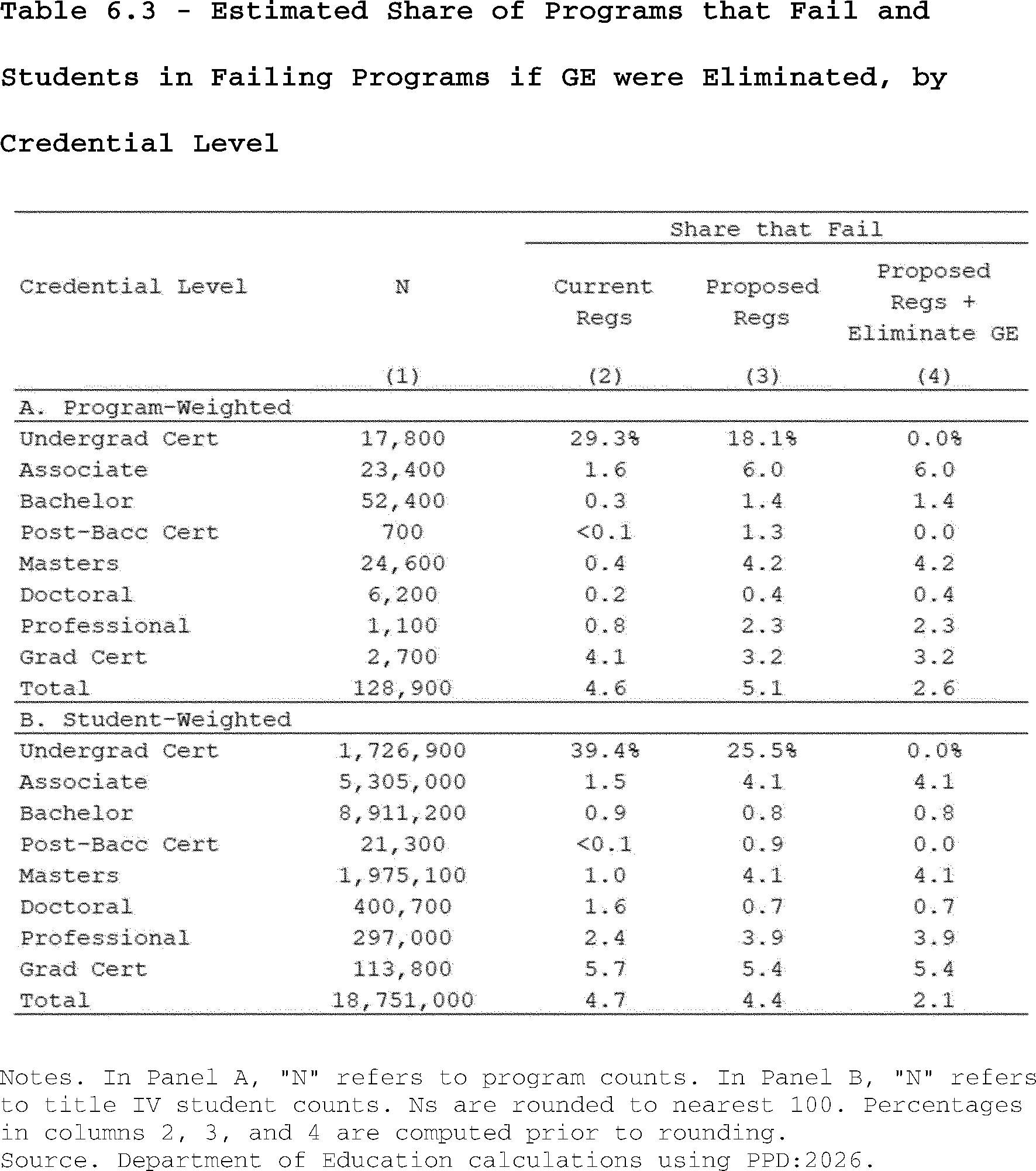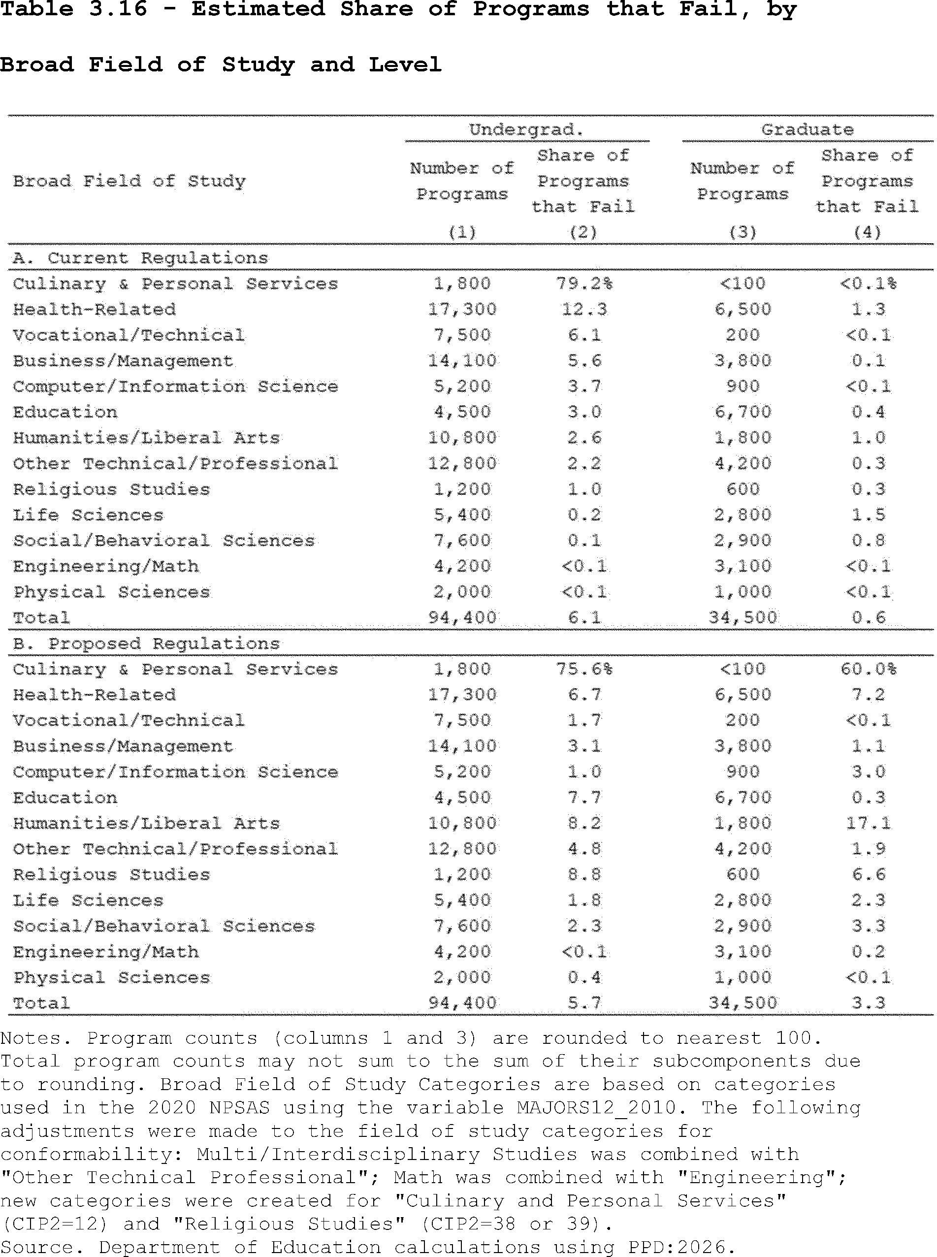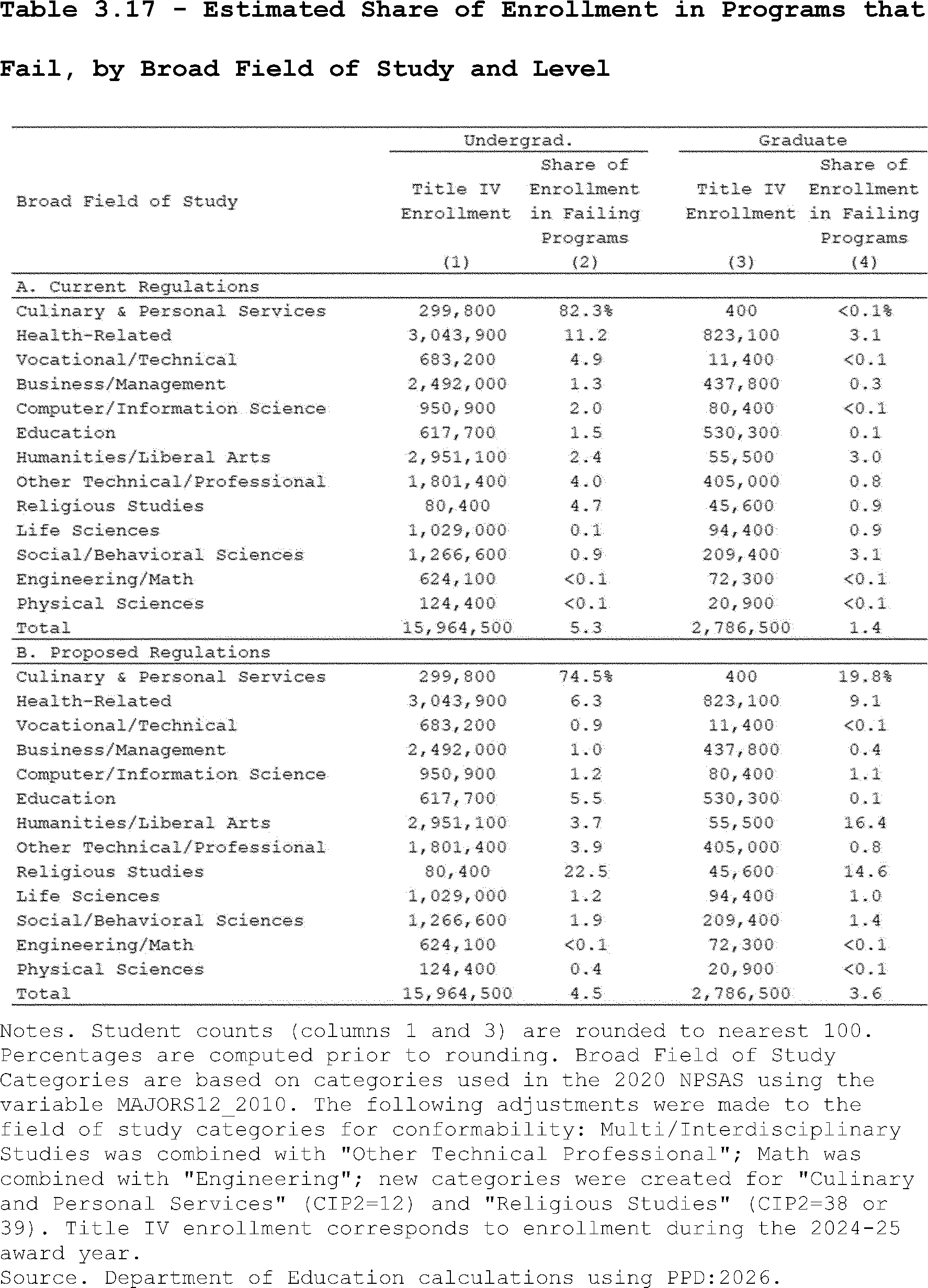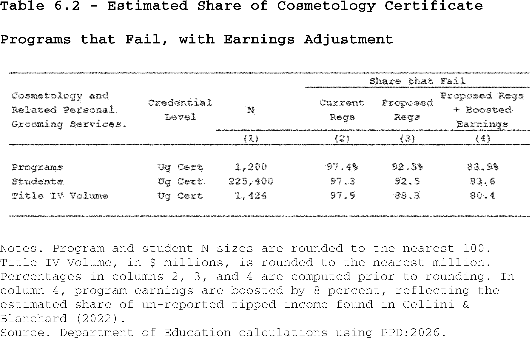 Our estimates may slightly overcount the share of programs that lose access to Pell Grants under the proposed regulation's revisions to the standards of administrative capabilities. This is because the revised standards in the proposed regulation apply to institutions after three years of failing the revised earnings premium metric. However, as described above, we do not observe multiple, consecutive years of program-level earnings data in PPD:2026. Thus, our estimates may slightly overcount the share of programs that are impacted by the proposed regulation's revisions to the standards of administrative capabilities since we assume they fail this standard after failing the accountability framework in a single year.