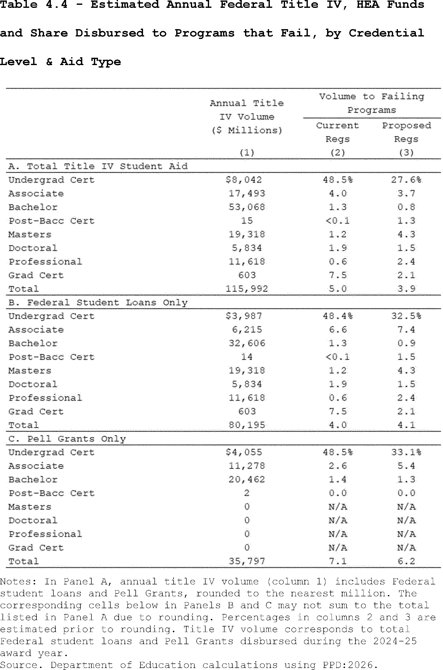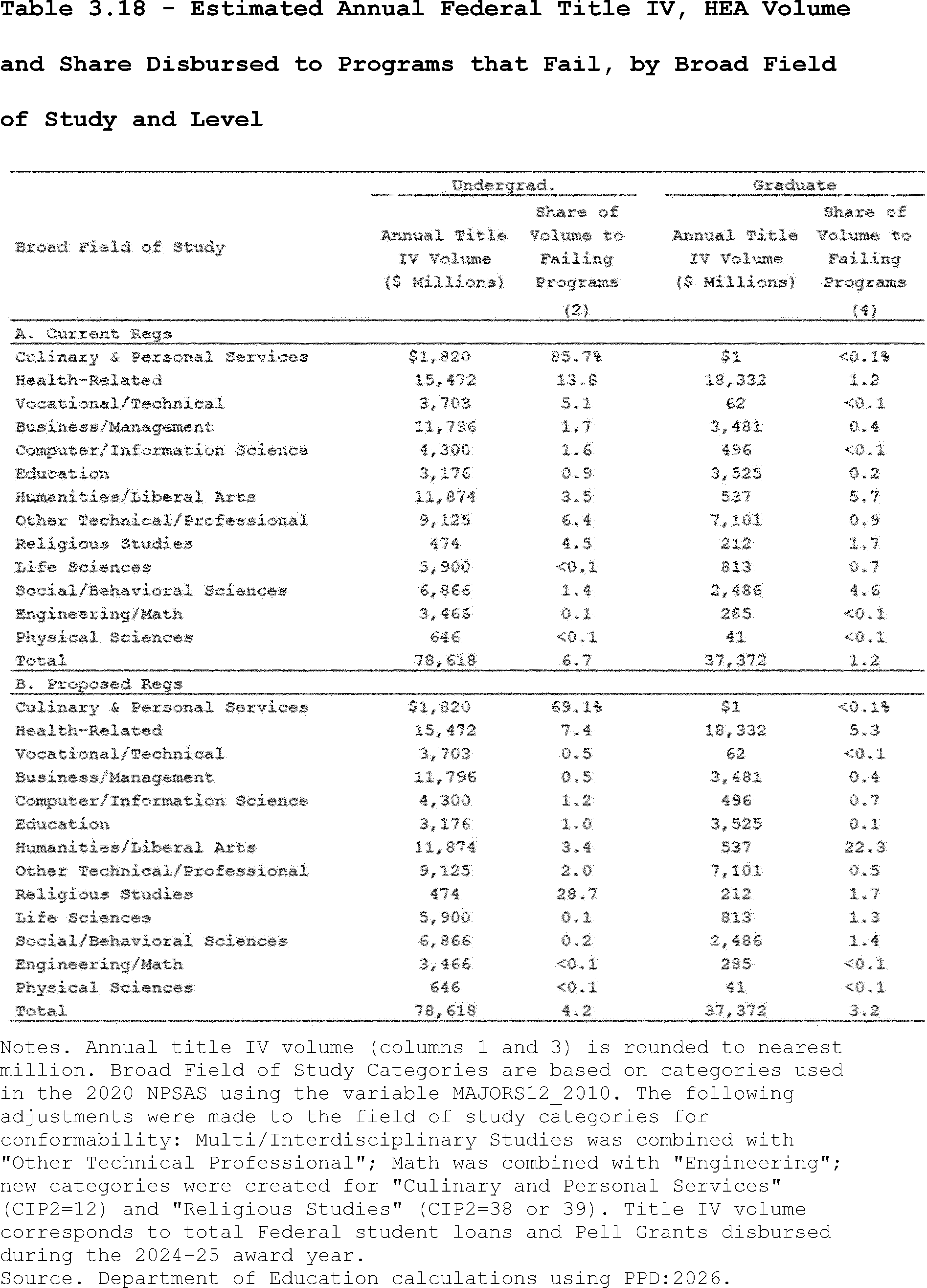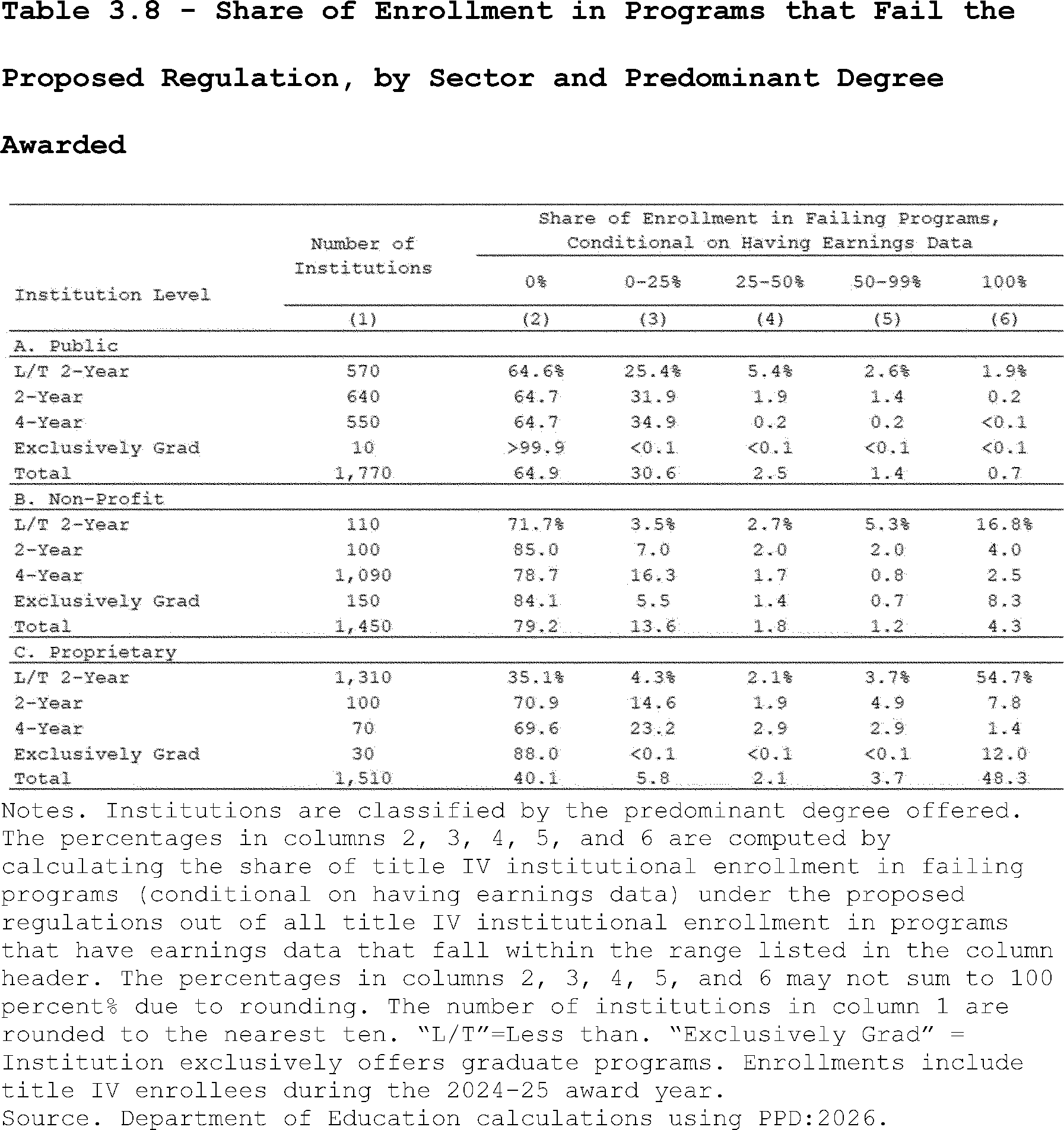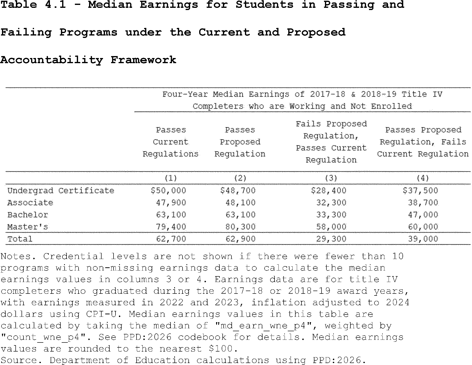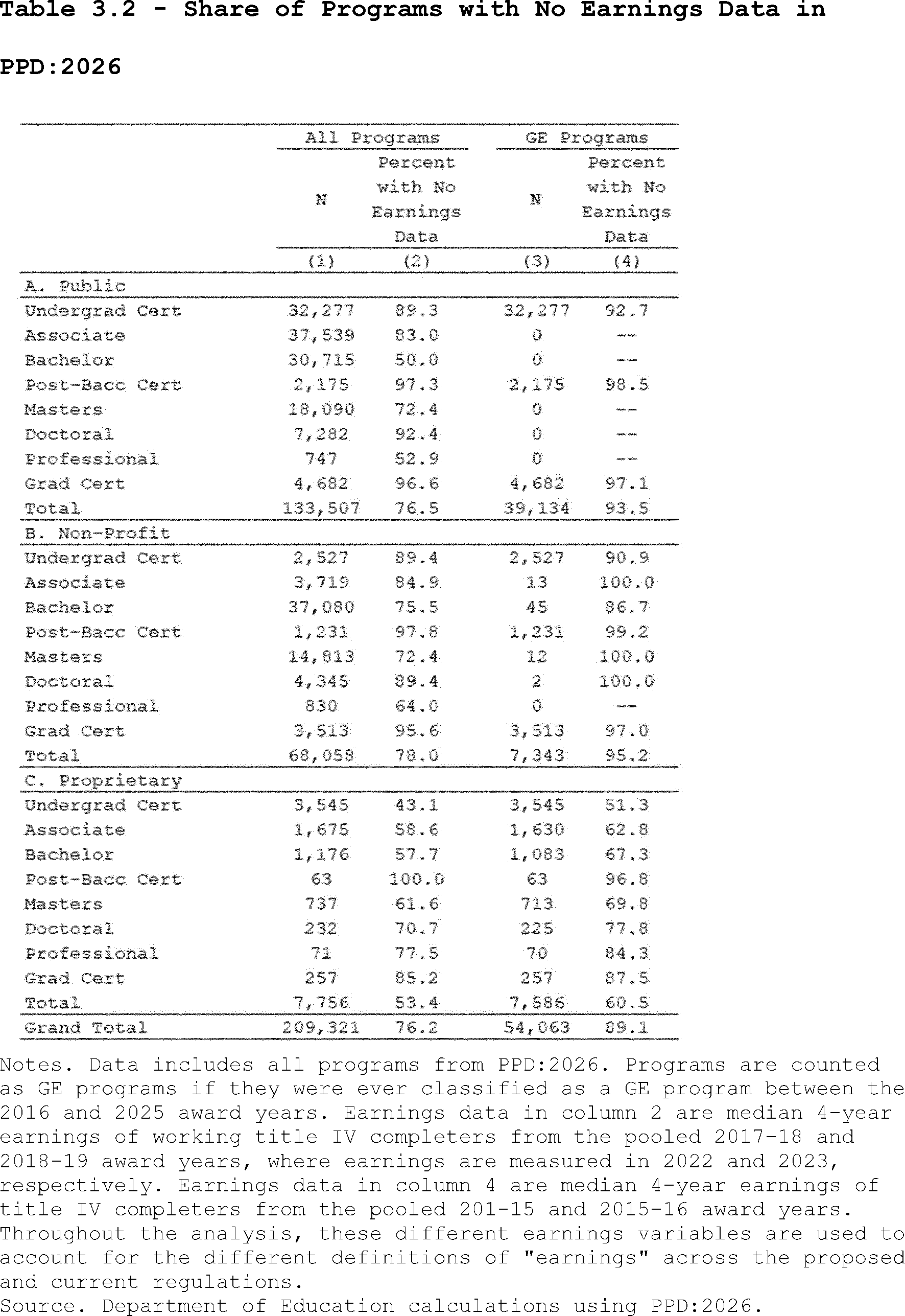Our estimates may slightly overcount the share of programs that lose access to Pell Grants under the proposed regulation's revisions to the standards of administrative capabilities. This is because the revised standards in the proposed regulation apply to institutions after three years of failing the revised earnings premium metric. However, as described above, we do not observe multiple, consecutive years of program-level earnings data in PPD:2026. Thus, our estimates may slightly overcount the share of programs that are impacted by the proposed regulation's revisions to the standards of administrative capabilities since we assume they fail this standard after failing the accountability framework in a single year.