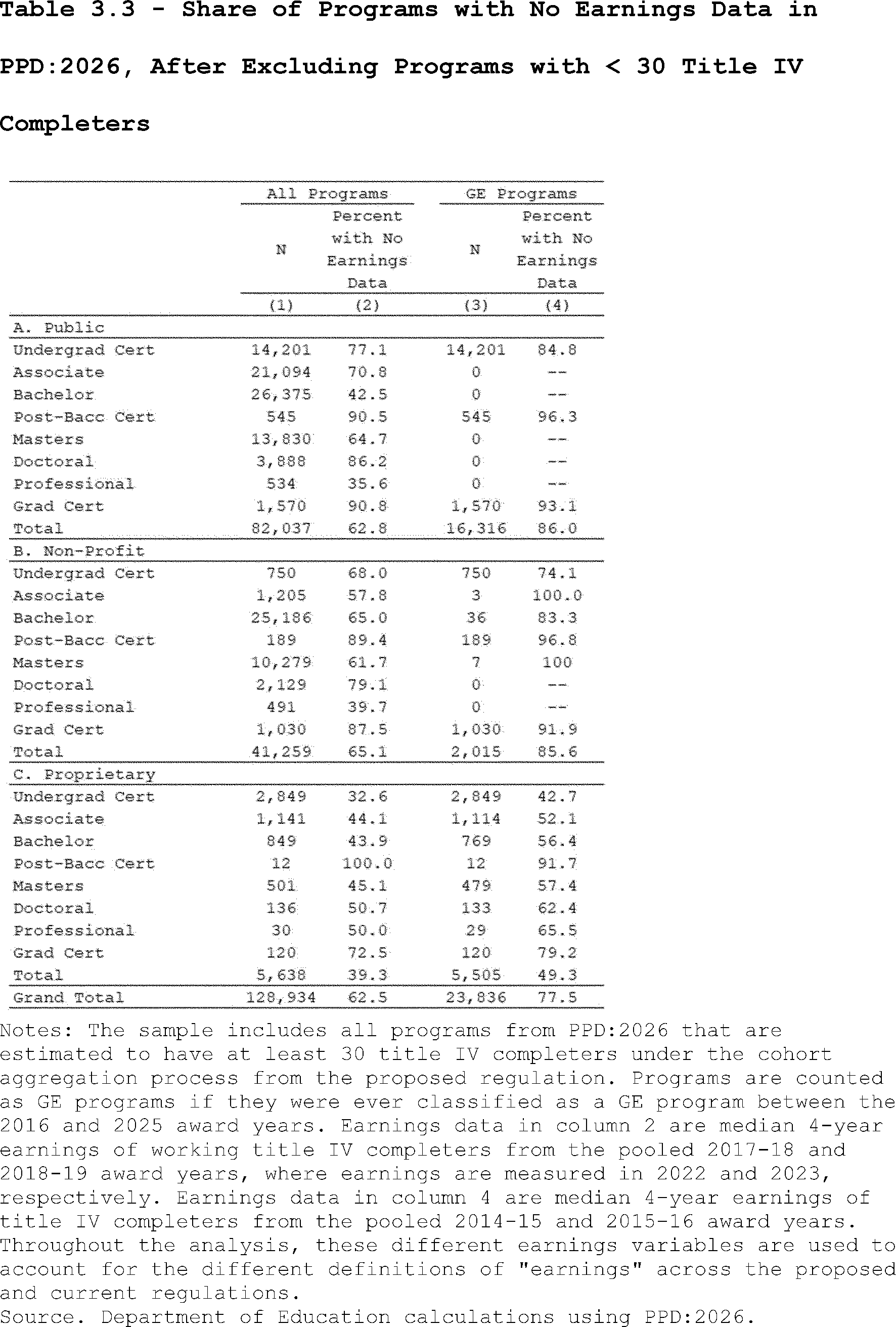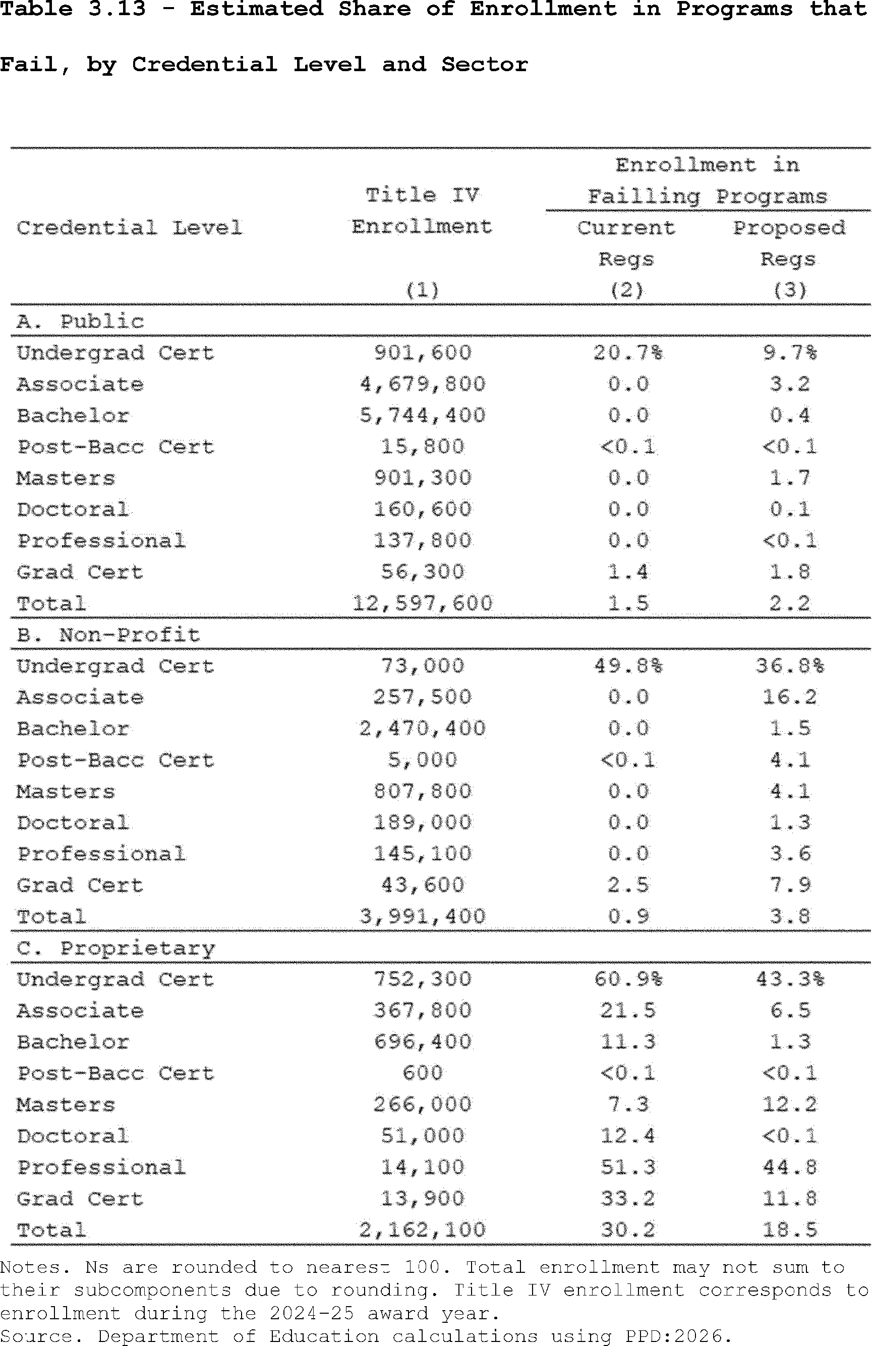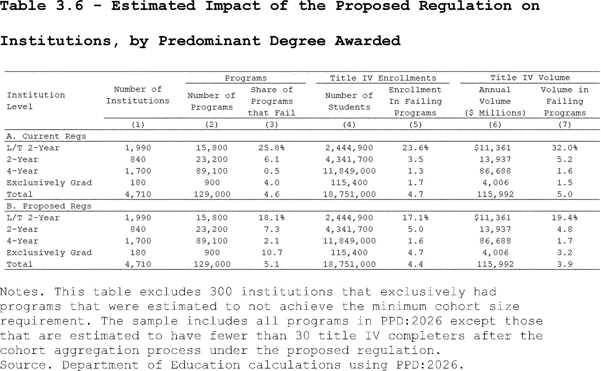 Estimates for the current regulation are based on enrollments in GE programs with non-missing earnings data, while estimates for the proposed regulation are based on enrollments in all types of programs with non-missing earnings data.