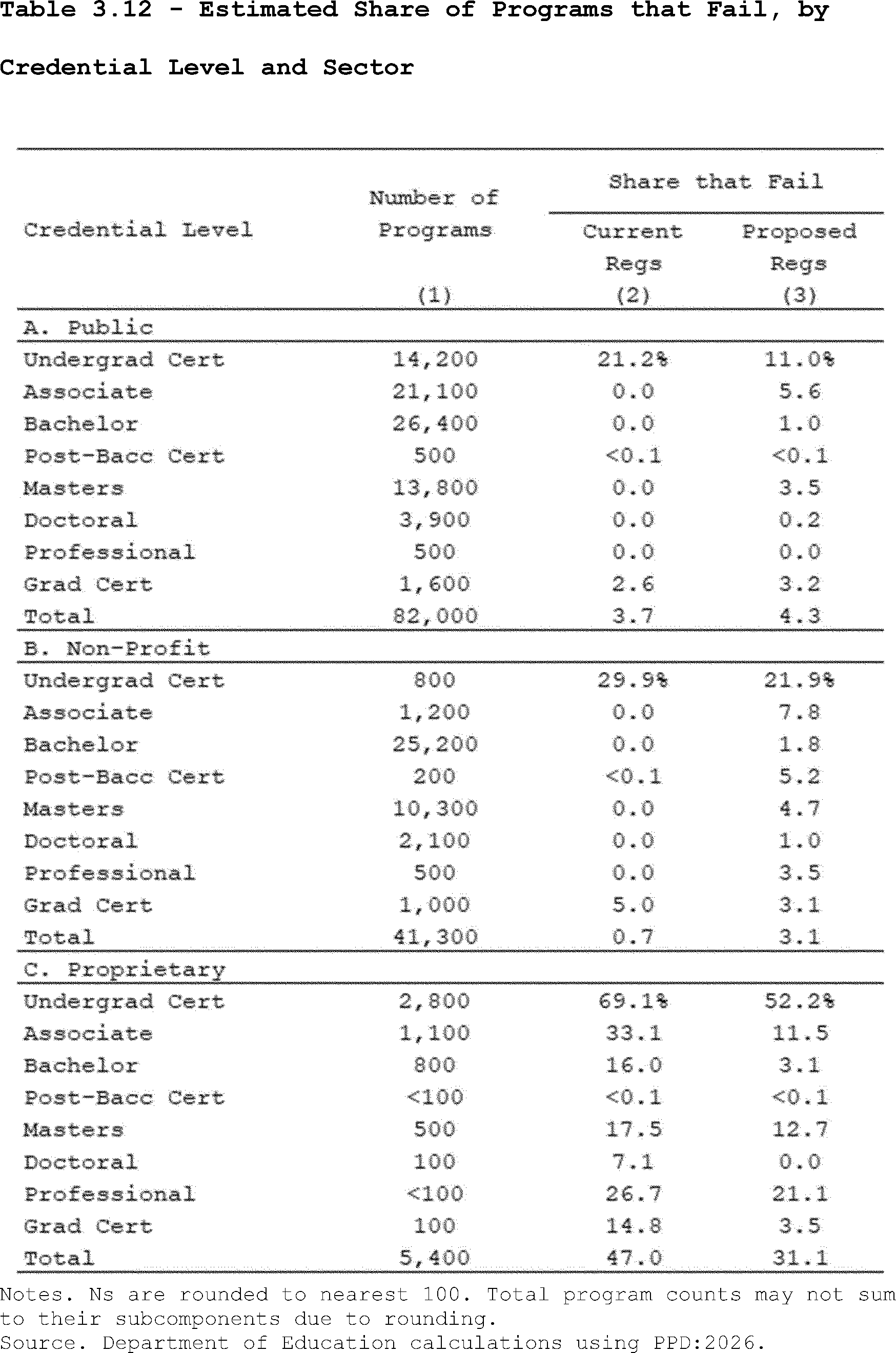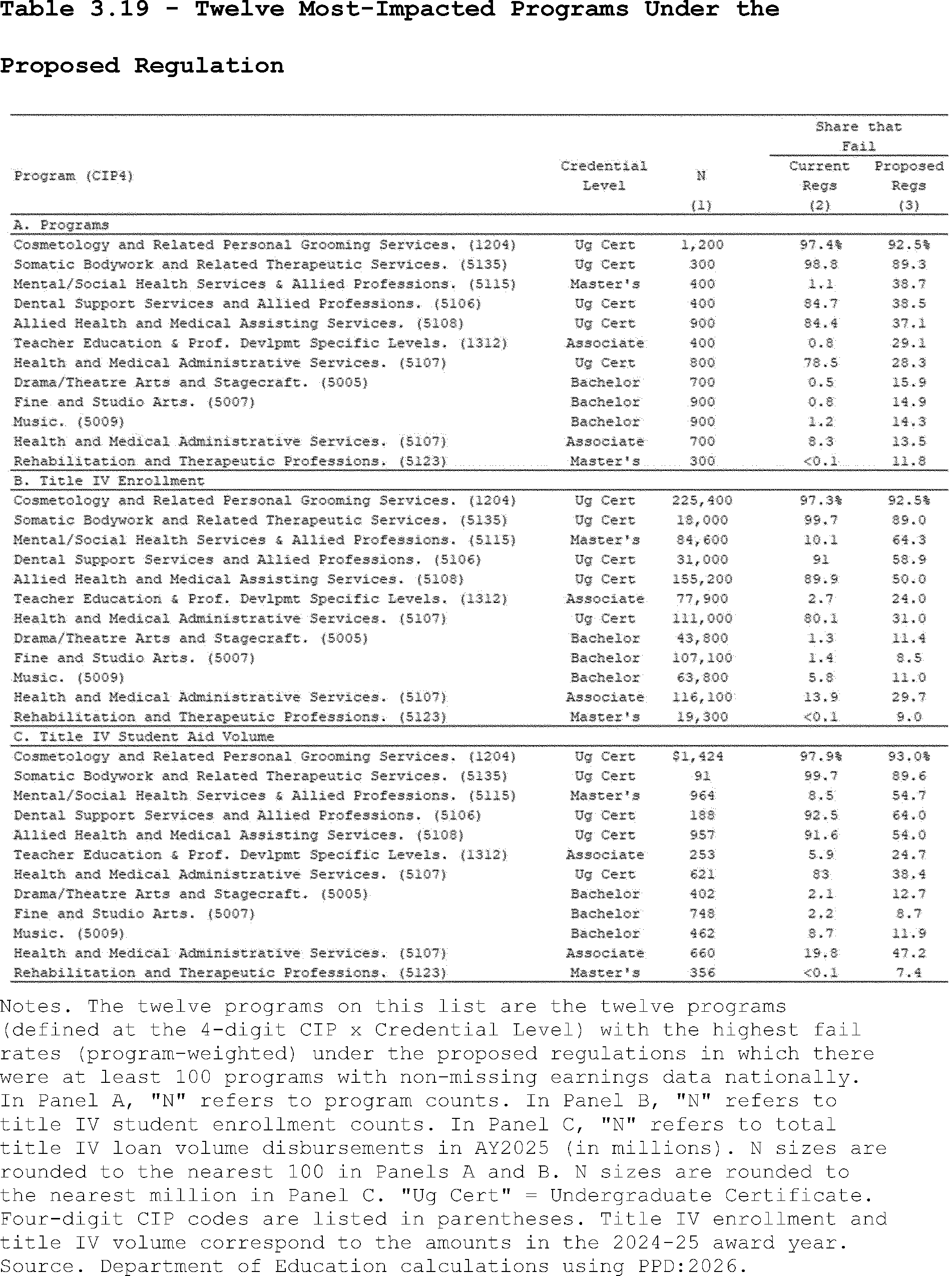 The Department included the twelve programs (defined by the unique combination of cip4 and credlev) that had the highest share of programs estimated to fail under the proposed regulations. Programs where there were fewer than 100 observations with non-missing earnings data nationally were excluded from the ranking.