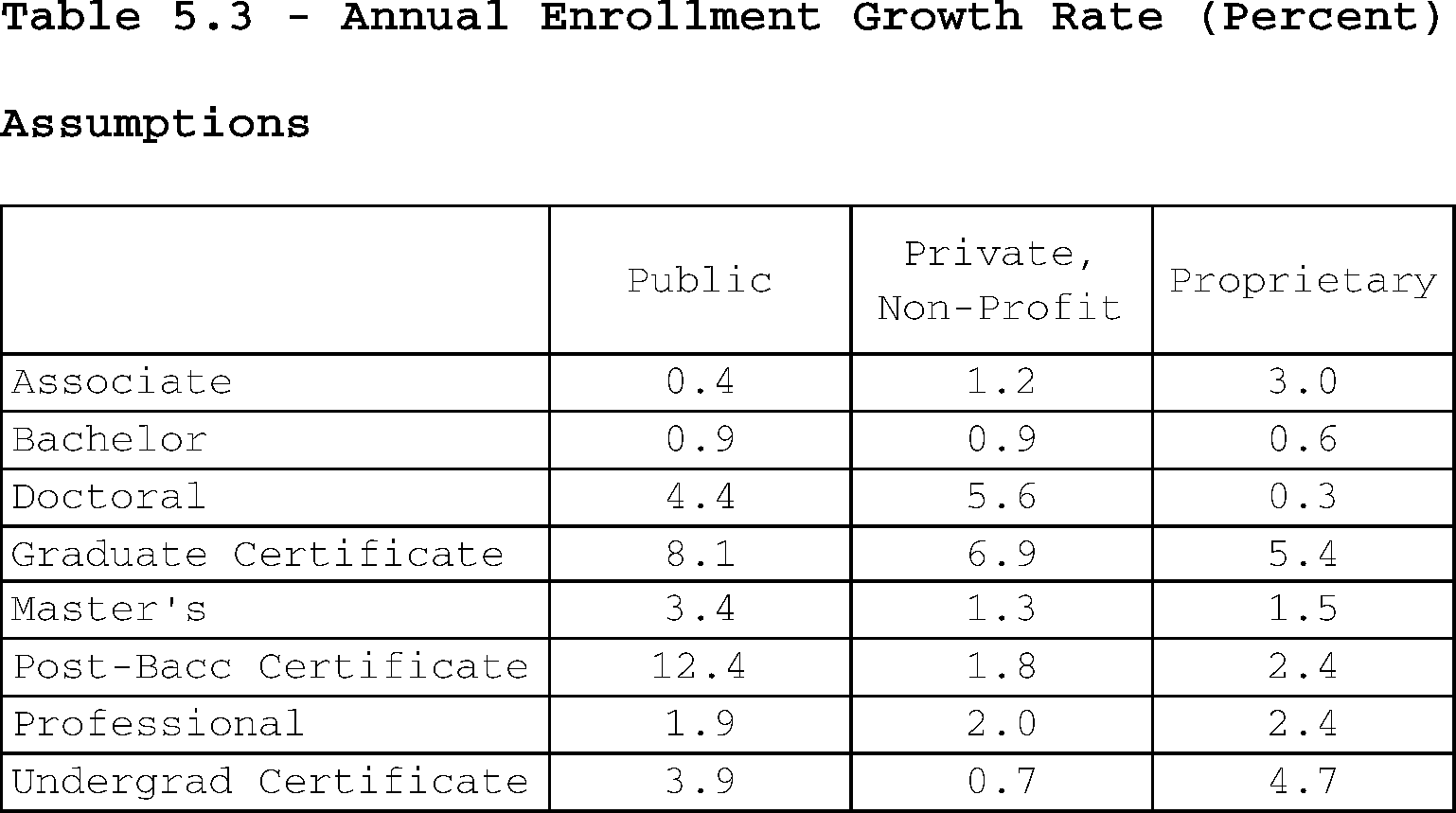 The number of programs in proprietary graduate certificate and proprietary professional degrees was too low to reliably compute a growth rate. Therefore, we assumed a rate equal to the overall proprietary rate of 2.4 percent.