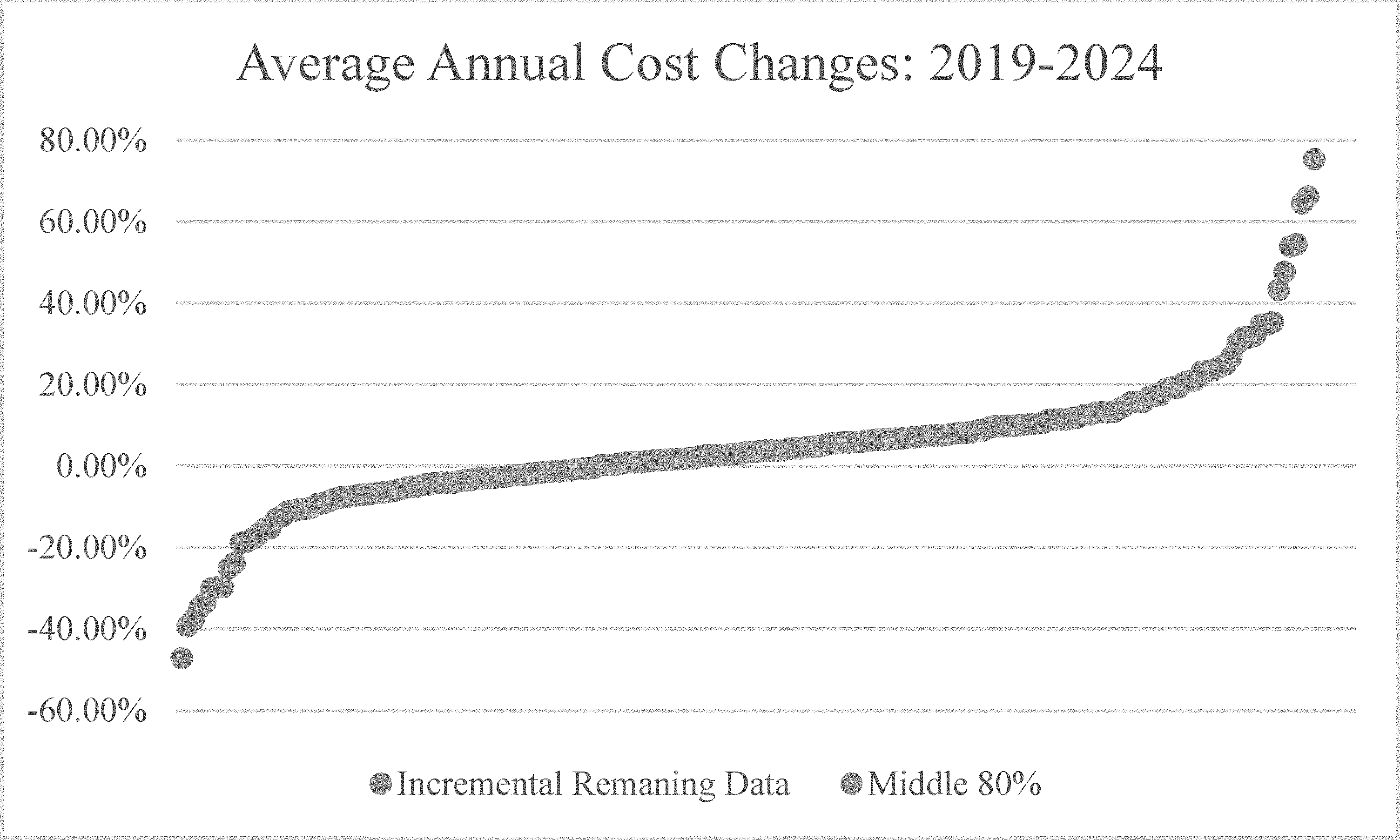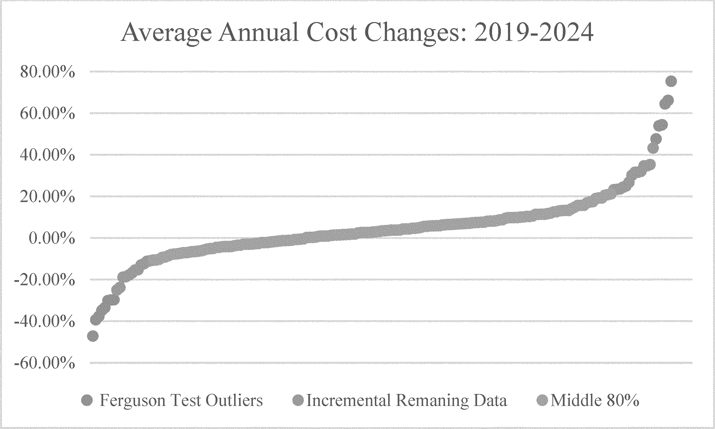 See, e.g., Five-Year Review of Oil Pipeline Index, 133 FERC ¶ 61,228, at PP 61-63 (2010) (explaining that data trimming to the middle 50 percent of pipelines is appropriate based on the record); Five-Year Rev. of the Oil Pipeline Index, 173 FERC ¶ 61,245, at PP 25-32 (2020) (explaining that it is preferable to consider additional data and trim to the middle 80 percent of pipelines because it more fully reflects the diversity of cost experiences based on the record).