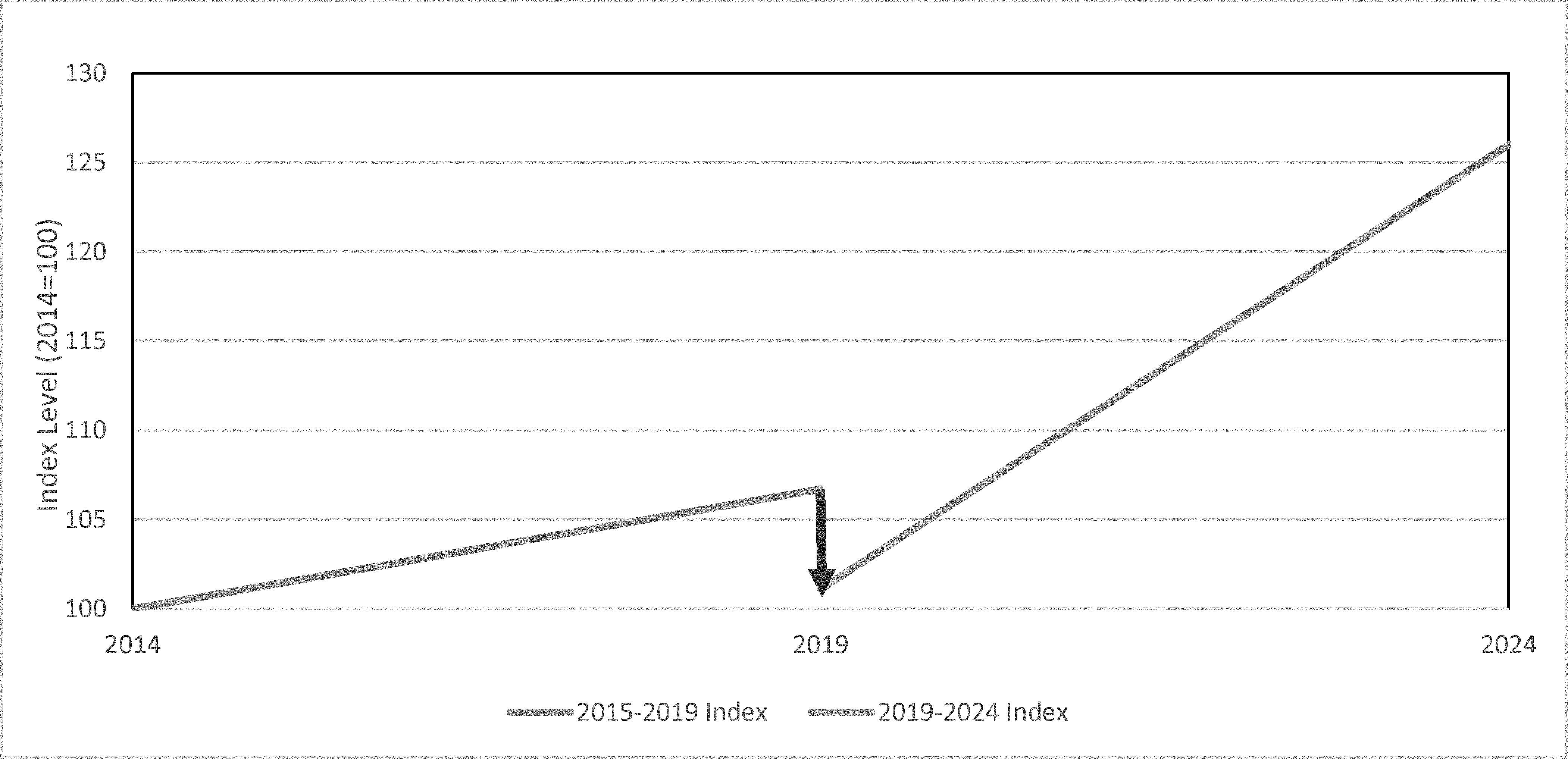 FERC, Oil Pipeline Index Indexing Methodology—Indices to be Used, https://www.ferc.gov/general-information-1/oil-pipeline-index. I derived this value simply by multiplying each of the authorized index values from July 1, 2021 through June 30, 2026. That inflation was particularly pronounced in the two years from July 1, 2022 through June 30, 2024, in which the annual index increases were 9.7% and 14.3%, respectively.