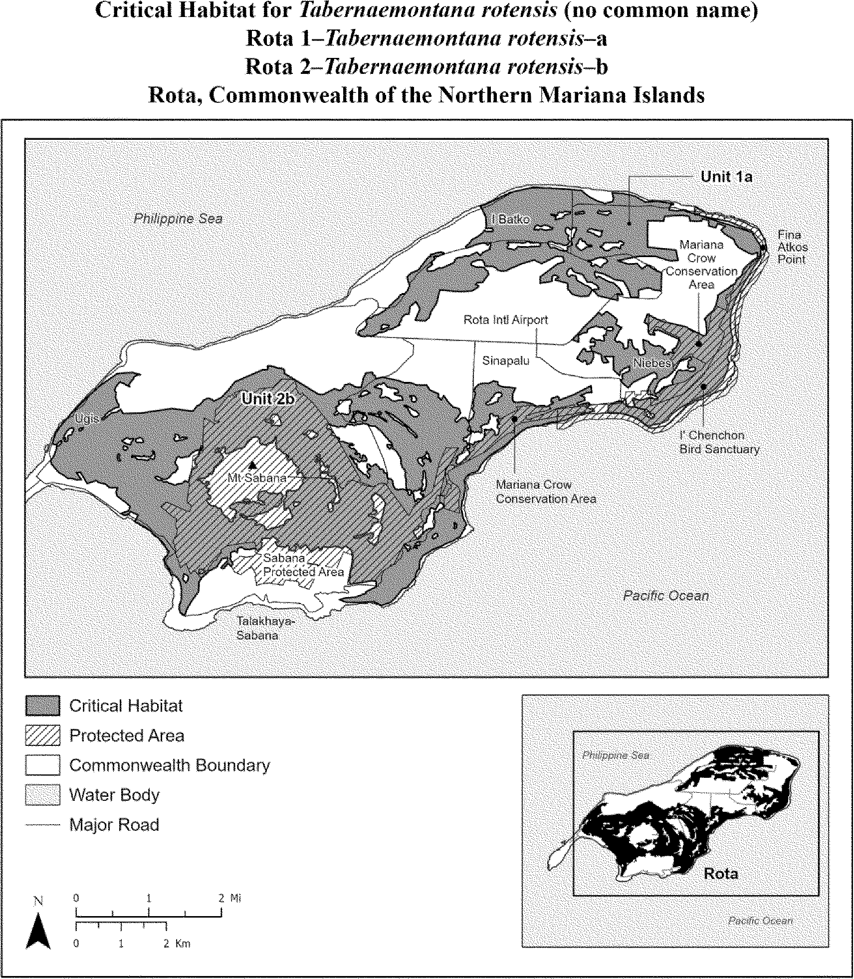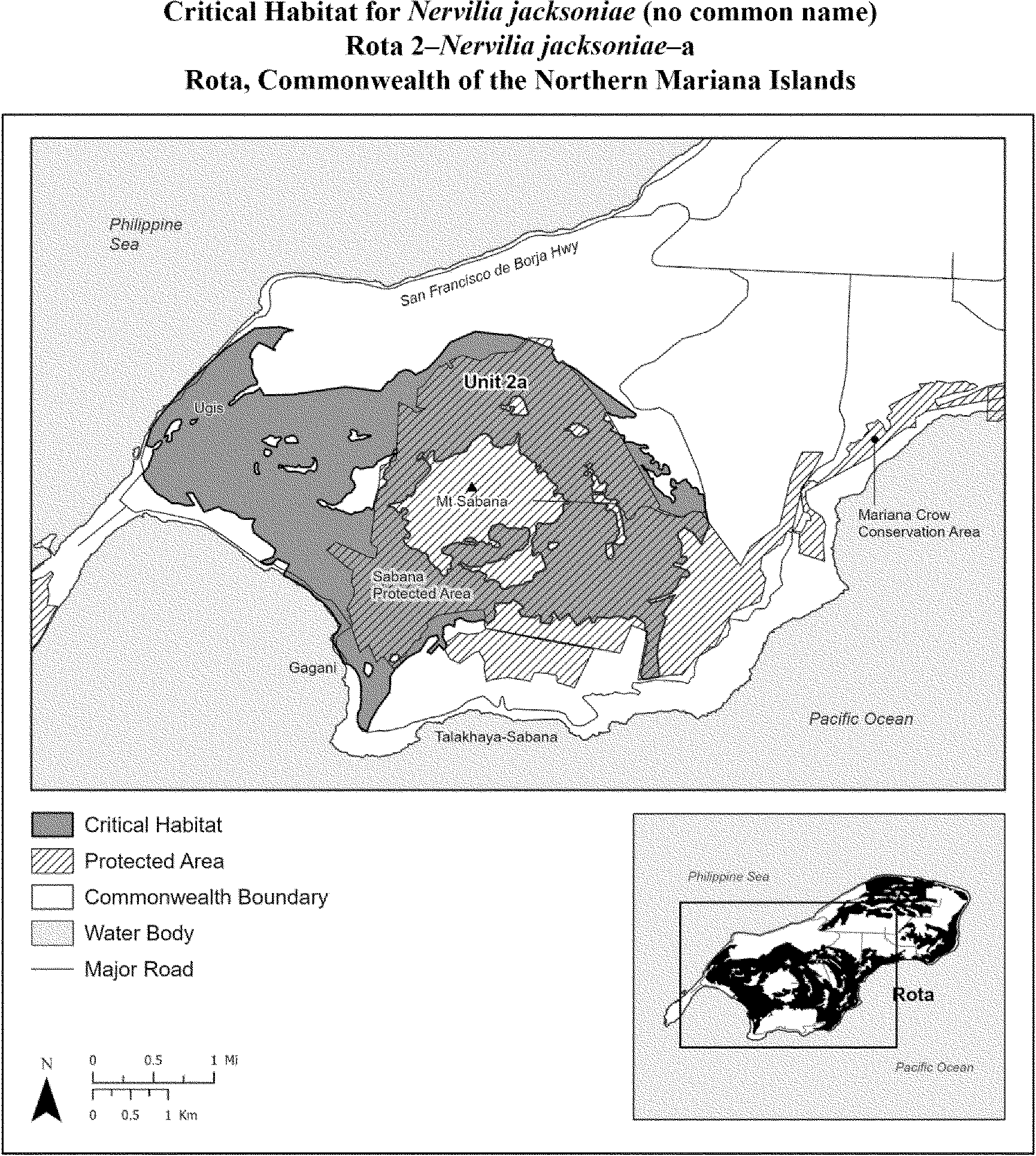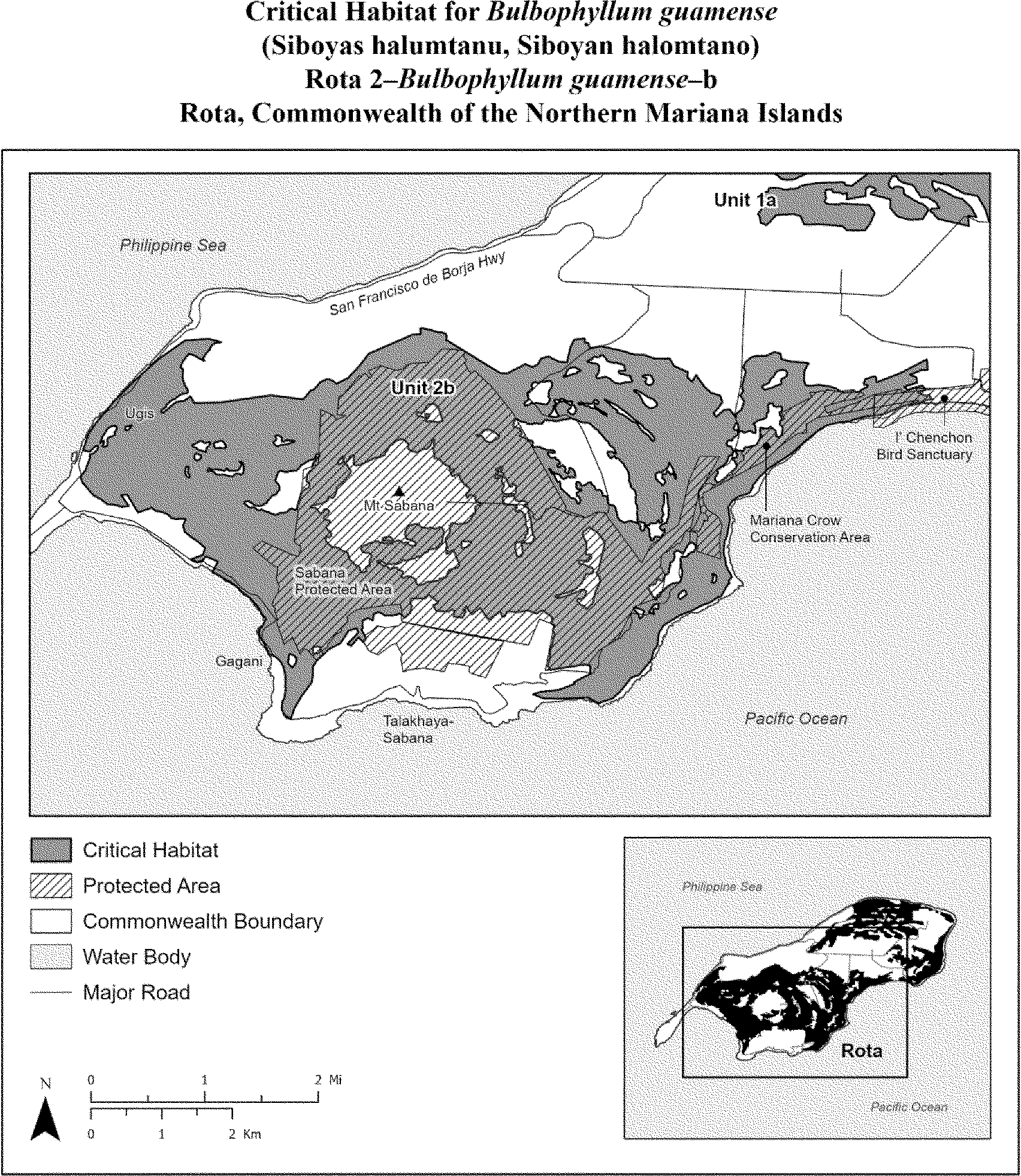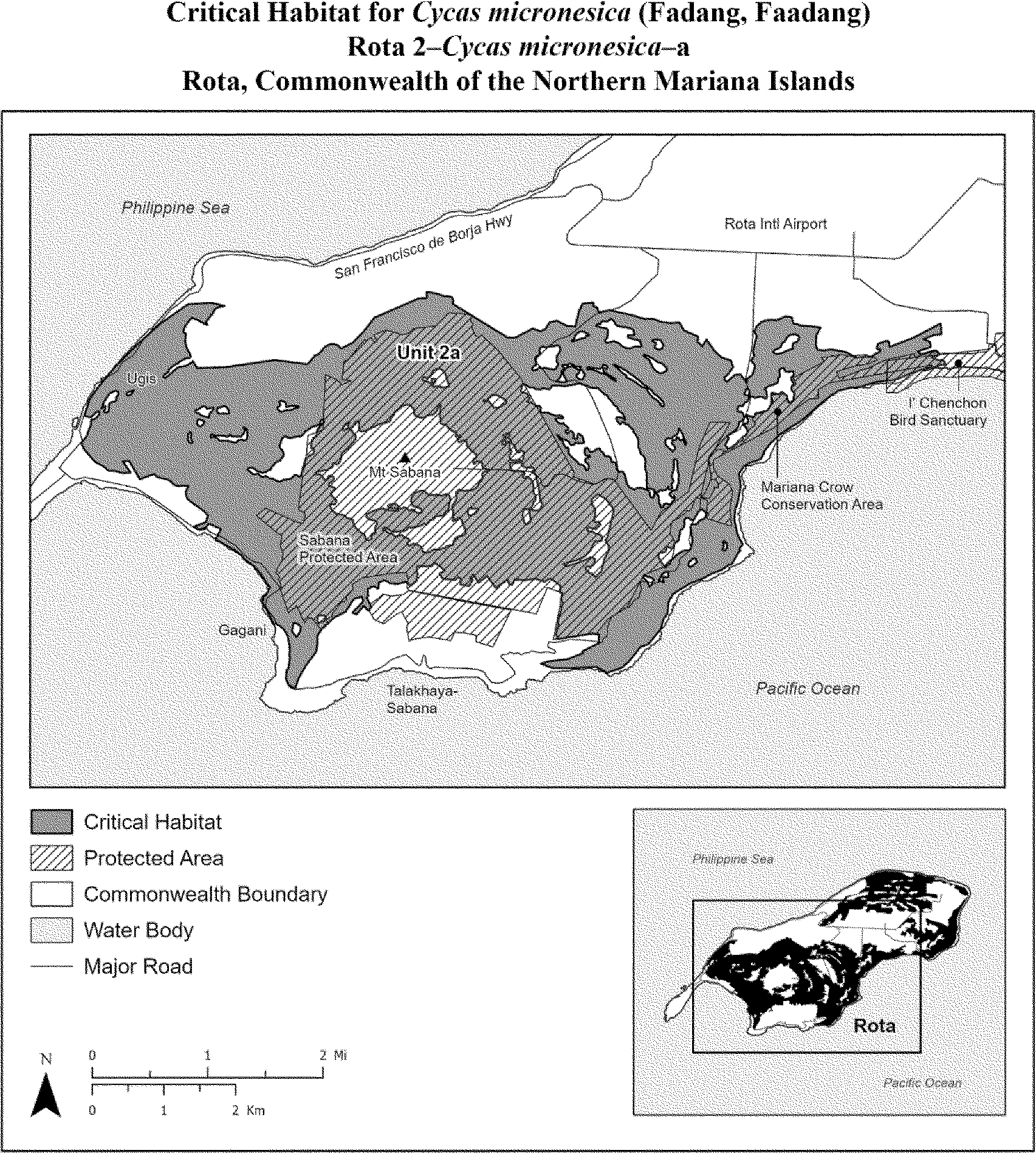 (A) The single critical habitat unit (2a) on the island of Rota consists of 6,875 ac (2,782 ha) and is composed of limestone forest in the south of the island. This unit extends south of the Rota International Airport, stretches east to the I'Chenchon Bird Sanctuary, and flanks the Talakhaya-Sabana watershed to the south (encompassing parts of the Sabana Protected Area, Mariana Crow Conservation Area, and I'Chenchon Bird Sanctuary) and east to Ugis. The unit does not include developed areas, grasslands, and Mt. Sabana. Land-ownership consists of 5,806 ac (2,350 ha) of land owned by the Commonwealth government, 1,039 ac (420 ha) in private ownership, and 30 ac (12 ha) that are uncategorized.