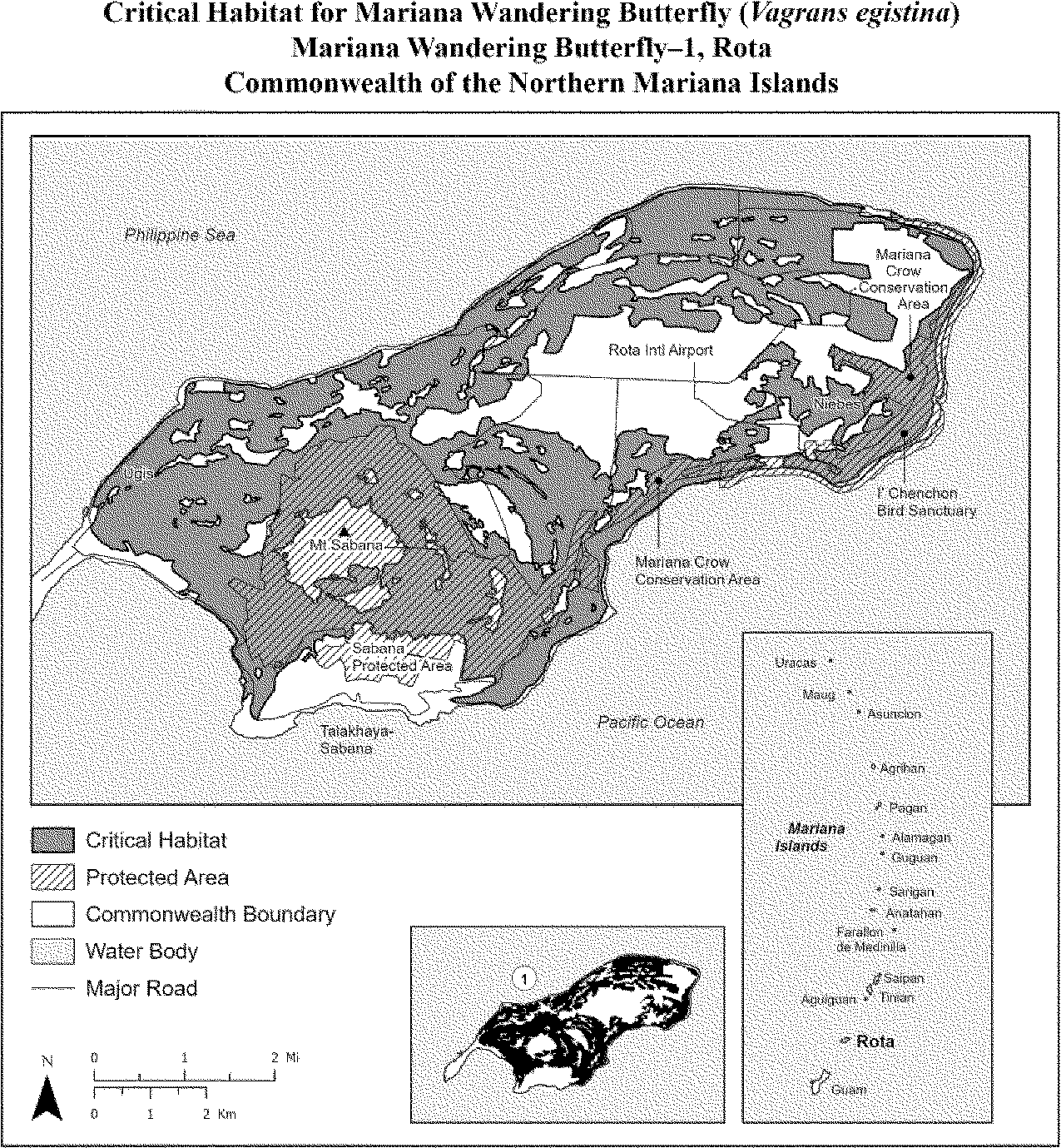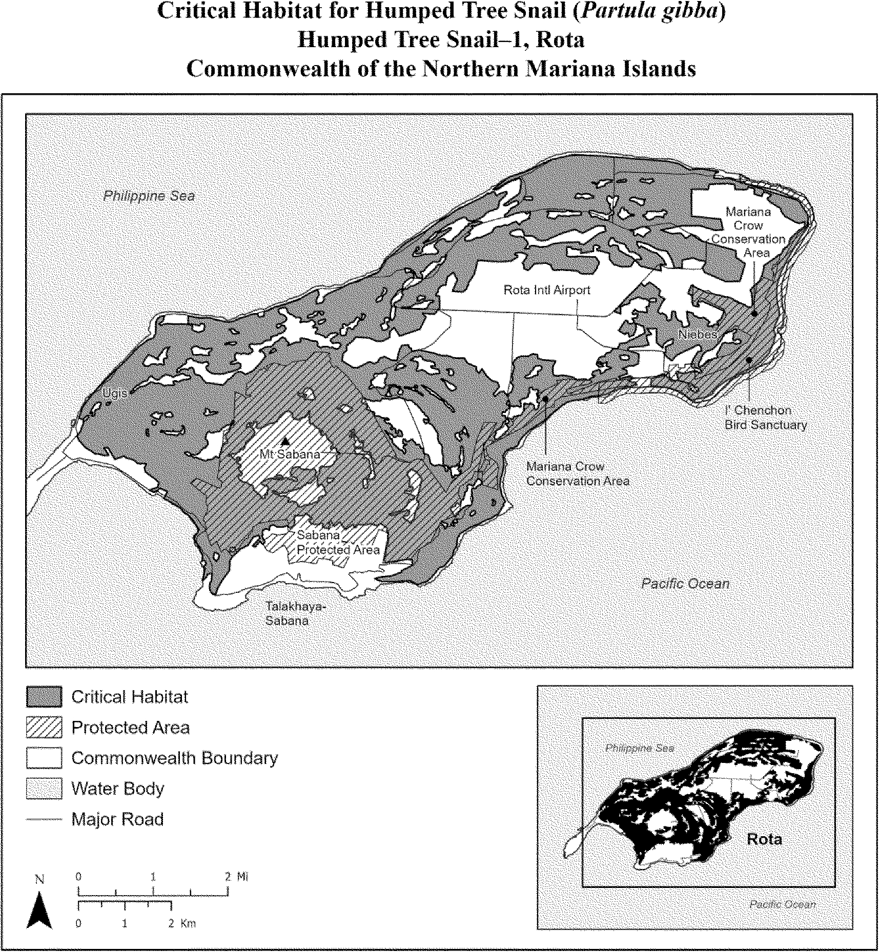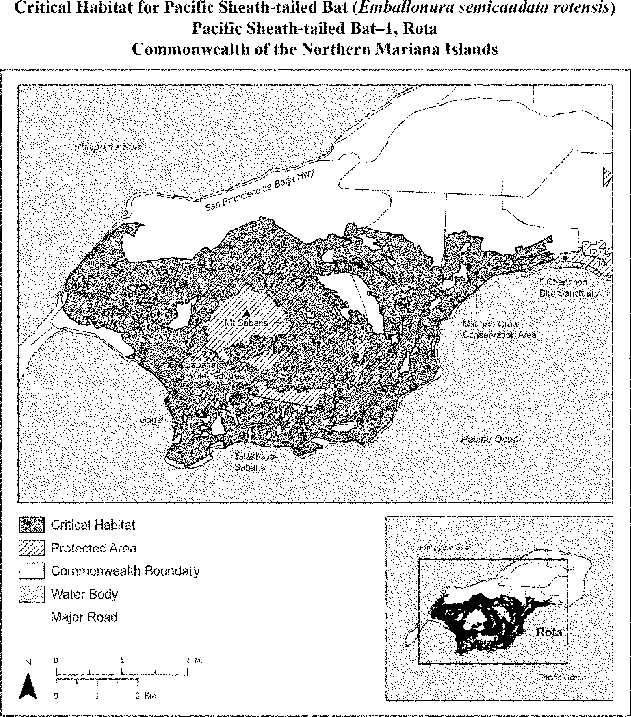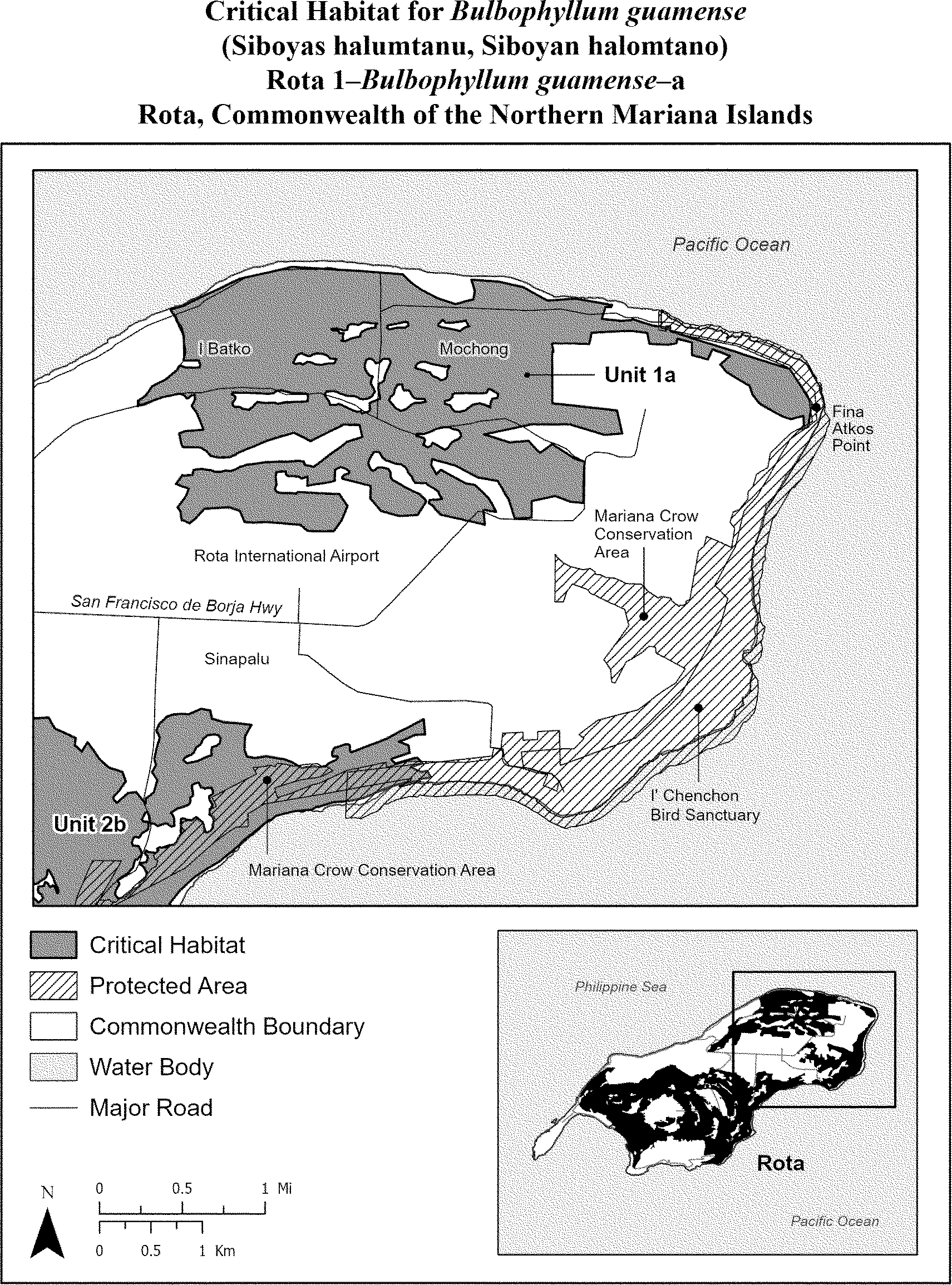 (A) The single critical habitat unit (2a) on the island of Rota consists of 6,875 ac (2,782 ha) and is composed of limestone forest in the south of the island. This unit extends south of the Rota International Airport, stretches east to the I'Chenchon Bird Sanctuary, and flanks the Talakhaya-Sabana watershed to the south (encompassing parts of the Sabana Protected Area, Mariana Crow Conservation Area, and I'Chenchon Bird Sanctuary) and east to Ugis. The unit does not include developed areas, grasslands, and Mt. Sabana. Land-ownership consists of 5,806 ac (2,350 ha) of land owned by the Commonwealth government, 1,039 ac (420 ha) in private ownership, and 30 ac (12 ha) that are uncategorized.