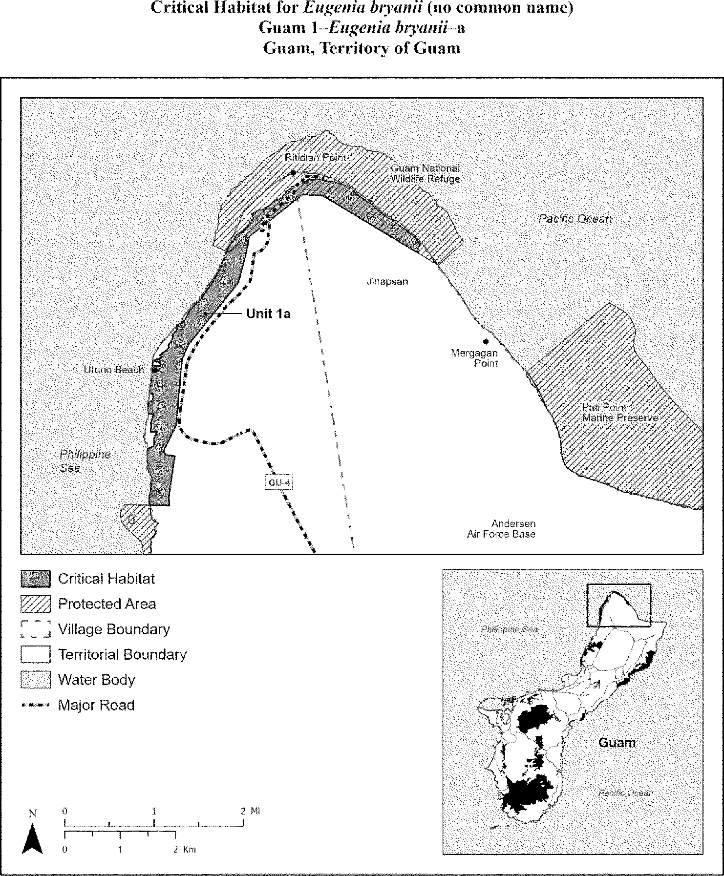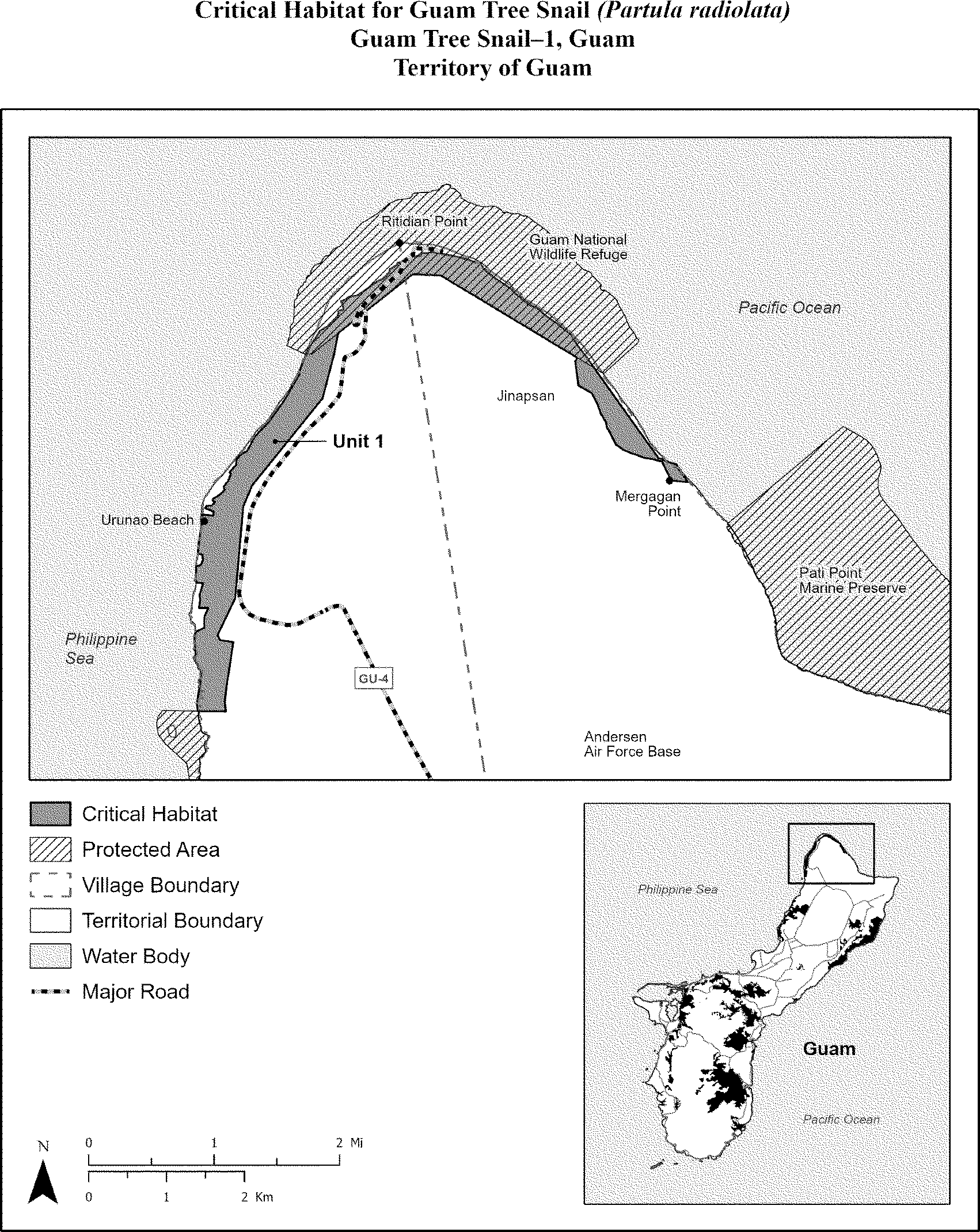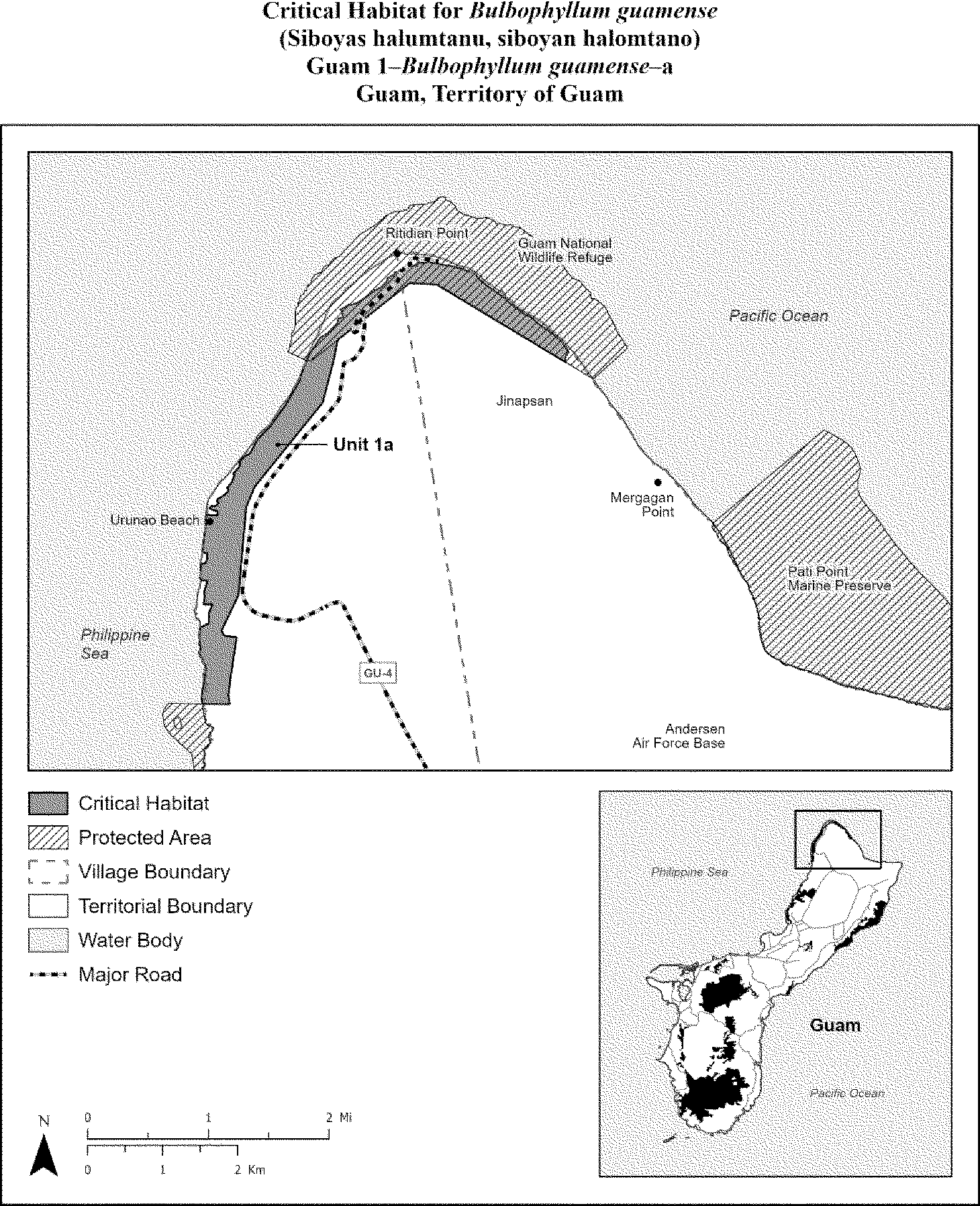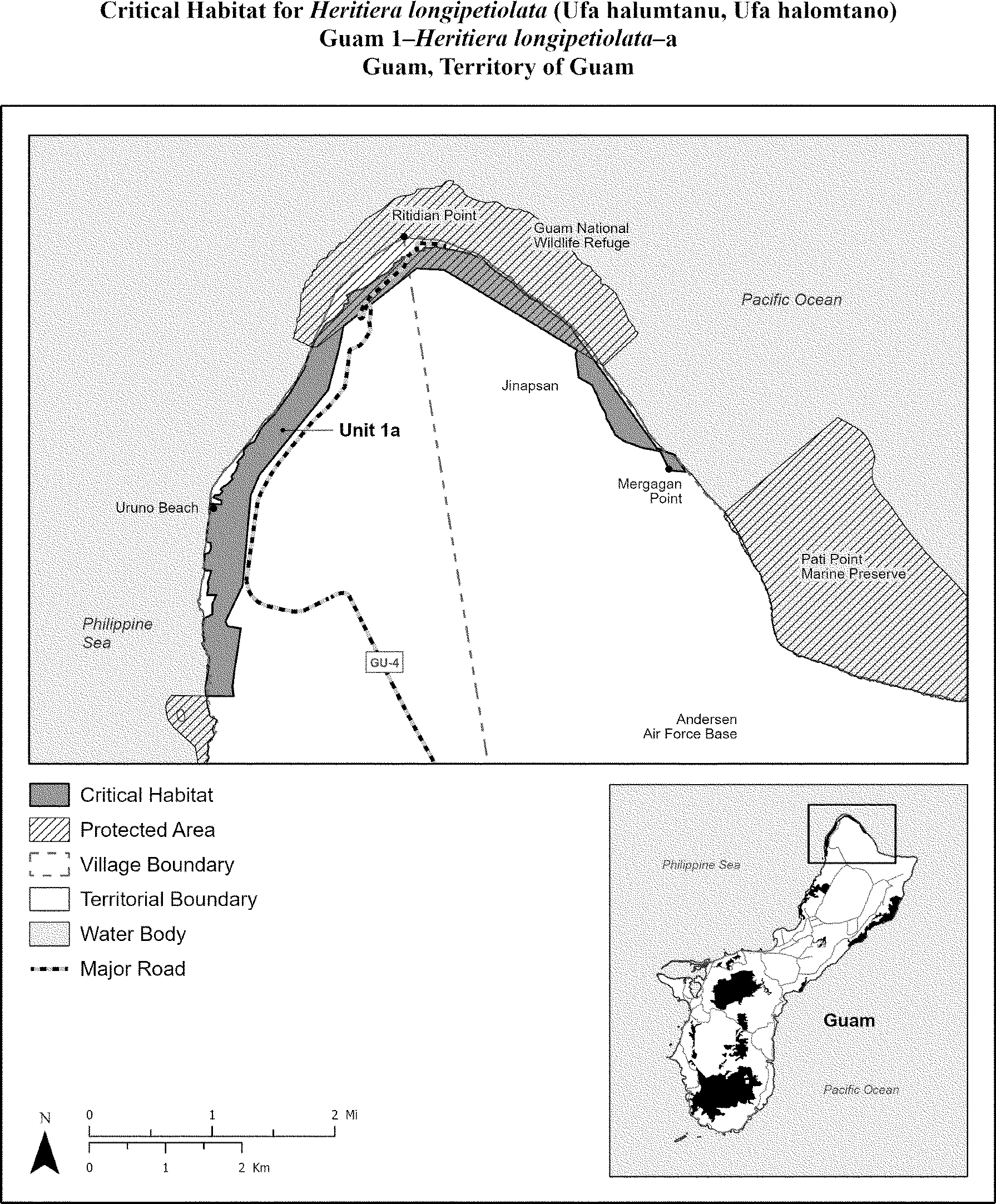 (A) Unit 1a on the island of Guam consists of 856 ac (346 ha) and is composed of a band of secondary limestone forest in a horseshoe-shape on the northwestern point of the island (Ritidian Point). The unit extends from the southwestern boundary south of Urunao Beach and runs north along the cliffline towards Jinapsan ending at Mergagan Point. Landownership includes 262 ac (106 ha) of Federal lands (Guam NWR), 68 ac (27 ha) of Territory government lands, 408 ac (165 ha) in private ownership, and 118 ac (48 ha) that are uncategorized.
