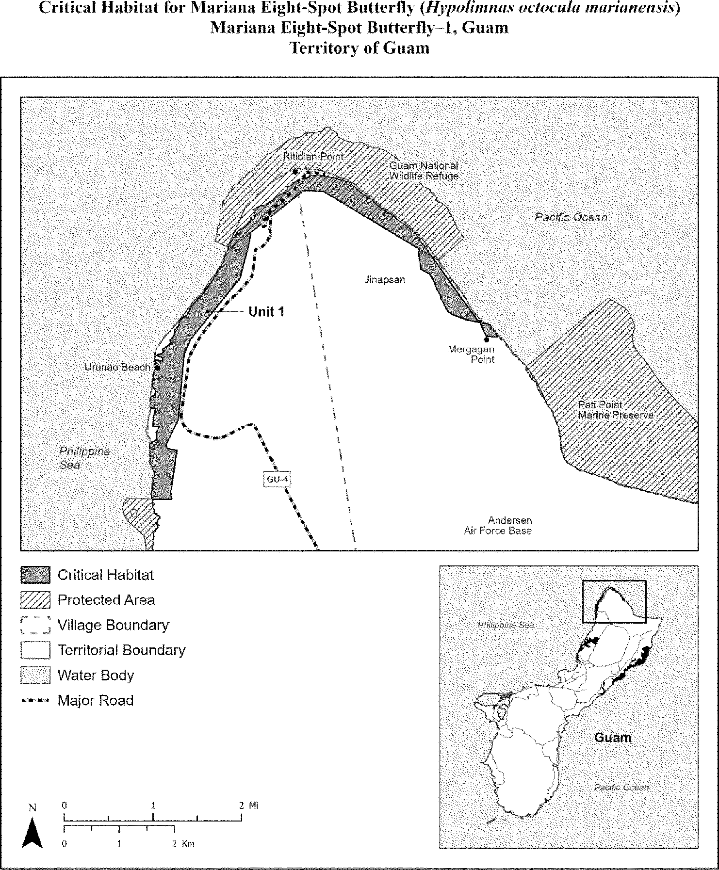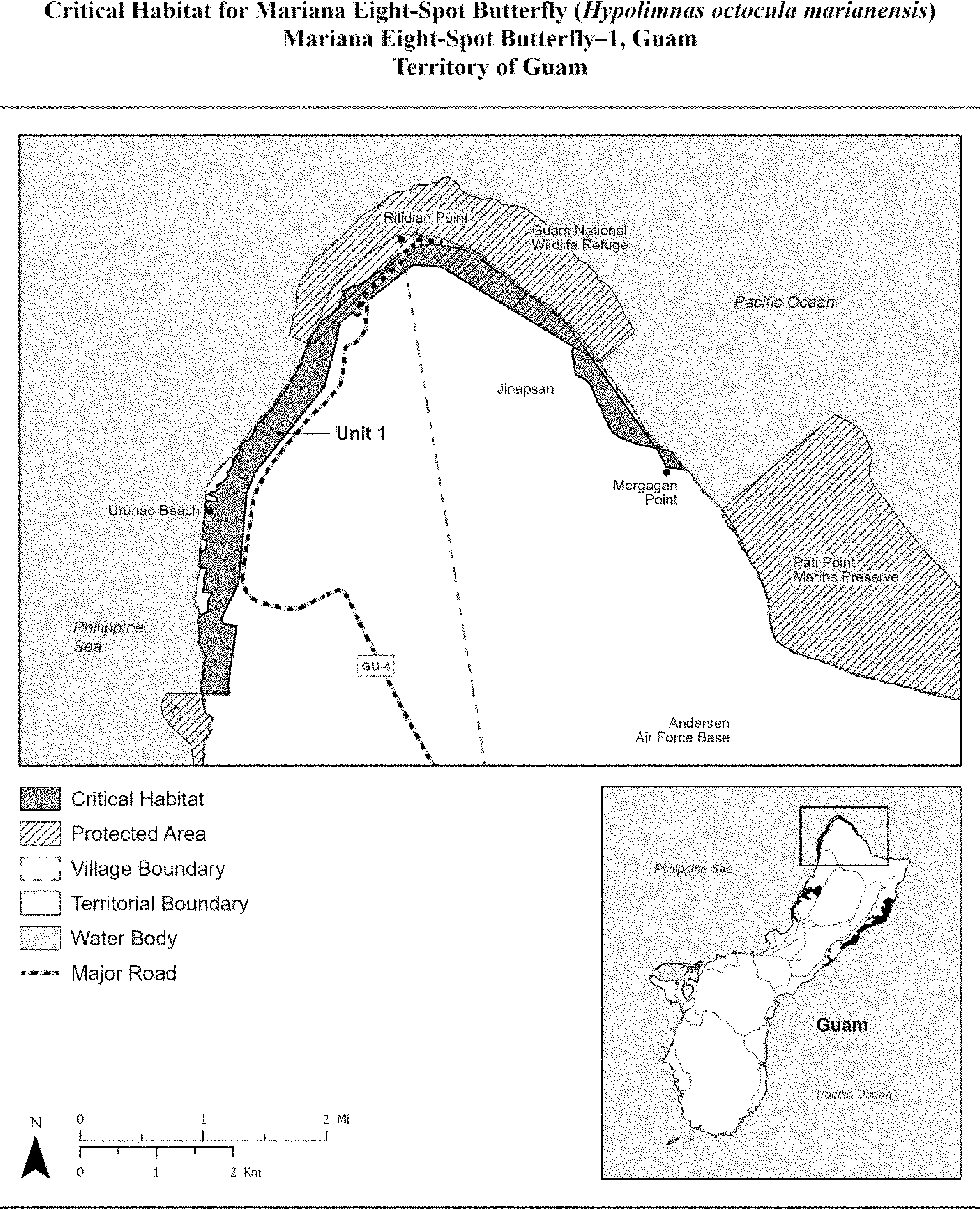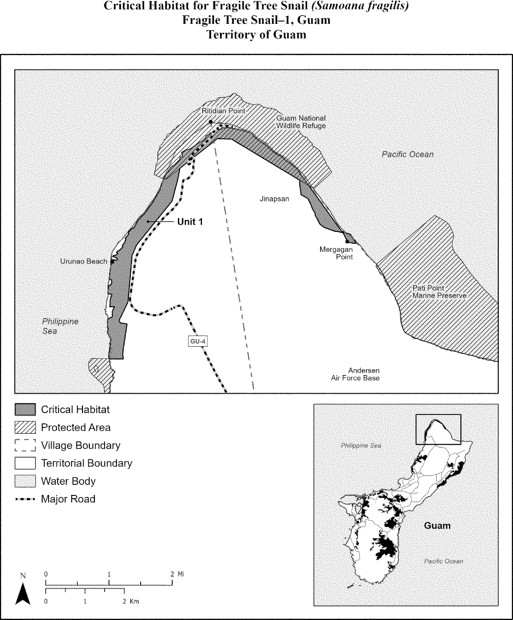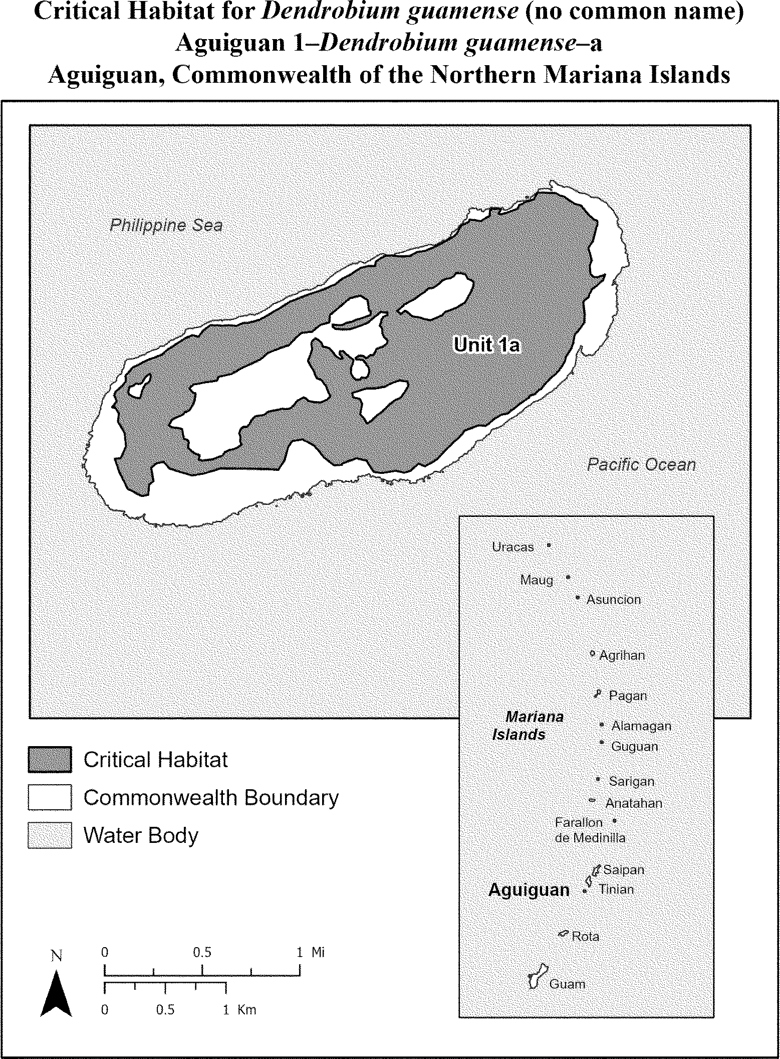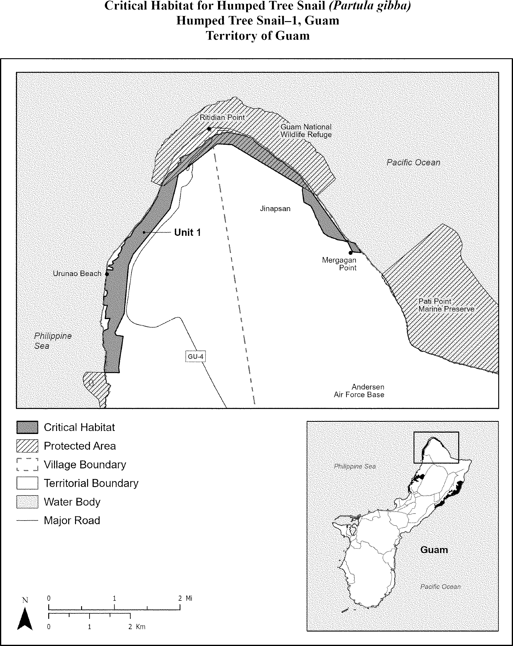 (A) Unit 1a on the island of Guam consists of 856 ac (346 ha) and is composed of a band of secondary limestone forest in a horseshoe-shape on the northwestern point of the island (Ritidian Point). The unit extends from the southwestern boundary south of Urunao Beach and runs north along the cliffline towards Jinapsan ending at Mergagan Point. Landownership includes 262 ac (106 ha) of Federal lands (Guam NWR), 68 ac (27 ha) of Territory government lands, 408 ac (165 ha) in private ownership, and 118 ac (48 ha) that are uncategorized.