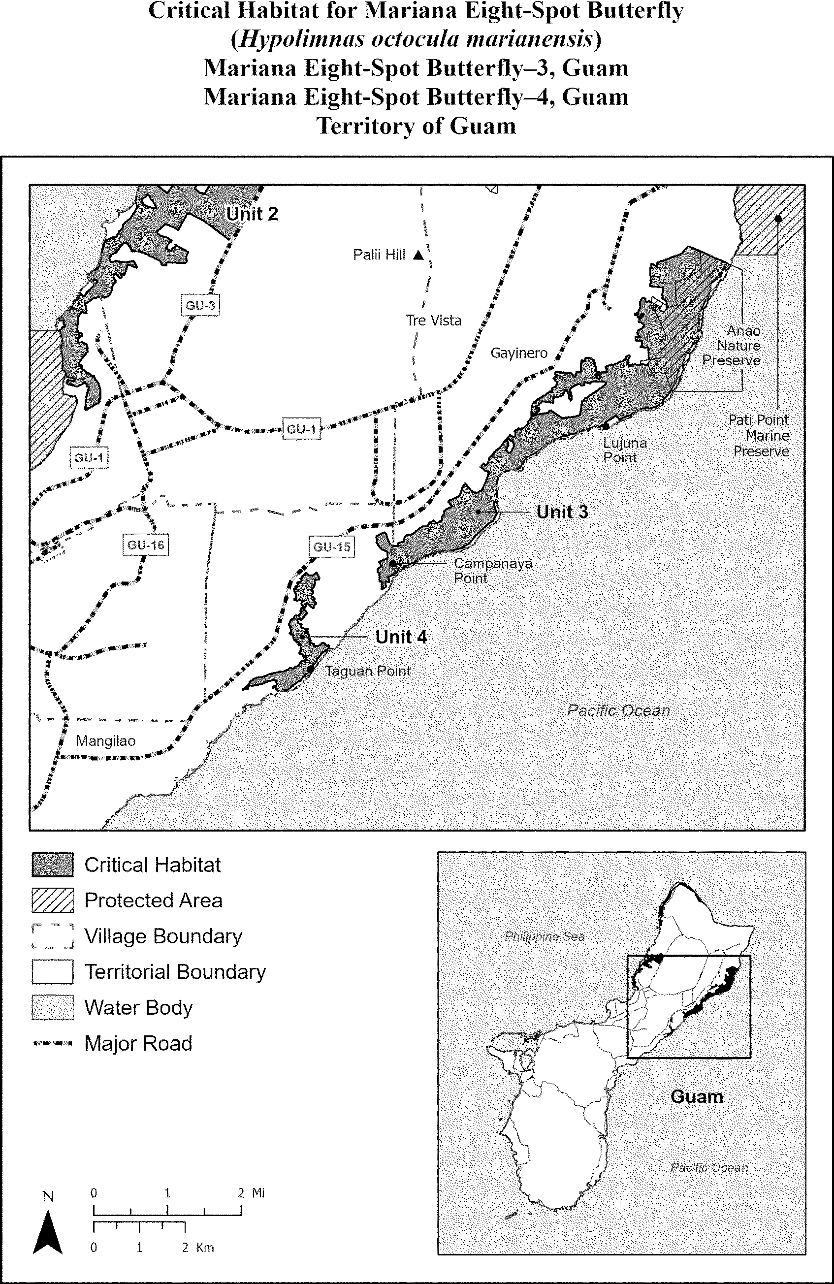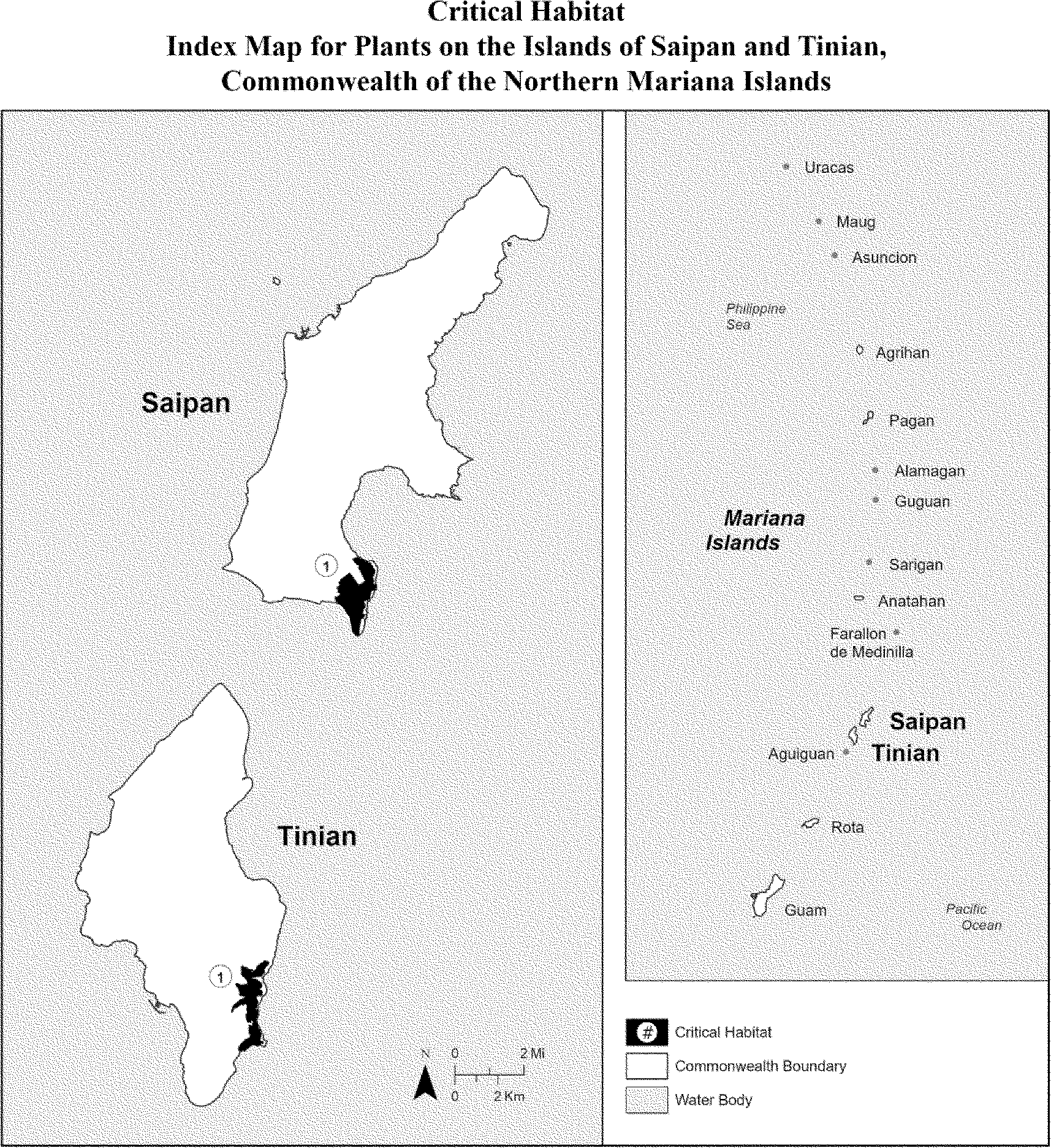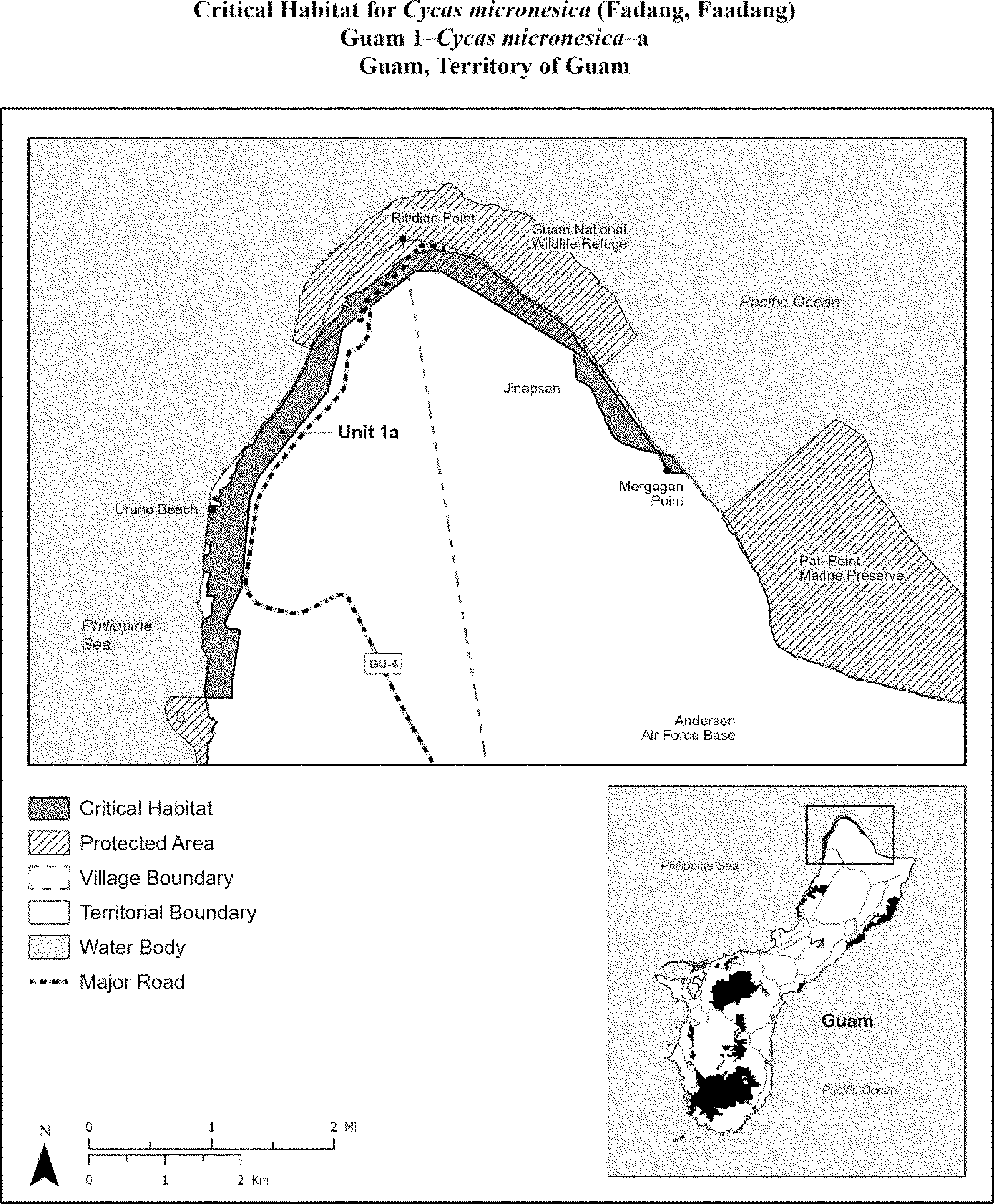 (A) Each critical habitat unit name comprises an island name, a number corresponding to a specific geographic location/area on the applicable island, which may include overlapping units for different species, the species name, and a letter. The letter at the end of each critical habitat unit name corresponds to the number of units present on a given island, where each escalating letter for each island corresponds to the additive number of units per island for the species. Critical habitat for Cycas micronesica includes one unit on the island of Rota and six units on the island of Guam, for a total of seven critical habitat units.