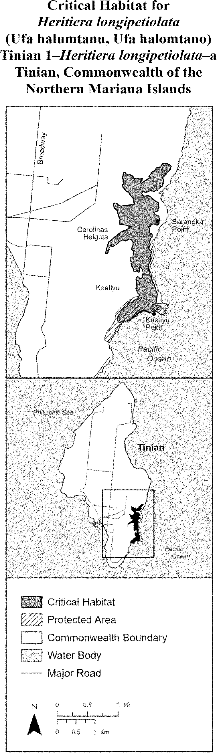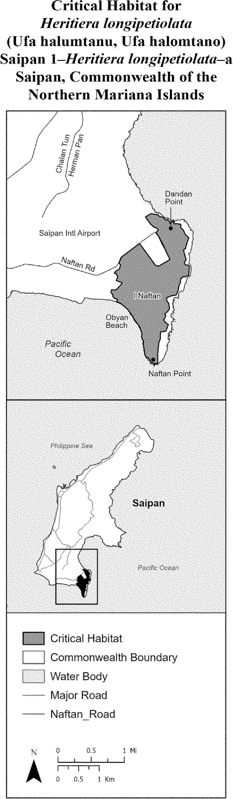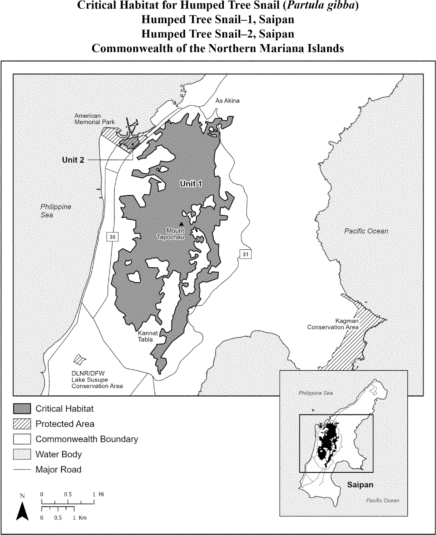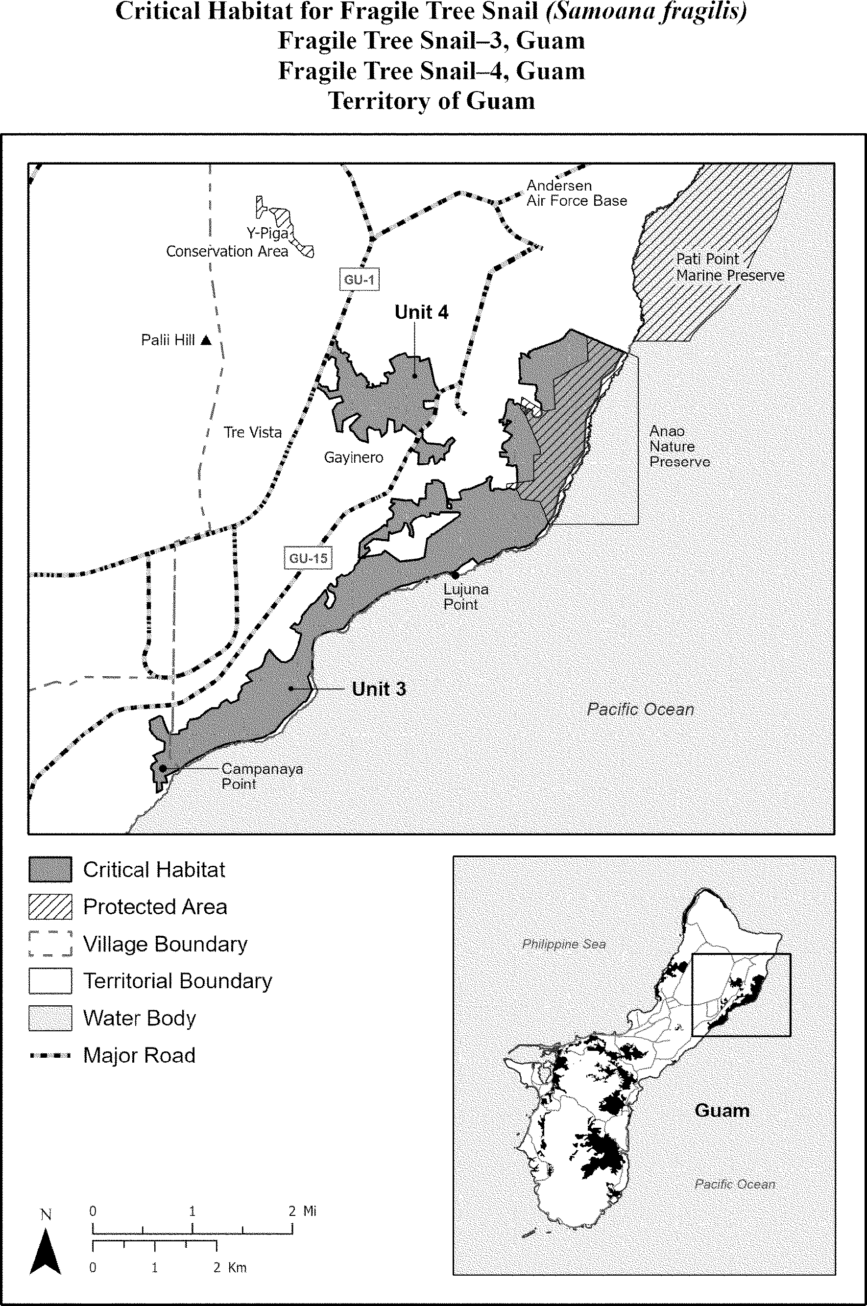 (A) Each critical habitat unit name comprises an island name, a number corresponding to a specific geographic location/area on the applicable island, which may include overlapping units for different species, the species name, and a letter. The letter at the end of each critical habitat unit name corresponds to the number of units present on a given island, where each escalating letter for each island corresponds to the additive number of units per island for the species. Critical habitat for Cycas micronesica includes one unit on the island of Rota and six units on the island of Guam, for a total of seven critical habitat units.
