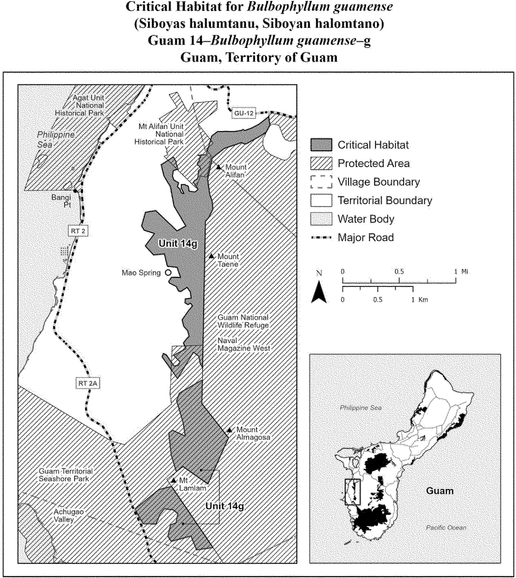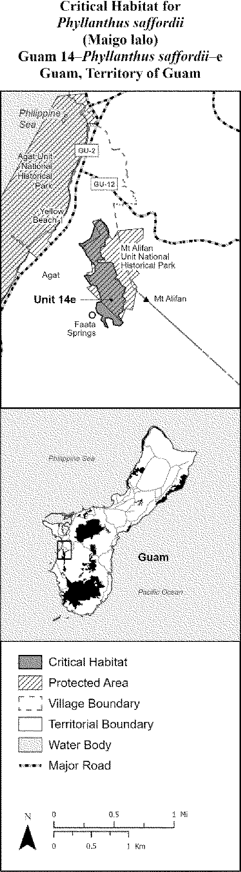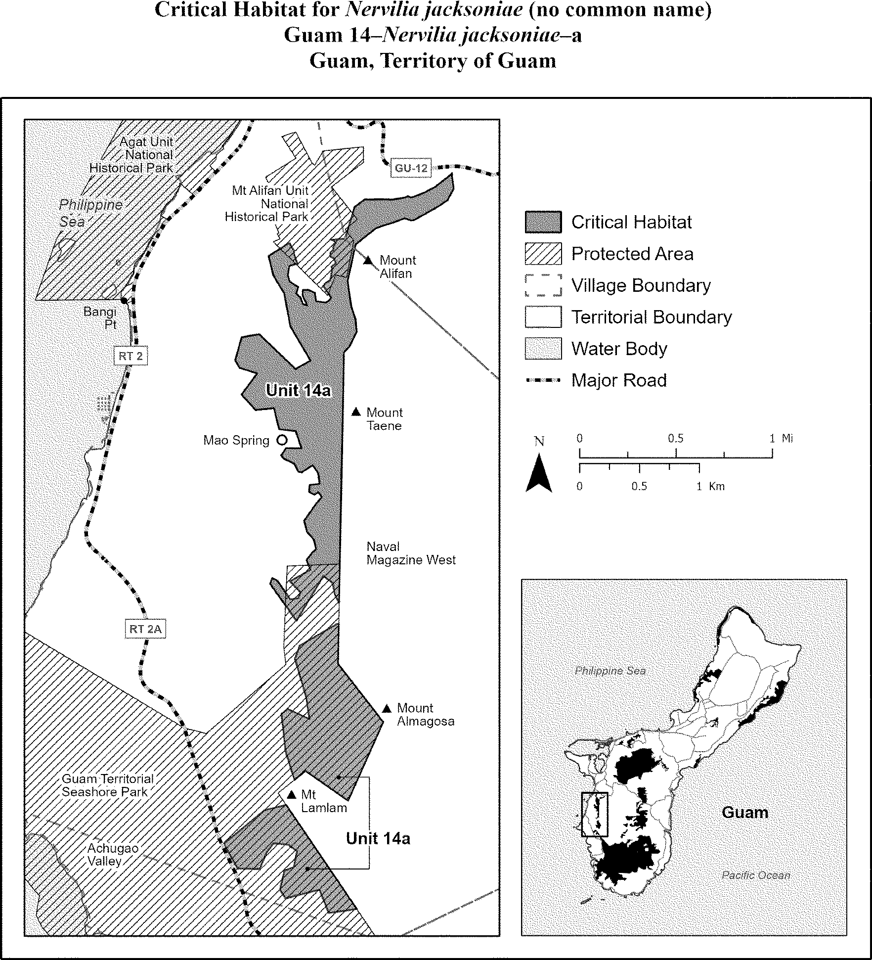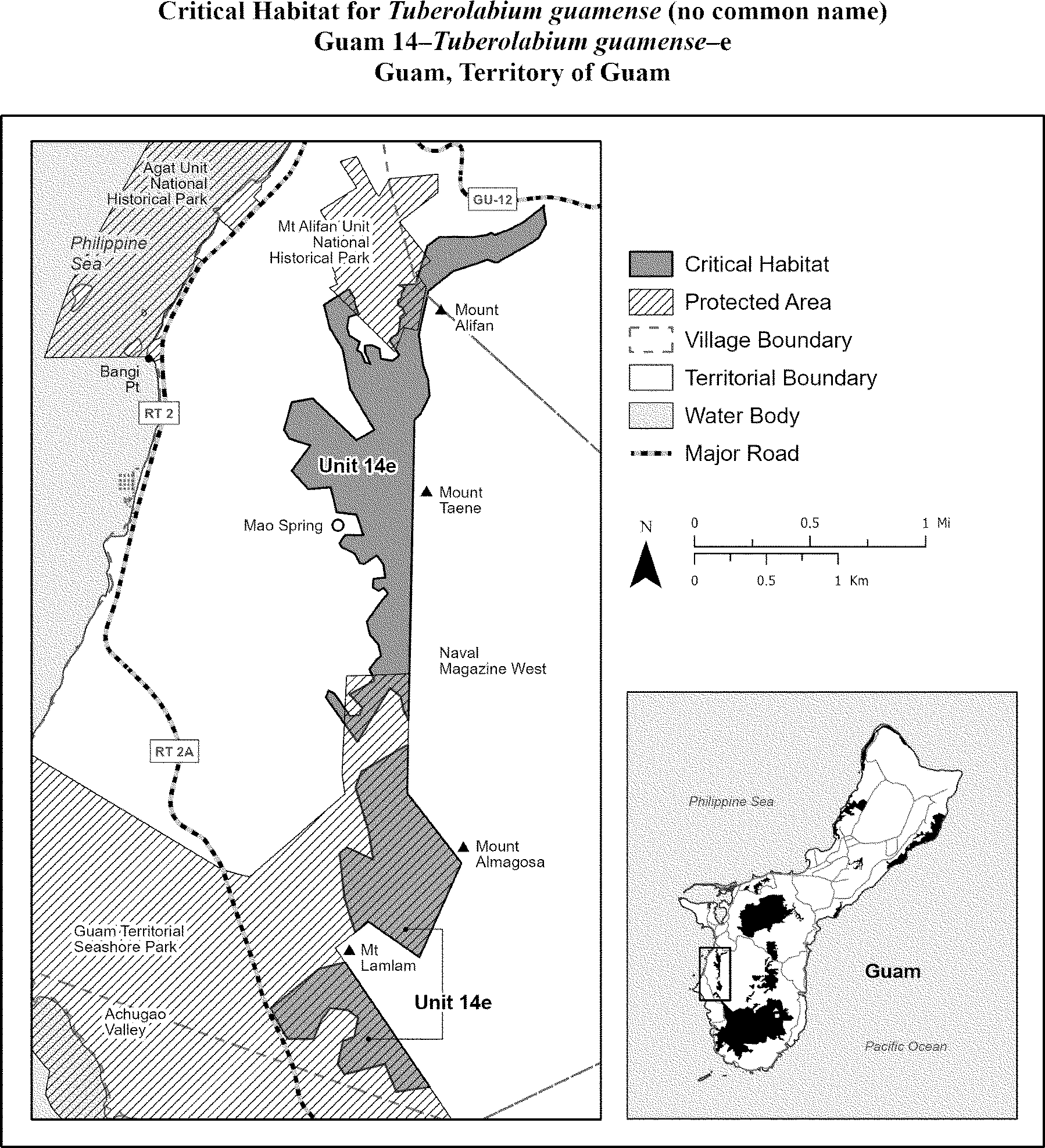 (A) Unit 14e on the island of Guam consists of 629 ac (254 ha) and is composed of three segments of limestone forests on the southwestern side of the island. The unit extends from Route 12 and Mt. Alifan in the north, running along the border of Naval Magazine West and ending south of Mt. Lamlam at Route 2A. Landownership includes 16 ac (6 ha) of Federal lands (War in the Pacific National Historical Park), 84 ac (34 ha) of Territory government lands, 344 ac (139 ha) in private ownership, and 185 ac (75 ha) that are uncategorized. The northern portion of the unit overlaps the Mt. Alifan Unit of War in the Pacific National Historical Park. The southern portion of the unit overlaps the Guam Territorial Seashore Park.