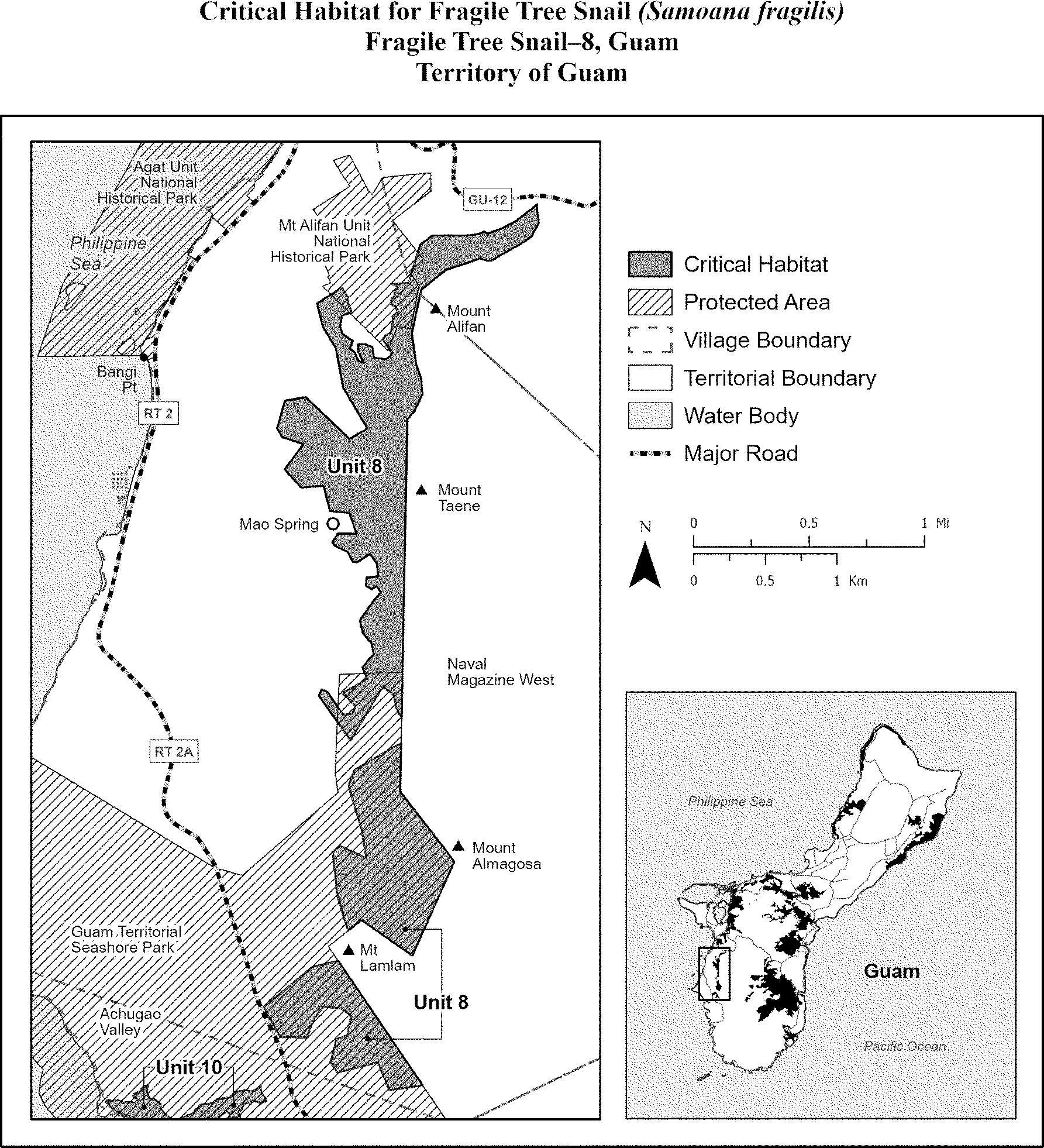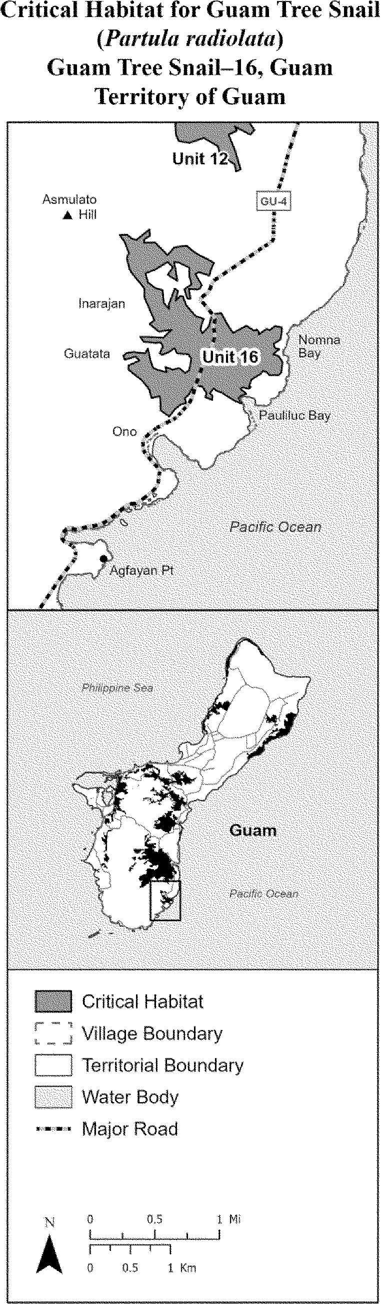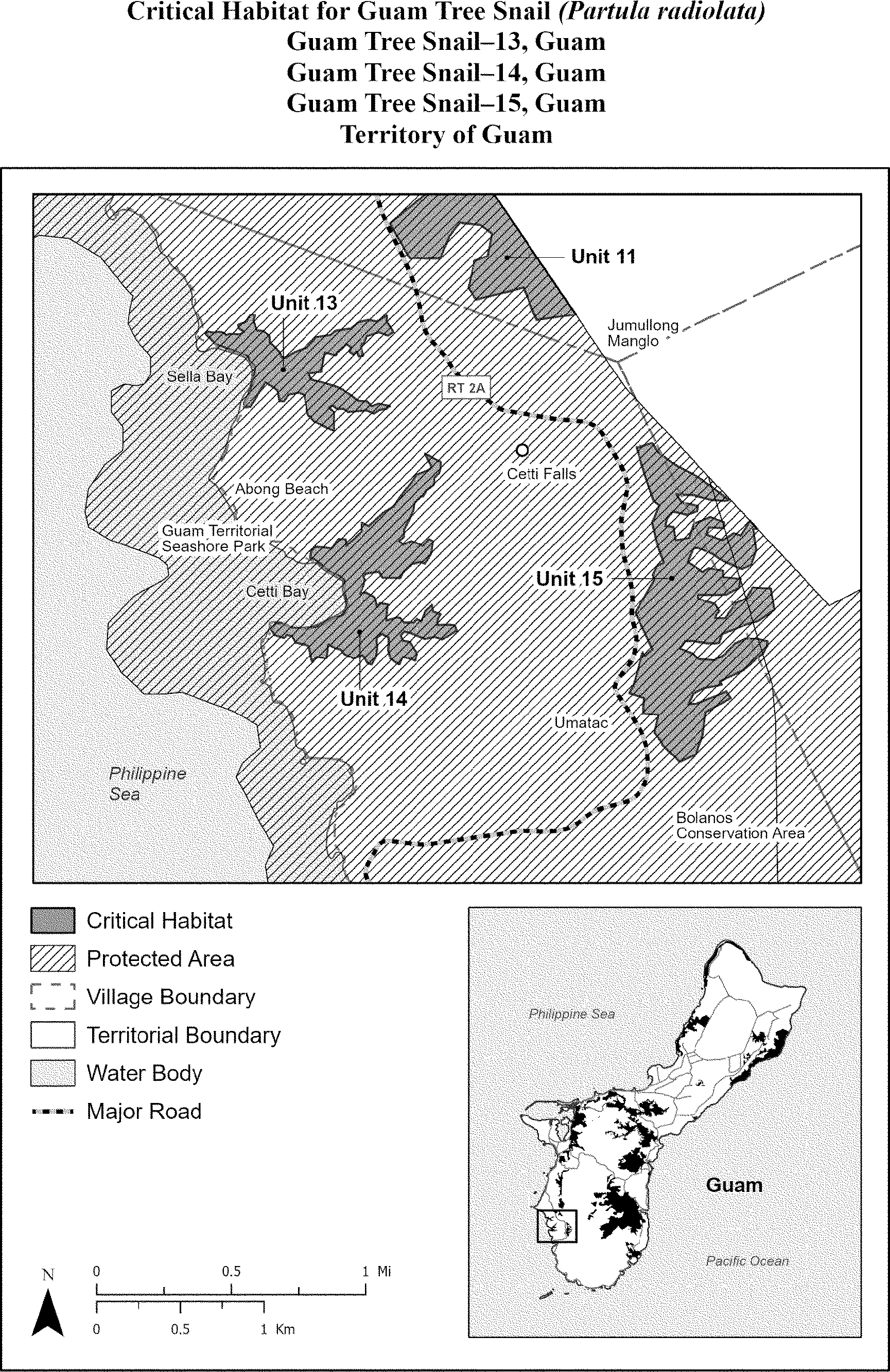 (A) Unit 14e on the island of Guam consists of 629 ac (254 ha) and is composed of three segments of limestone forests on the southwestern side of the island. The unit extends from Route 12 and Mt. Alifan in the north, running along the border of Naval Magazine West and ending south of Mt. Lamlam at Route 2A. Landownership includes 16 ac (6 ha) of Federal lands (War in the Pacific National Historical Park), 84 ac (34 ha) of Territory government lands, 344 ac (139 ha) in private ownership, and 185 ac (75 ha) that are uncategorized. The northern portion of the unit overlaps the Mt. Alifan Unit of War in the Pacific National Historical Park. The southern portion of the unit overlaps the Guam Territorial Seashore Park.