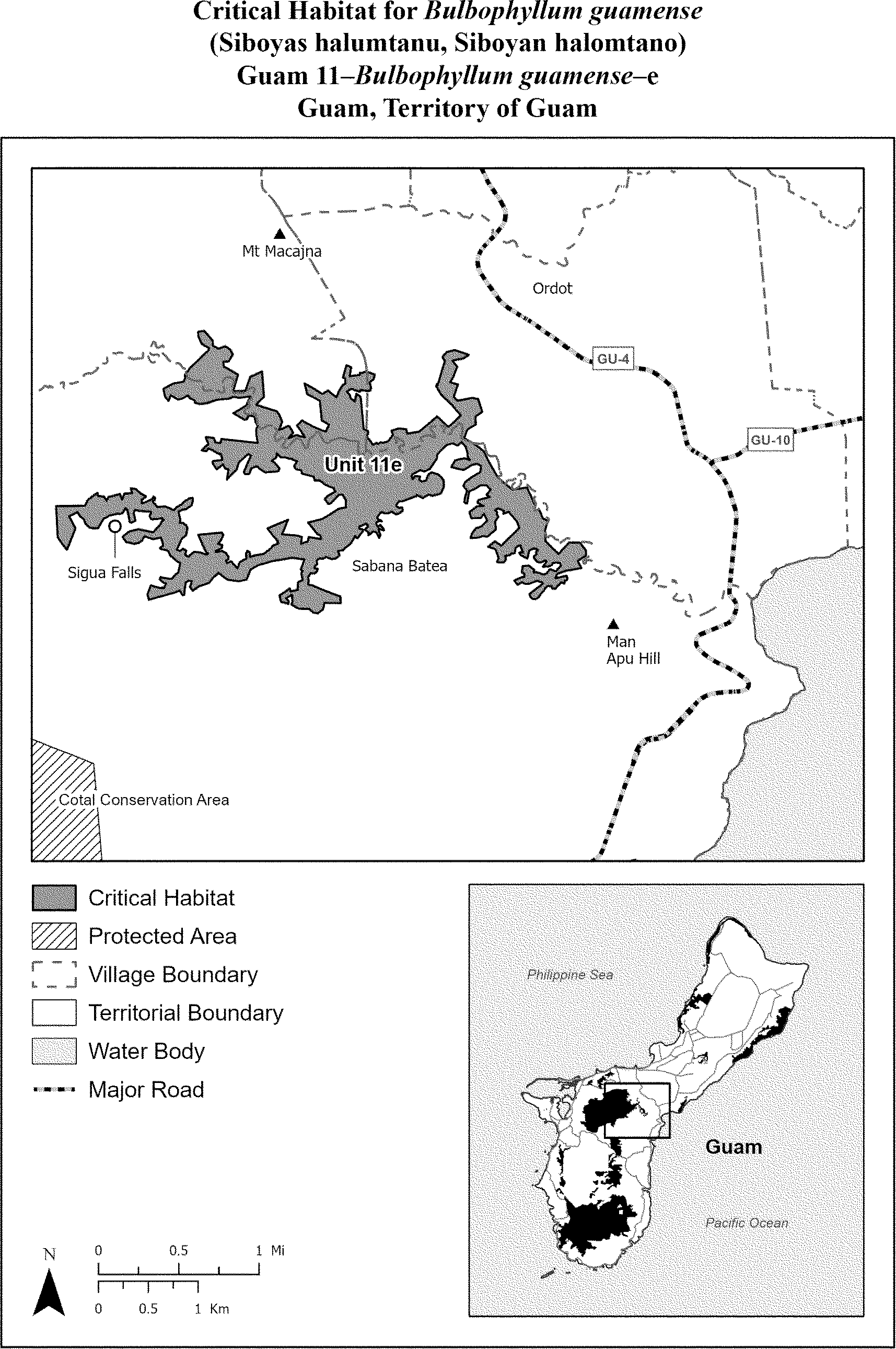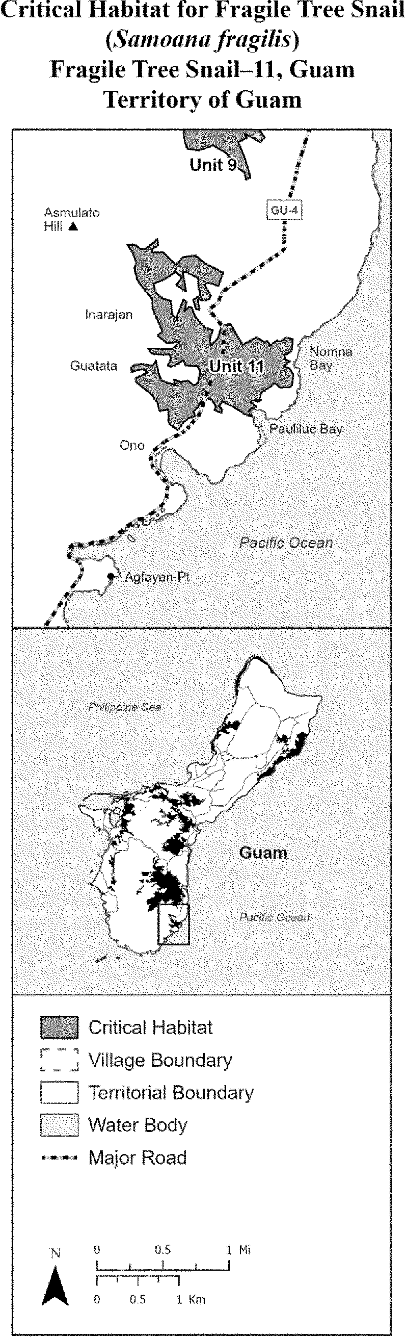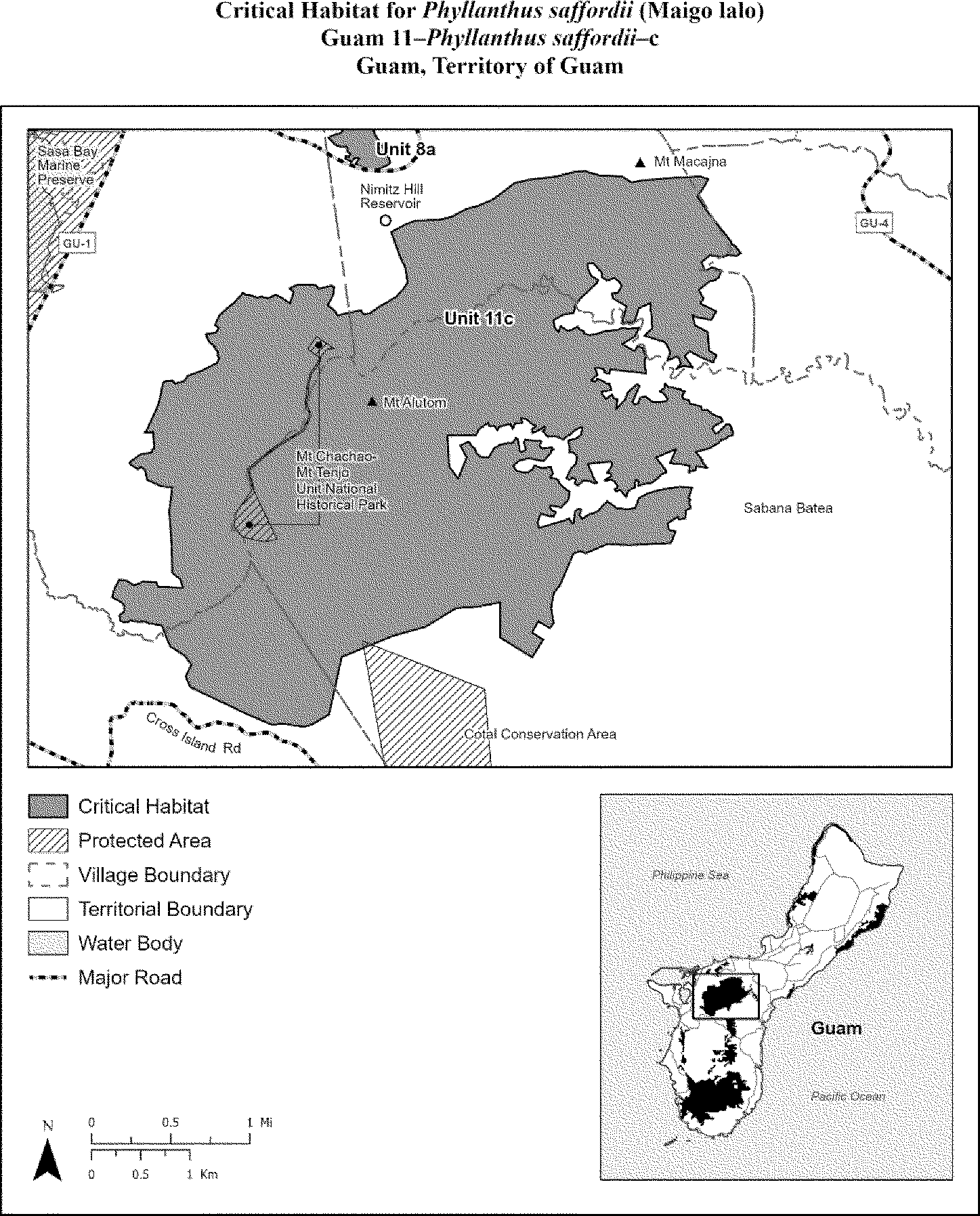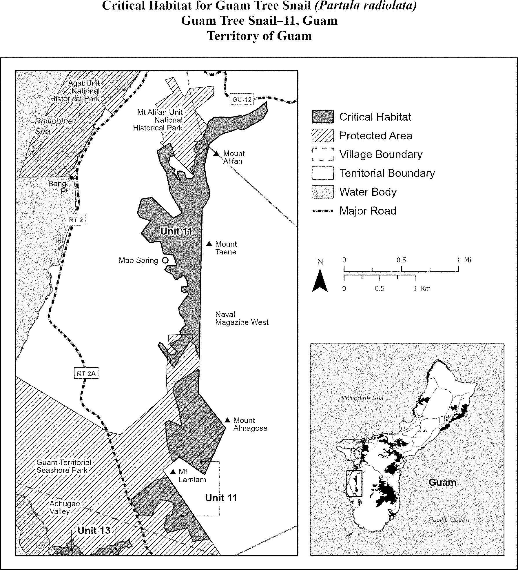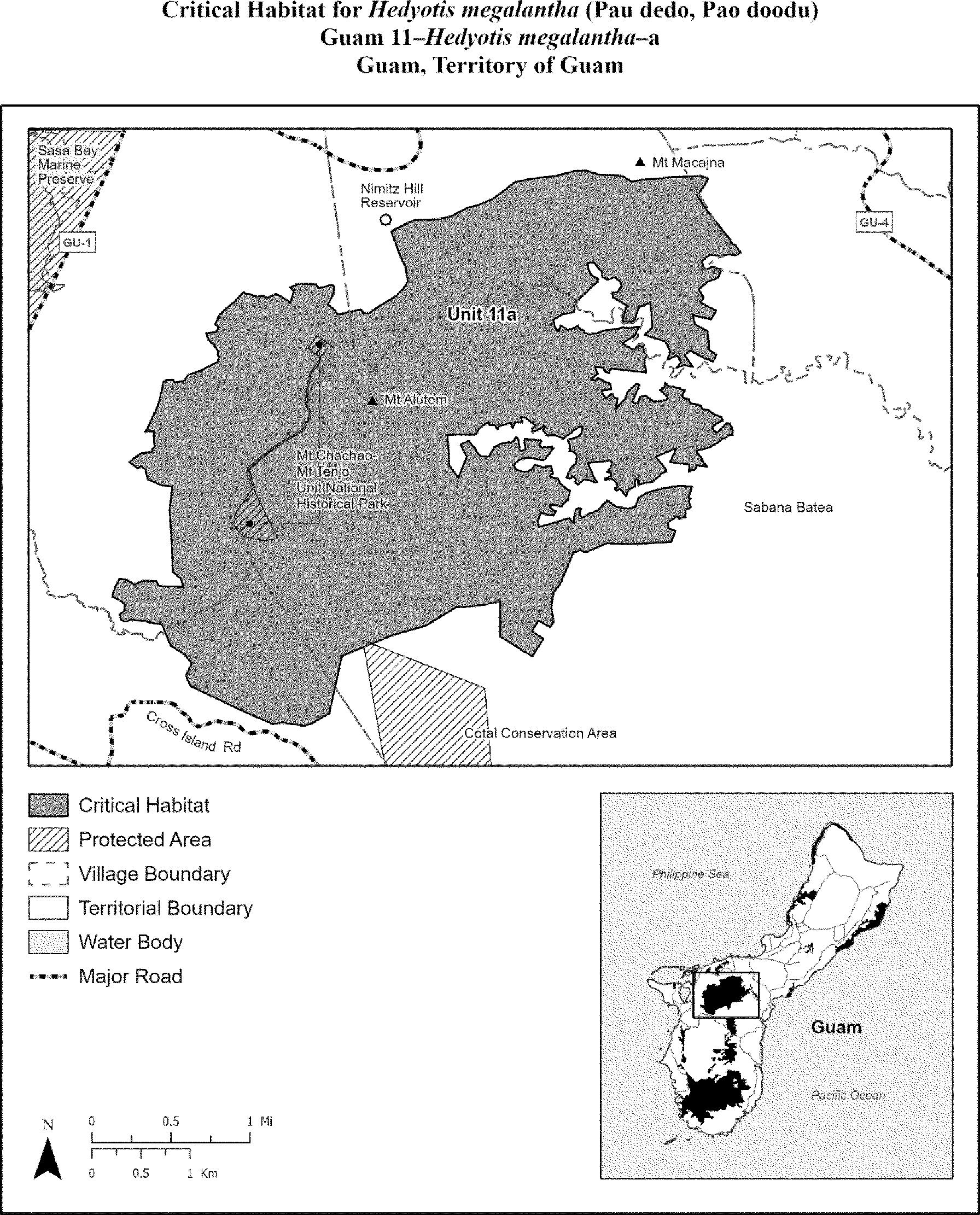 (i) Unit 11a on the island of Guam consists of 5,024 ac (2,033 ha) and is composed of savanna habitat in the southcentral part of the island. The unit extends from Mt. Macajna near Route 4 on the northern end to Cross Island Road on the southern end. The unit does not include forested areas along the Sigua and Lonfit Rivers (which are not represented on the map due to unavailable data layers). Landownership includes 45 ac (18 ha) of Federal lands (War in the Pacific National Historical Park), 3,031 (1,227 ha) in private ownership, and 1,948 ac (788 ha) that are uncategorized. The central portion of the unit overlaps the Mt. Chachao-Mt. Tenjo unit of War in the Pacific National Historical Park, and a small portion of the southeastern part of the unit overlaps the Cotal Conservation Area.
