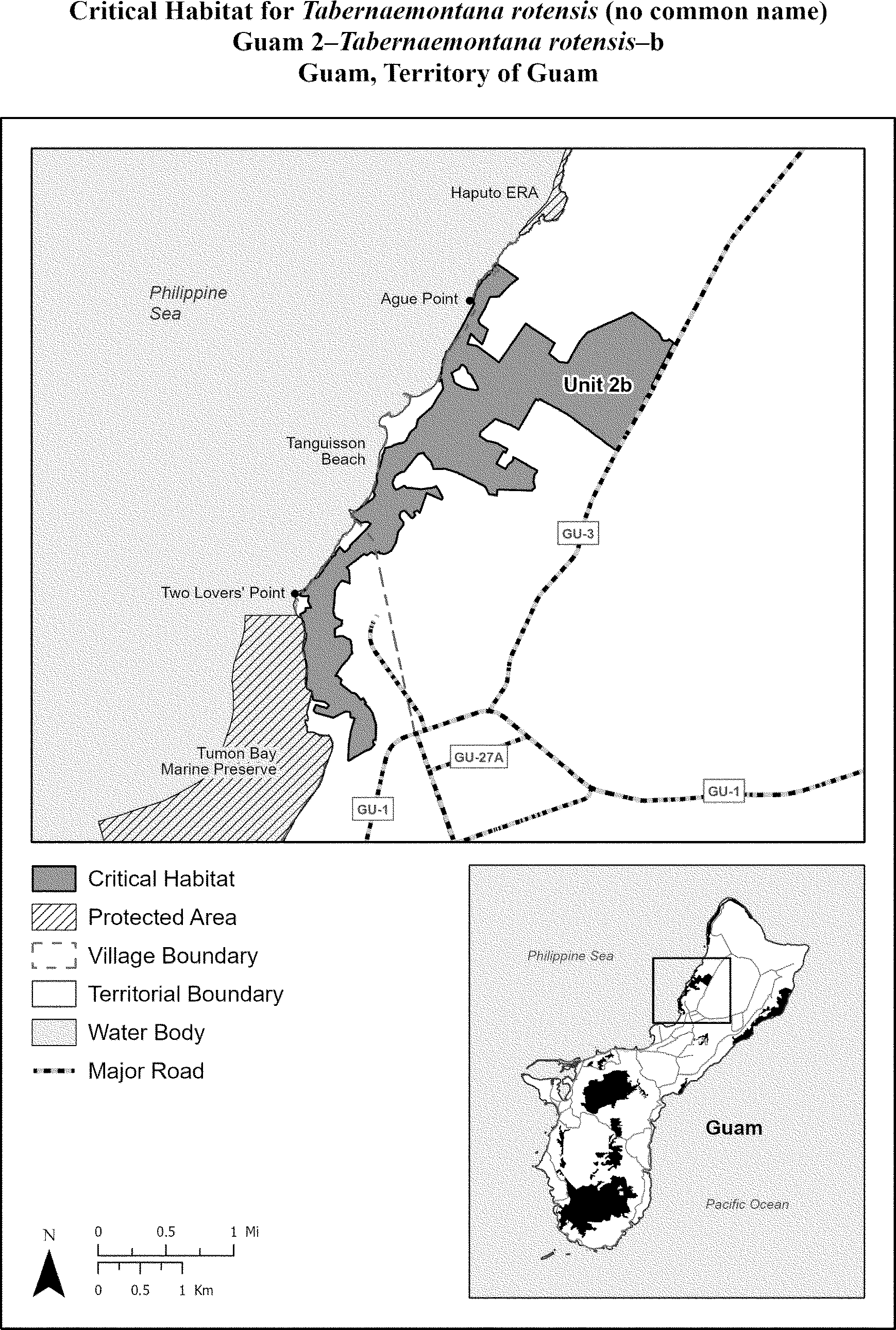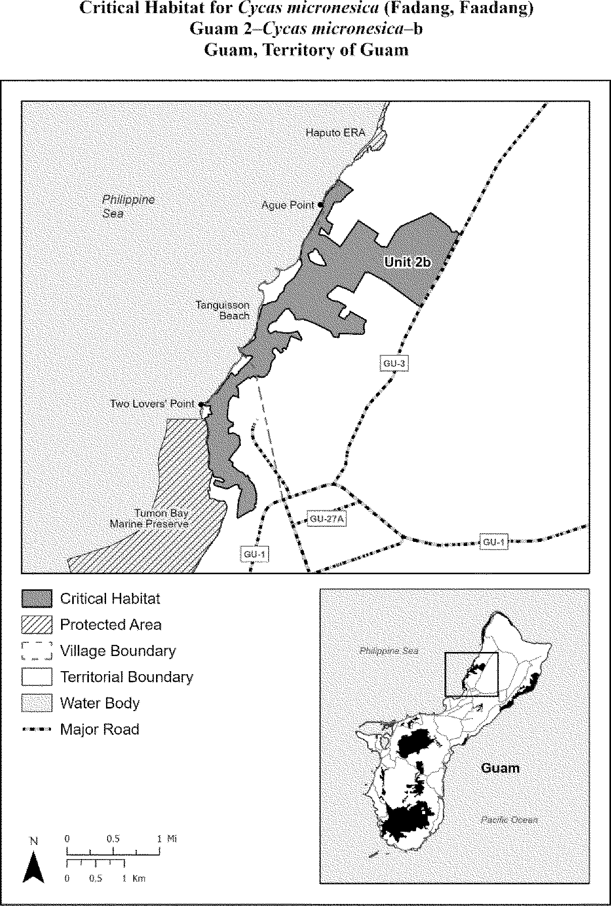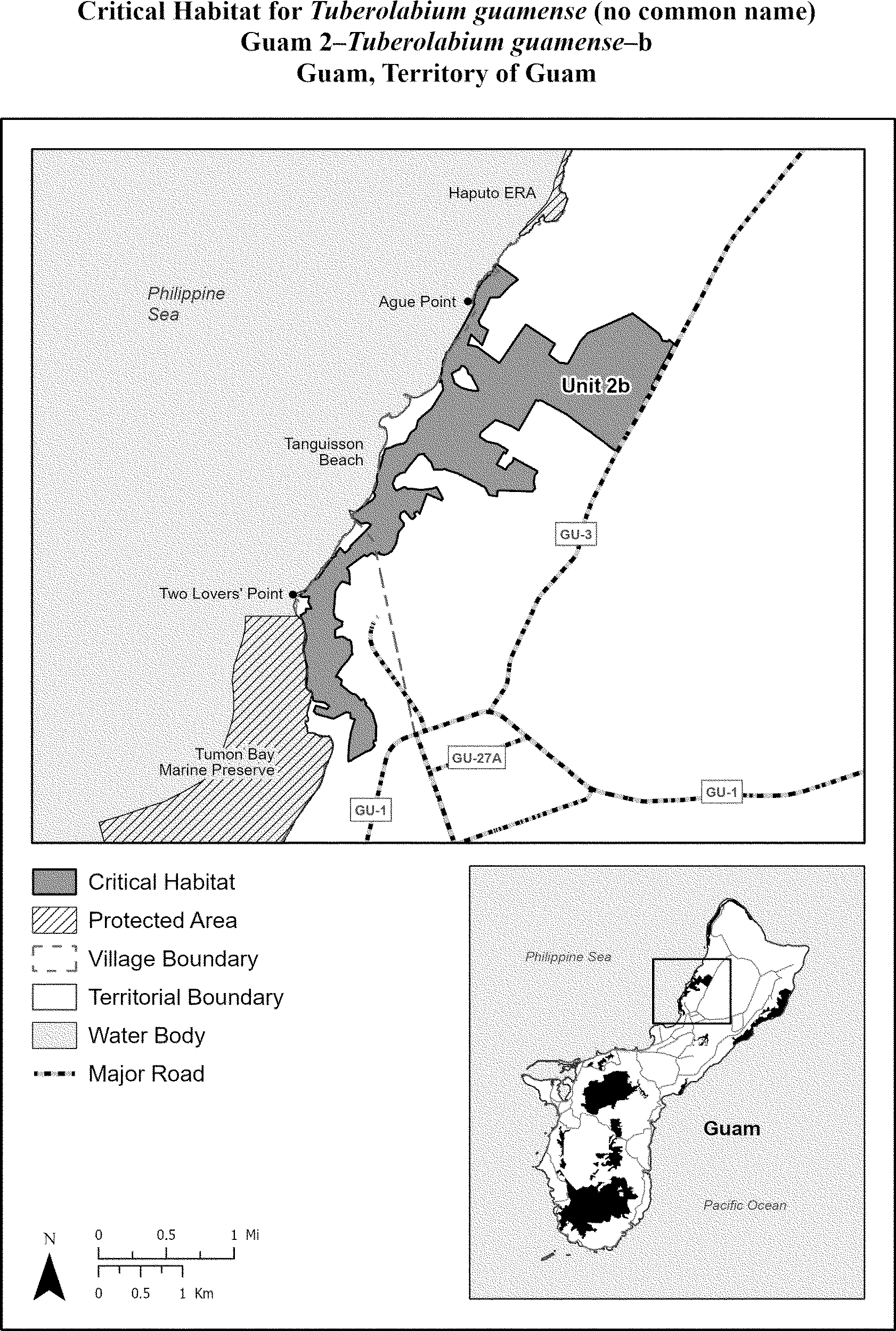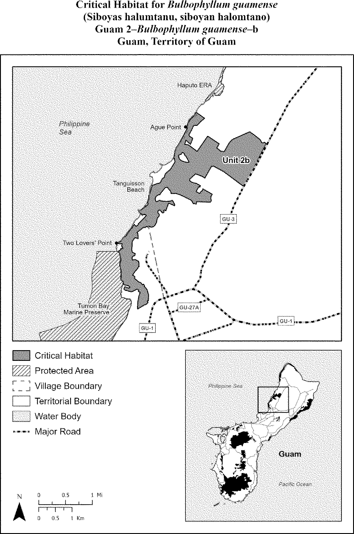 (A) Unit 2b on the island of Guam consists of 1,245 ac (504 ha) and is composed of limestone forests along the northwestern edge of the island. The unit lies west of Route 3 and extends from the clifflines overlooking Tumon Bay west of Route 1 and runs north to Ague Point. Landownership includes 1,081 ac (437 ha) of Territory government lands, 108 ac (44 ha) in private ownership, and 56 ac (23 ha) that are uncategorized.