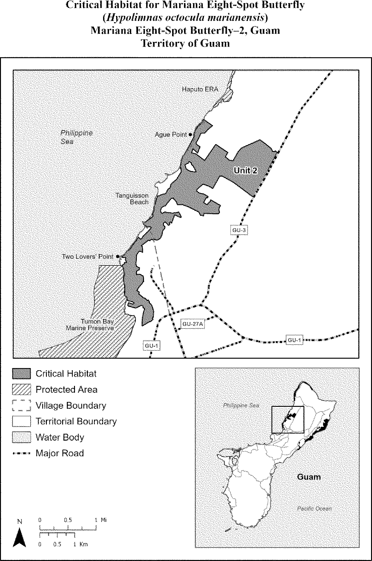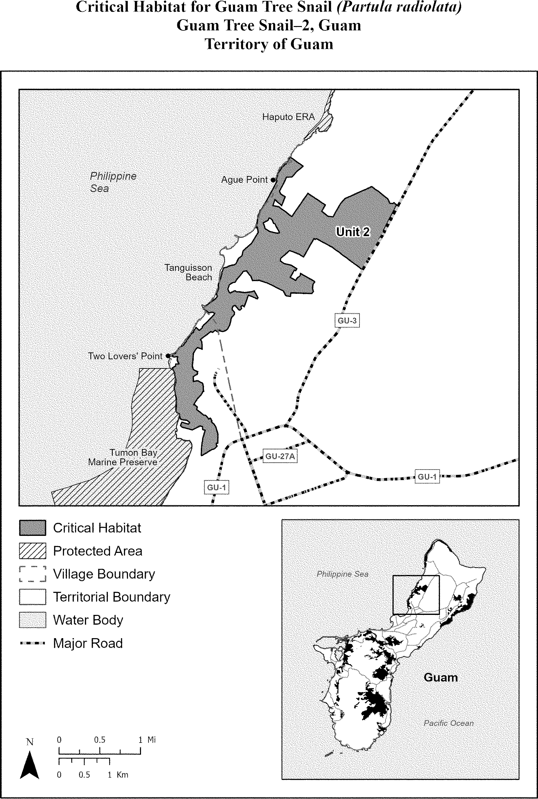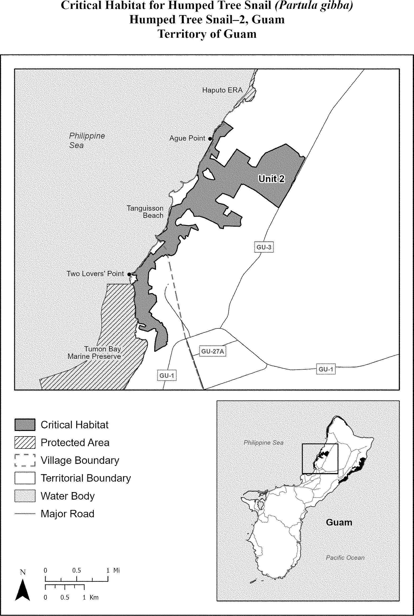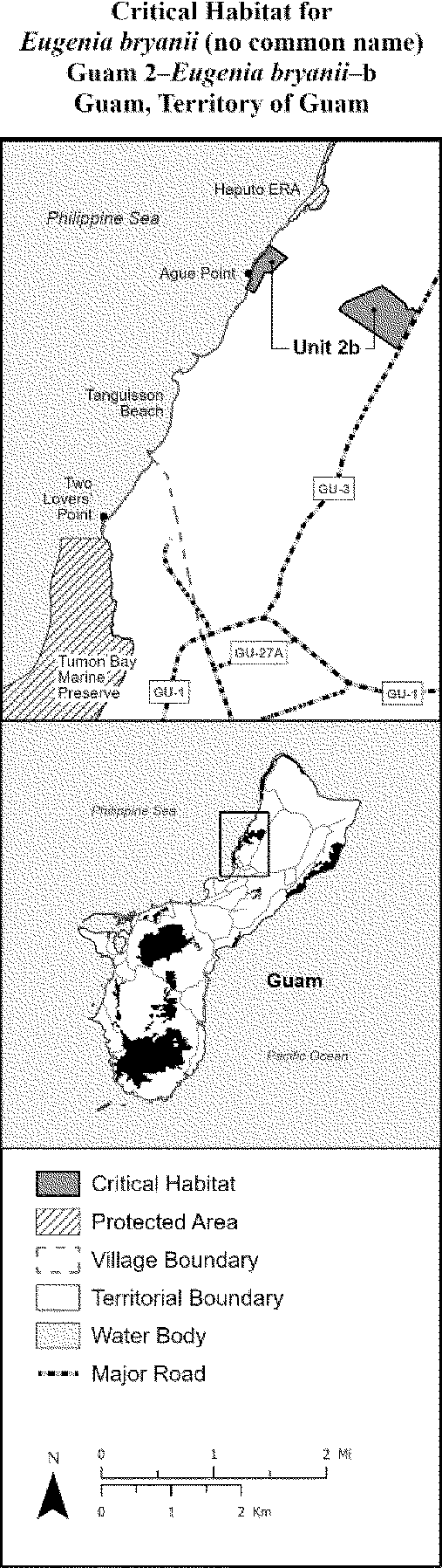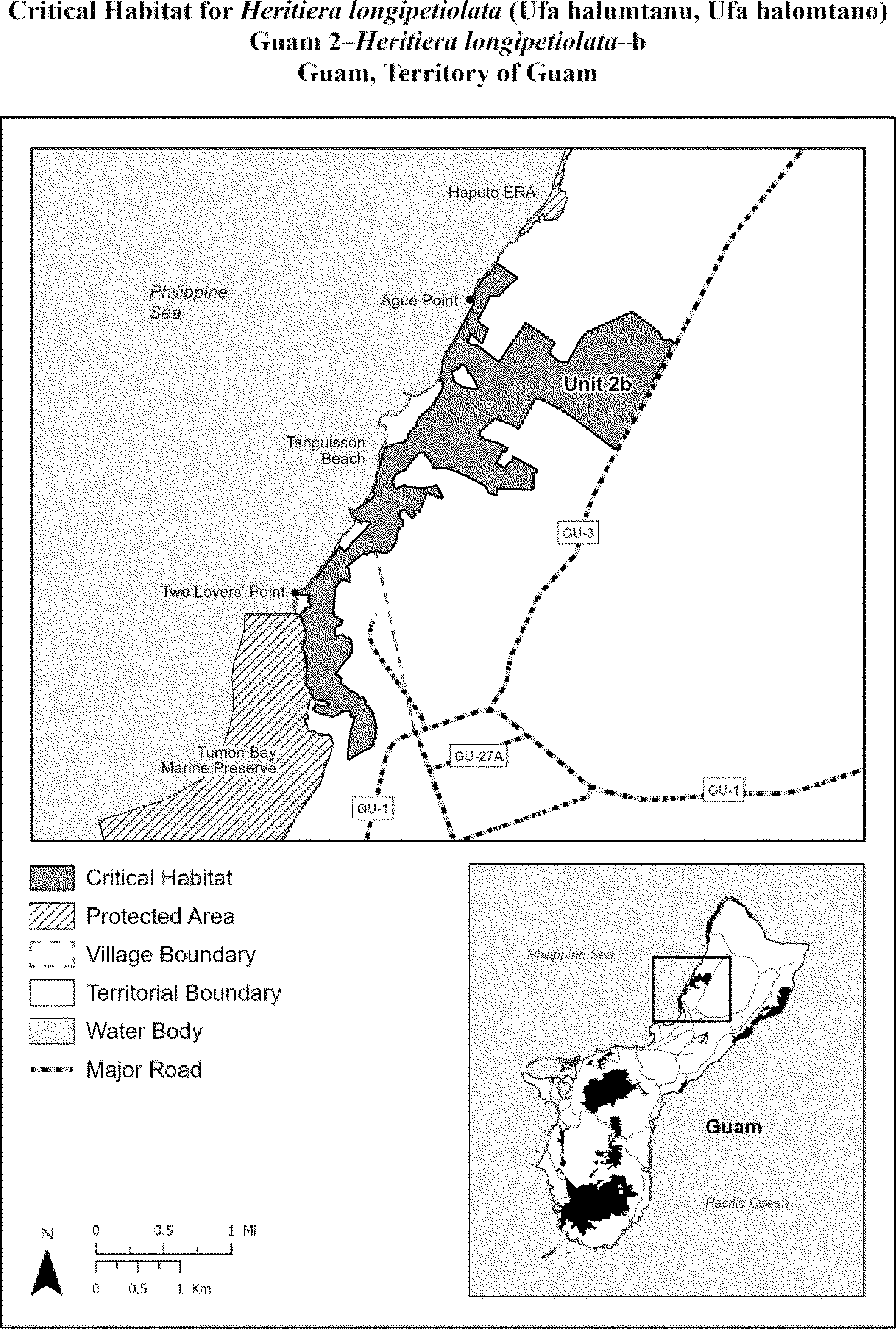 (A) Unit 2b on the island of Guam consists of 1,245 ac (504 ha) and is composed of limestone forests along the northwestern edge of the island. The unit lies west of Route 3 and extends from the clifflines overlooking Tumon Bay west of Route 1 and runs north to Ague Point. Landownership includes 1,081 ac (437 ha) of Territory government lands, 108 ac (44 ha) in private ownership, and 56 ac (23 ha) that are uncategorized.