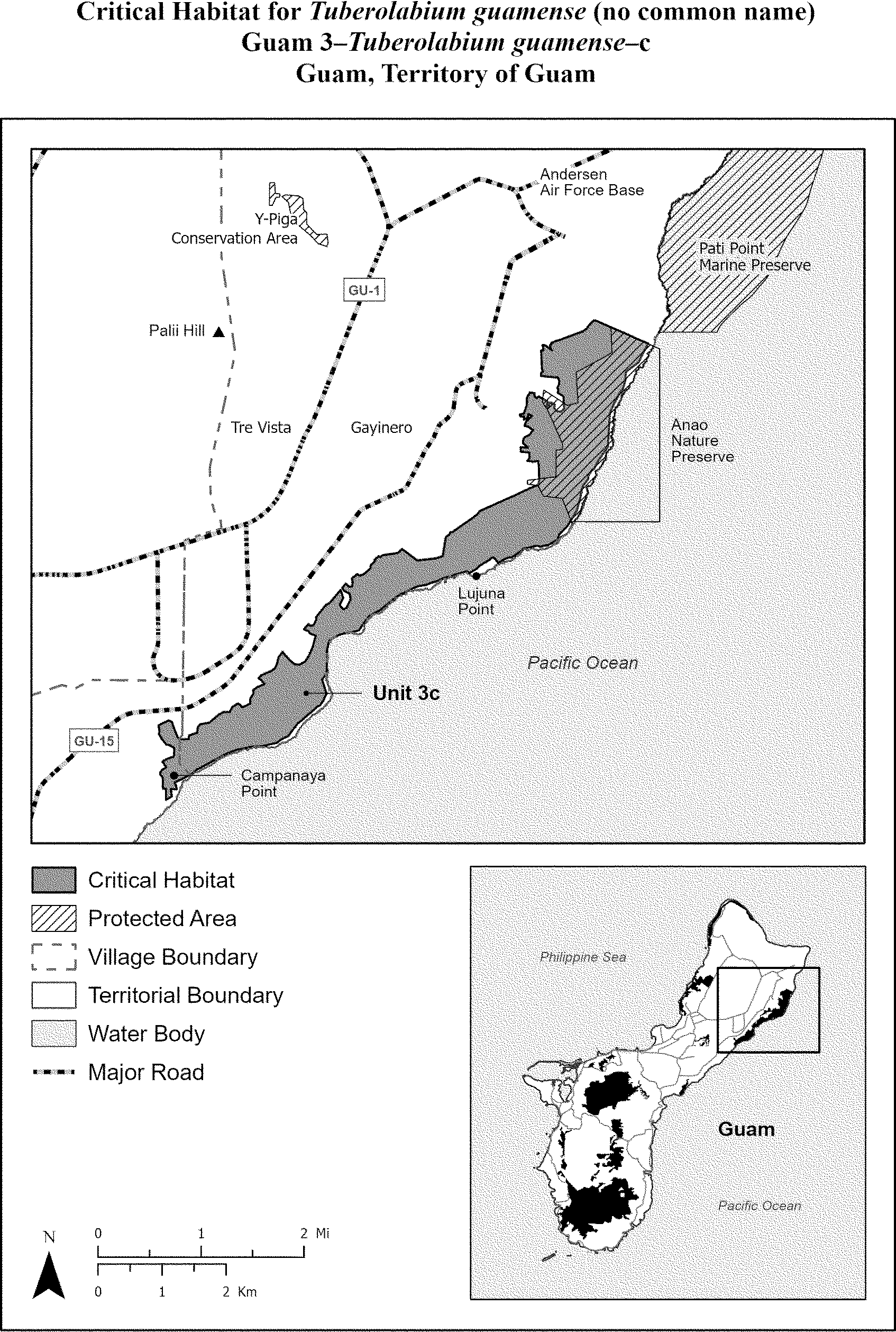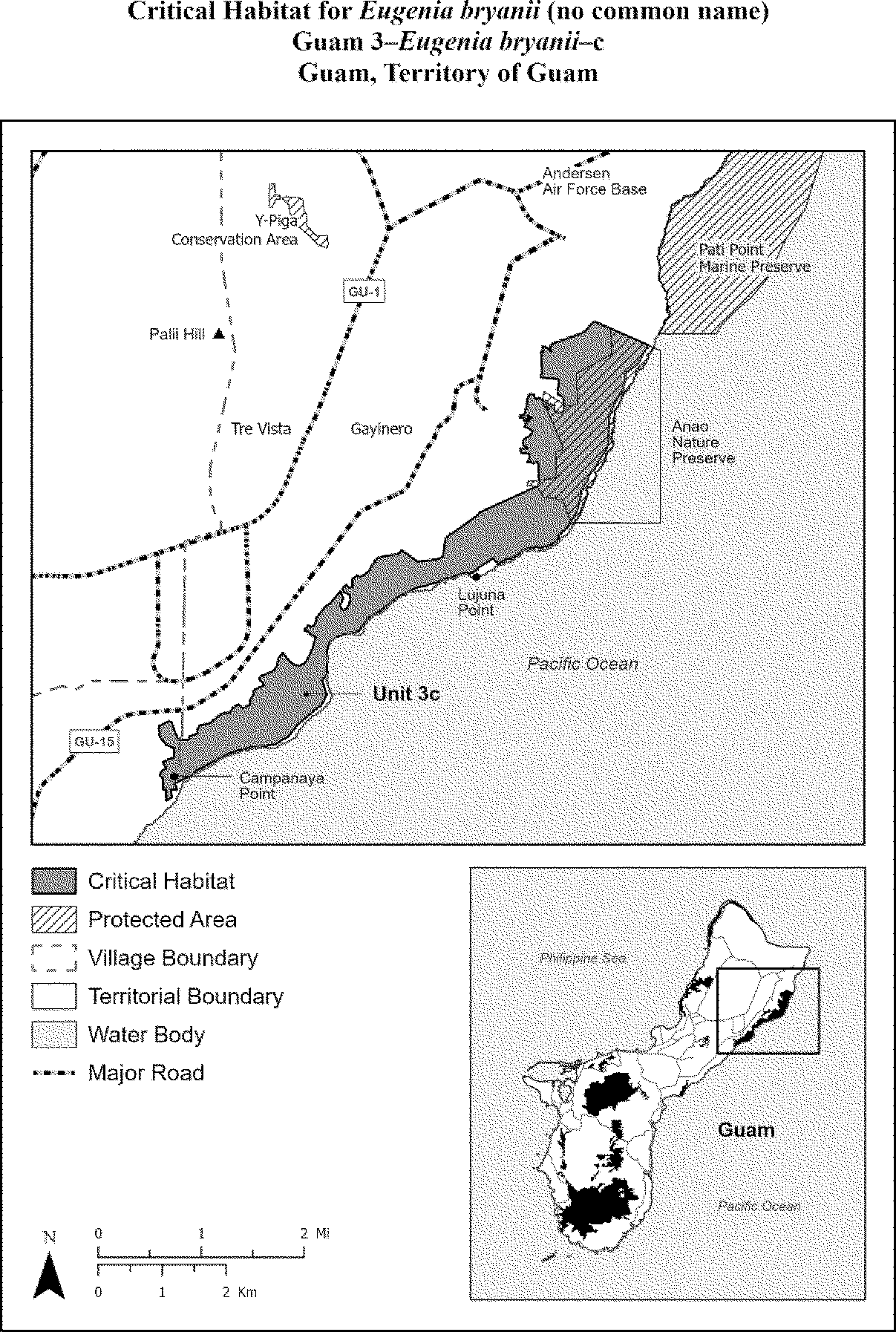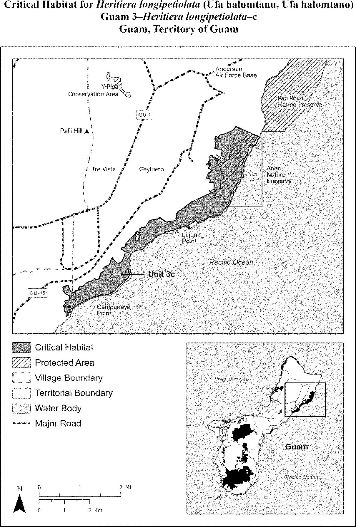 (A) Unit 3c on the island of Guam consists of 2,166 ac (877 ha) and is composed of limestone forests along the northeast coastal edge of the island. The unit begins at the boundary of the Anao Nature Preserve (which is immediately adjacent to the southern end of the Guam NWR boundary) and extends southwest along the coast to Campanaya Point. Landownership includes 1,549 ac (627 ha) of Territory government lands, 270 ac (109 ha) in private ownership, and 347 ac (141 ha) that are uncategorized. The northeastern portion of this unit overlaps the Anao Nature Preserve.