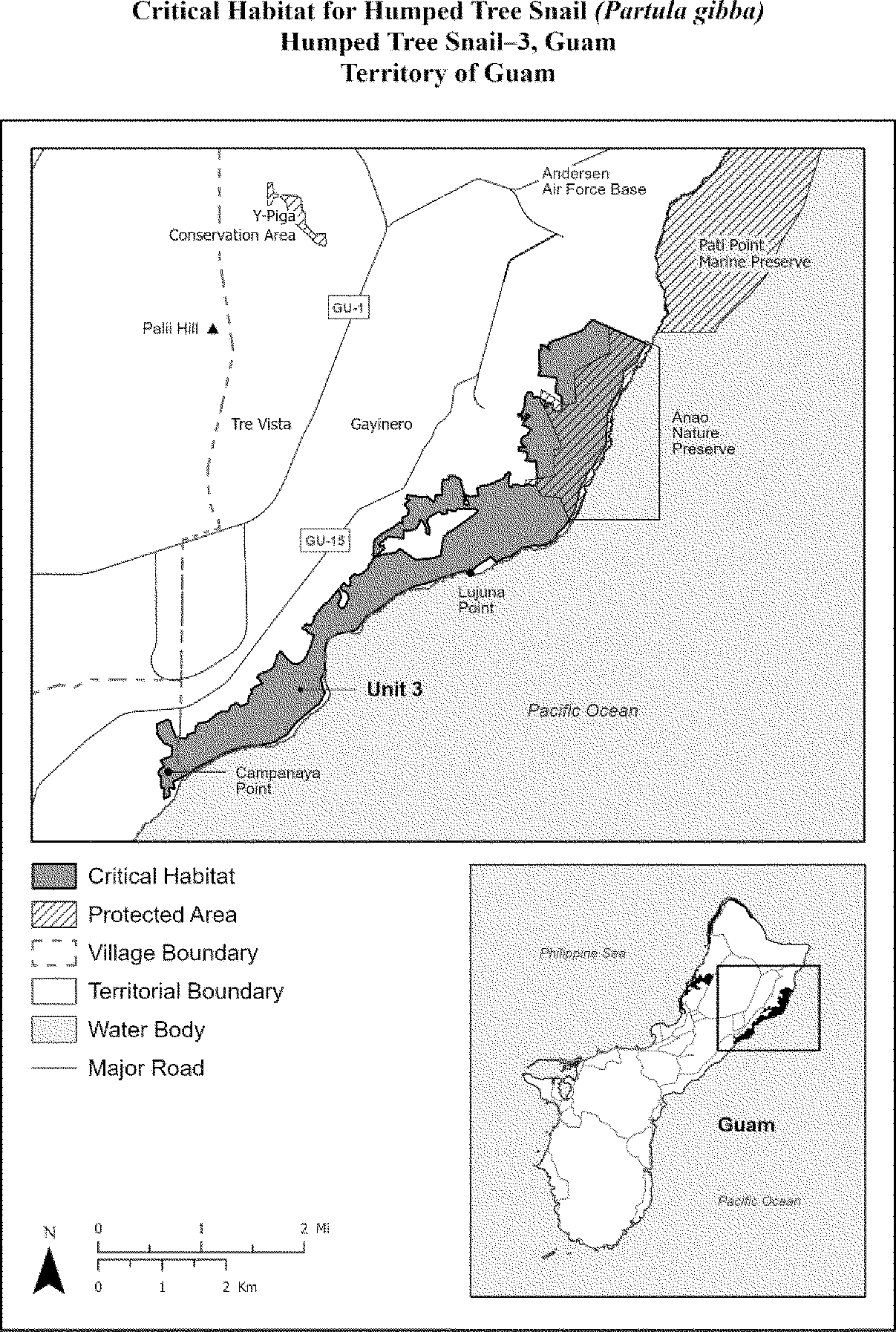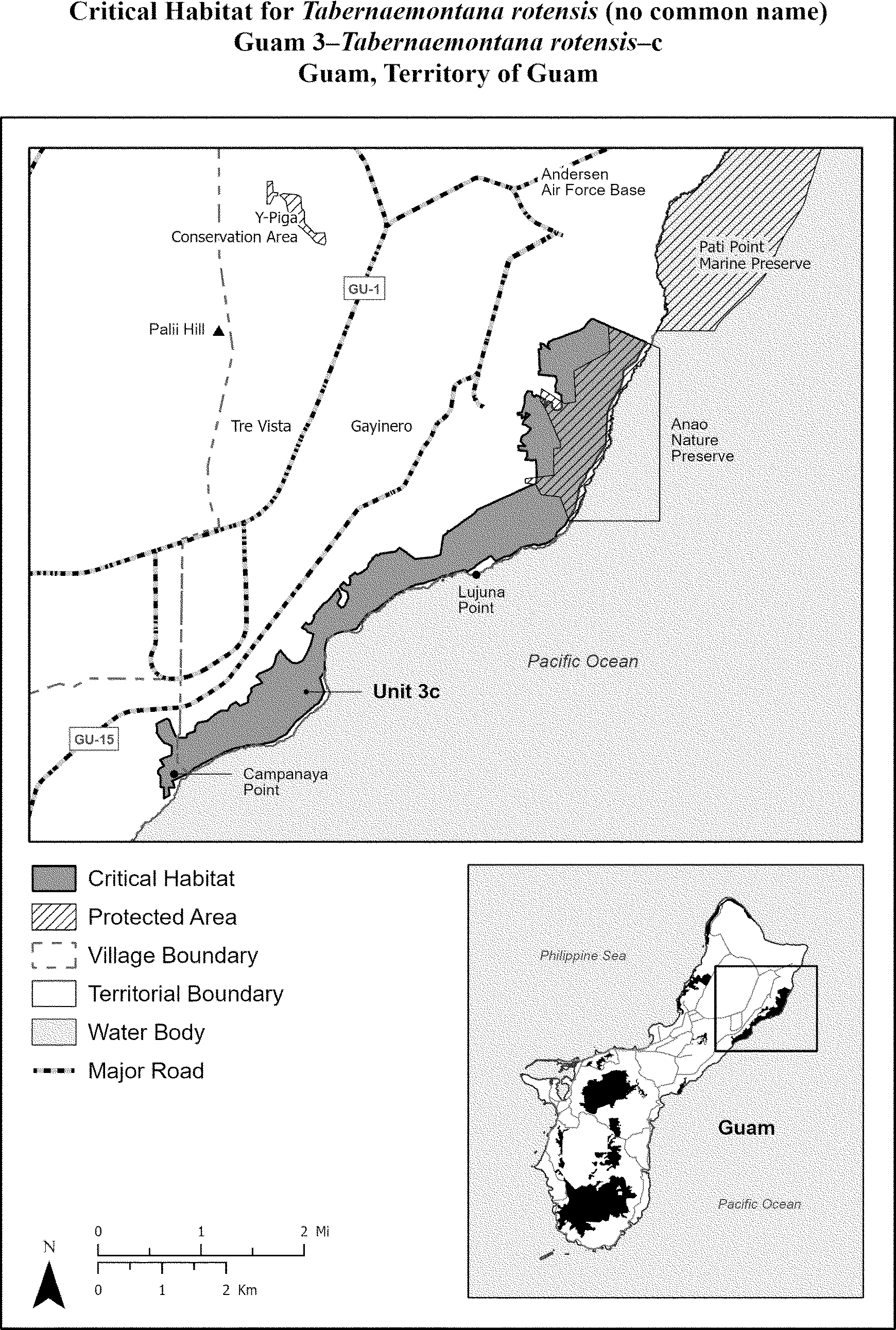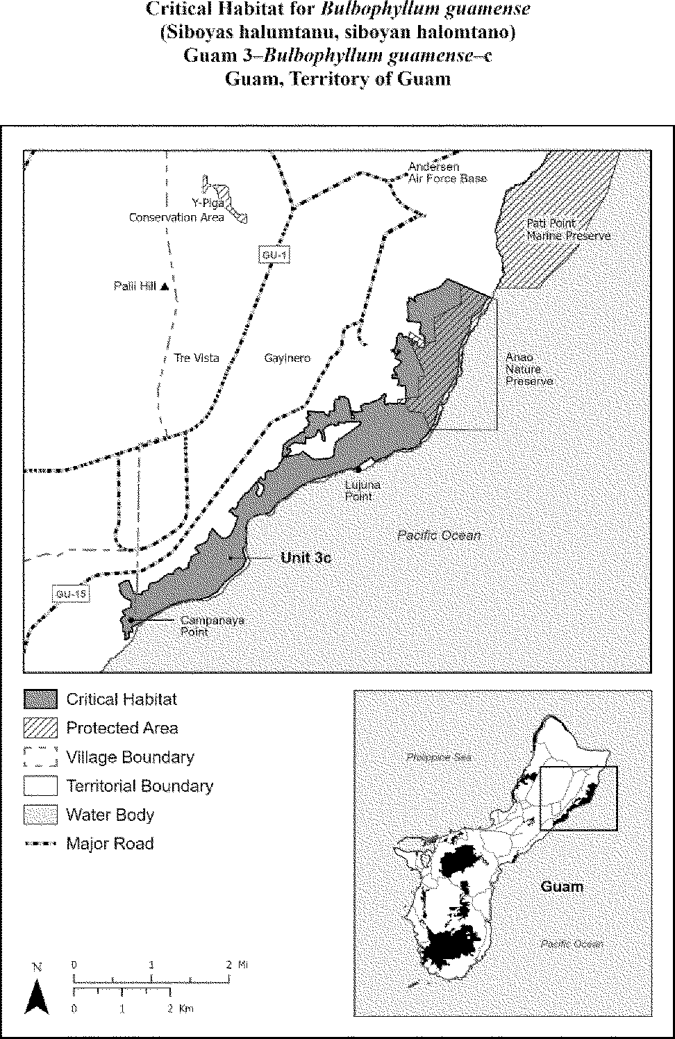 (A) Unit 3c on the island of Guam consists of 2,166 ac (877 ha) and is composed of limestone forests along the northeast coastal edge of the island. The unit begins at the boundary of the Anao Nature Preserve (which is immediately adjacent to the southern end of the Guam NWR boundary) and extends southwest along the coast to Campanaya Point. Landownership includes 1,549 ac (627 ha) of Territory government lands, 270 ac (109 ha) in private ownership, and 347 ac (141 ha) that are uncategorized. The northeastern portion of this unit overlaps the Anao Nature Preserve.