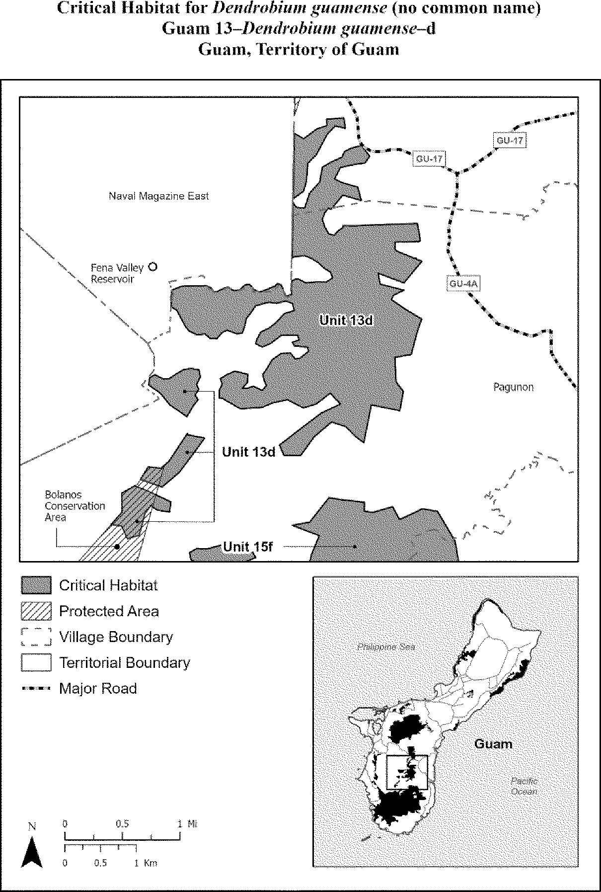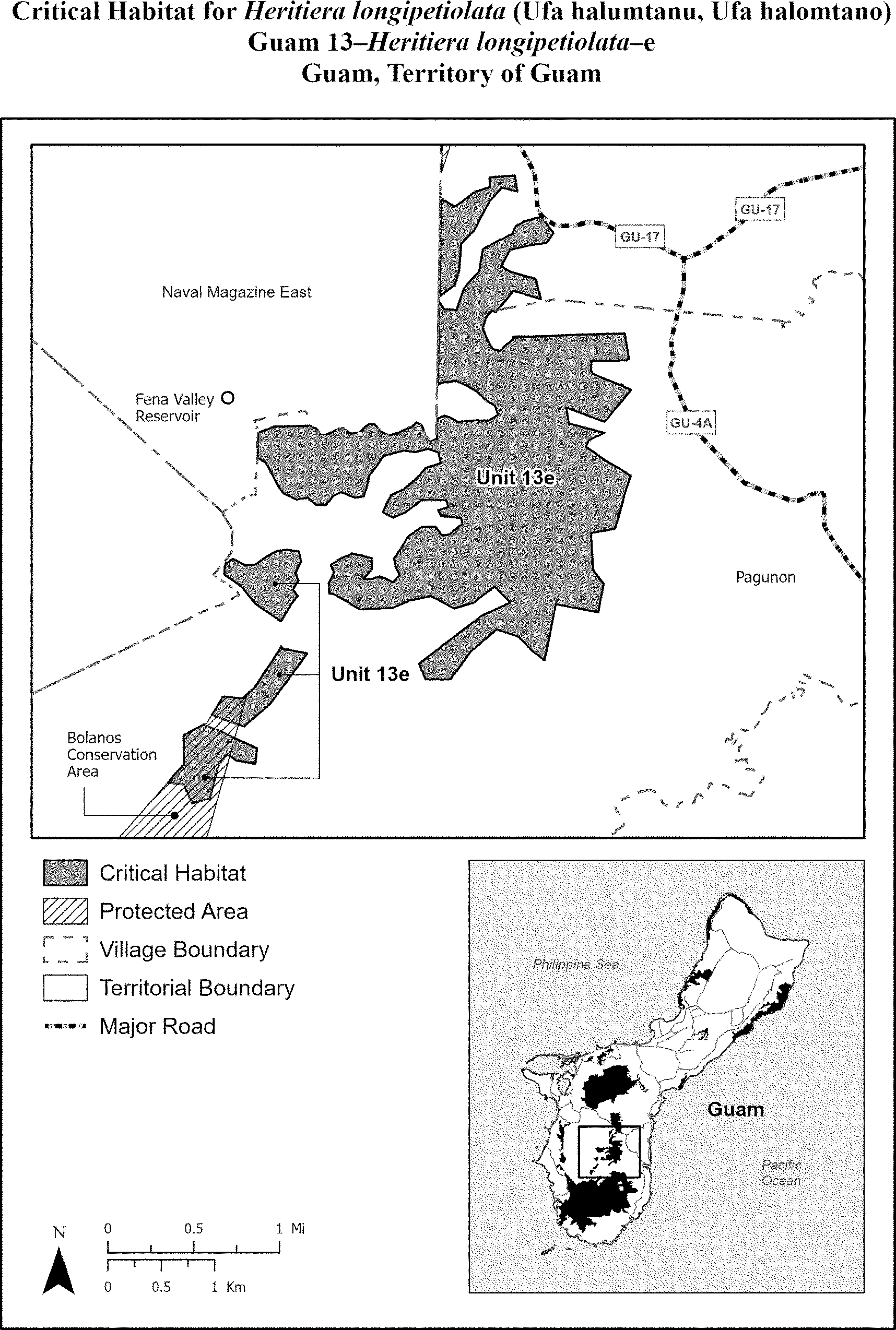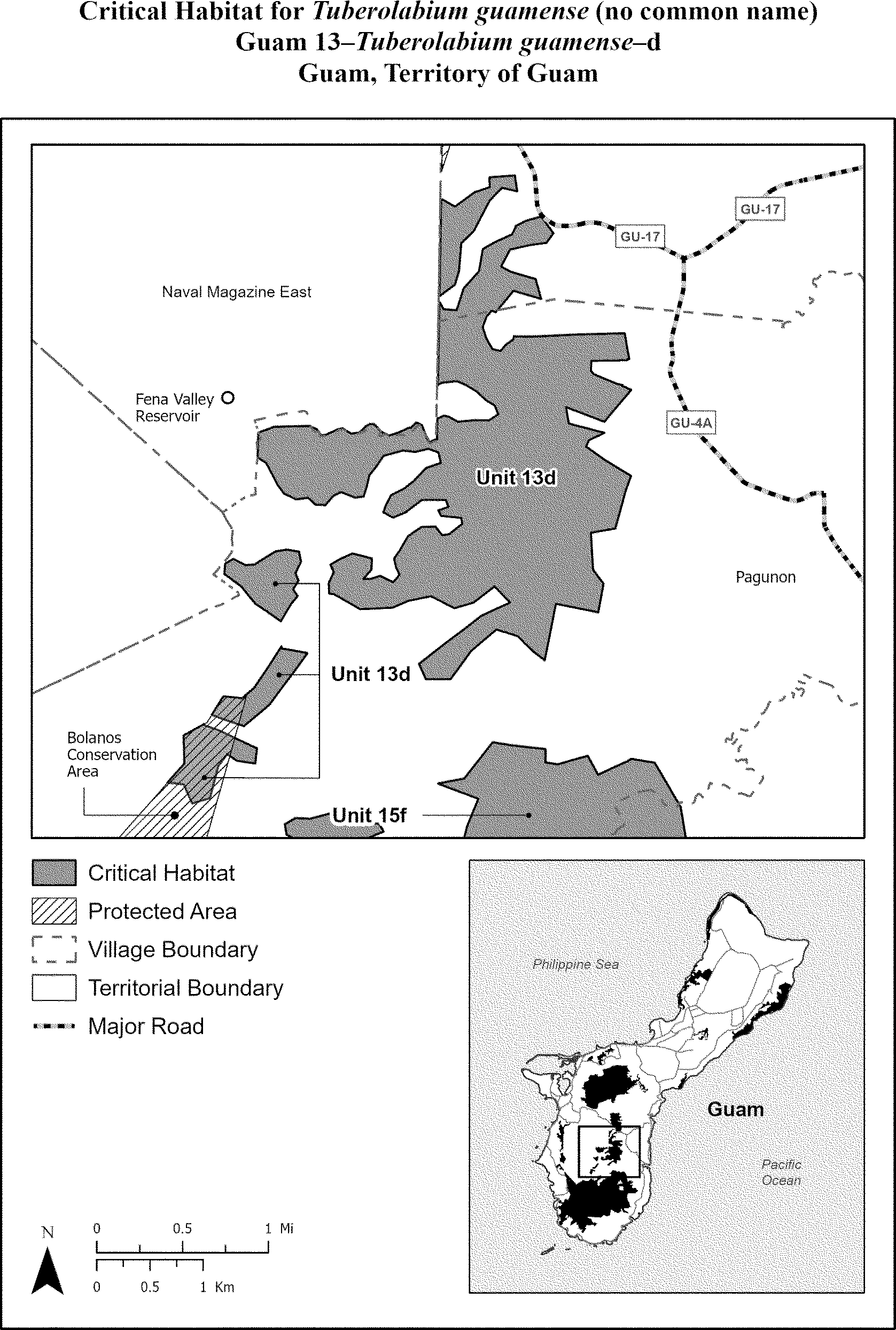 (A) Unit 13d on the island of Guam consists of 1,726 ac (698 ha) and is composed of four segments of volcanic forests on the southeastern side of the island. The unit extends from Route 17 south past Naval Magazine East and Fena Valley Reservoir along the western boundaries and towards Pagunon on the eastern boundary. The unit also extends along the Maagas, Mahlac, and Sagge Rivers and their tributaries (which are not represented on the map due to unavailable data layers). Landownership includes 142 ac (57 ha) of Territory government lands, 859 ac (348 ha) in private ownership, and 725 ac (293 ha) that are uncategorized. This unit overlaps the Bolanos Conservation Area.