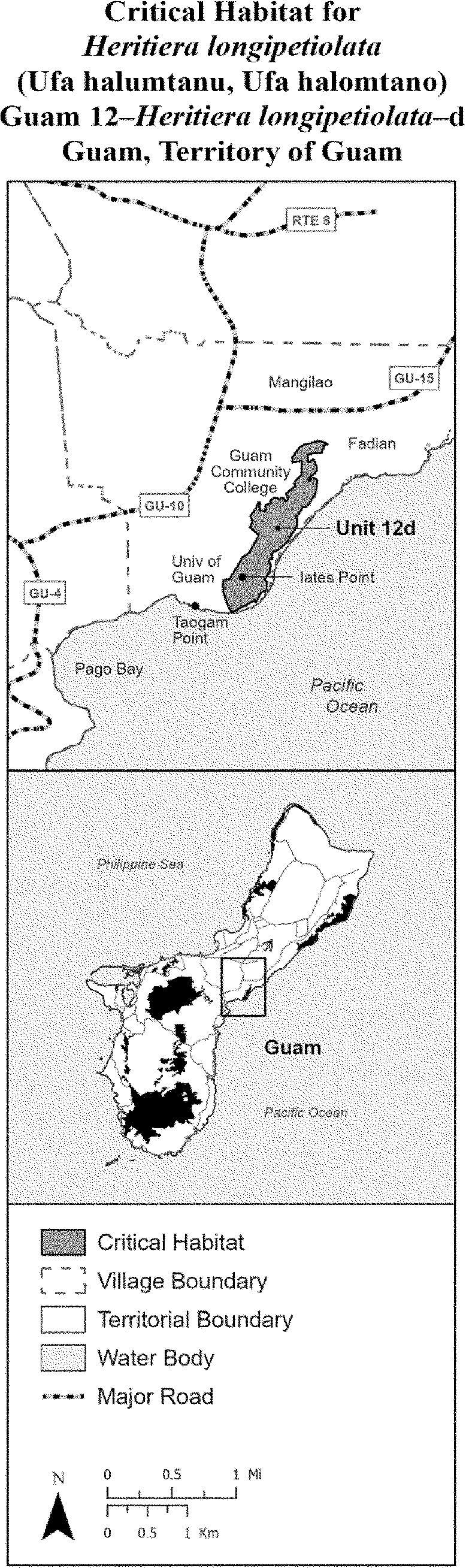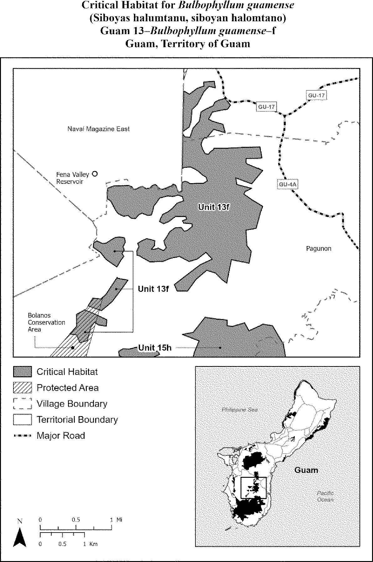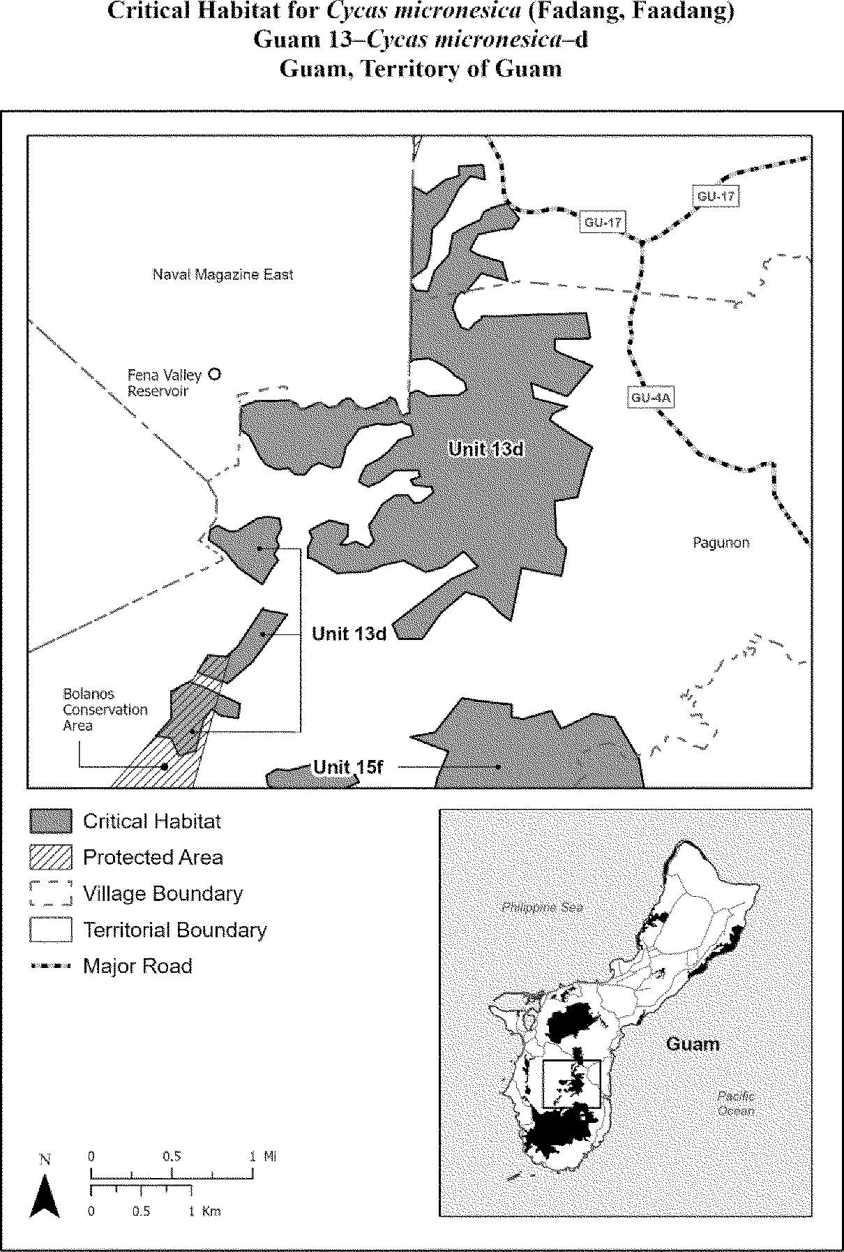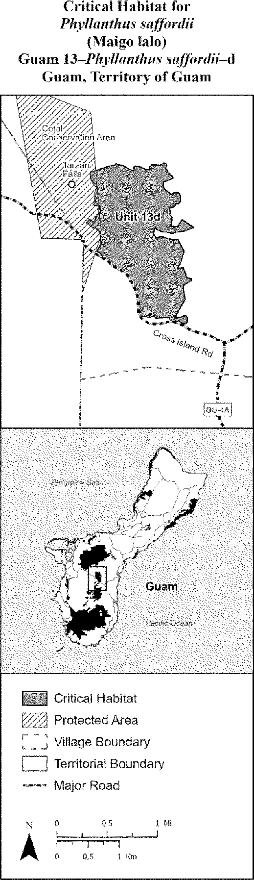 (A) Unit 13d on the island of Guam consists of 1,726 ac (698 ha) and is composed of four segments of volcanic forests on the southeastern side of the island. The unit extends from Route 17 south past Naval Magazine East and Fena Valley Reservoir along the western boundaries and towards Pagunon on the eastern boundary. The unit also extends along the Maagas, Mahlac, and Sagge Rivers and their tributaries (which are not represented on the map due to unavailable data layers). Landownership includes 142 ac (57 ha) of Territory government lands, 859 ac (348 ha) in private ownership, and 725 ac (293 ha) that are uncategorized. This unit overlaps the Bolanos Conservation Area.