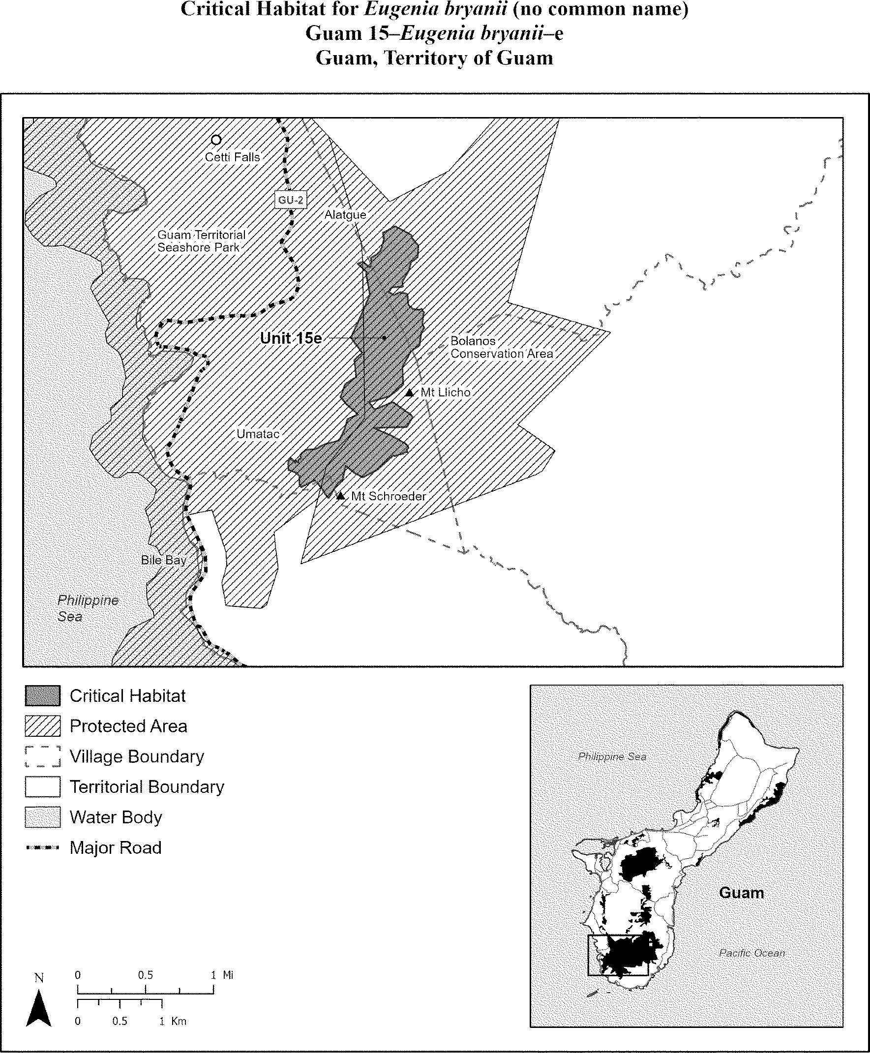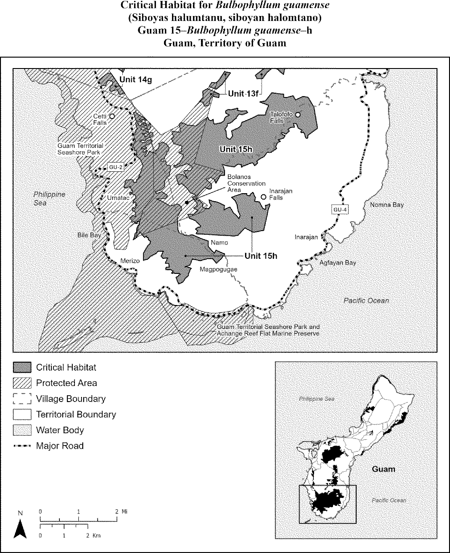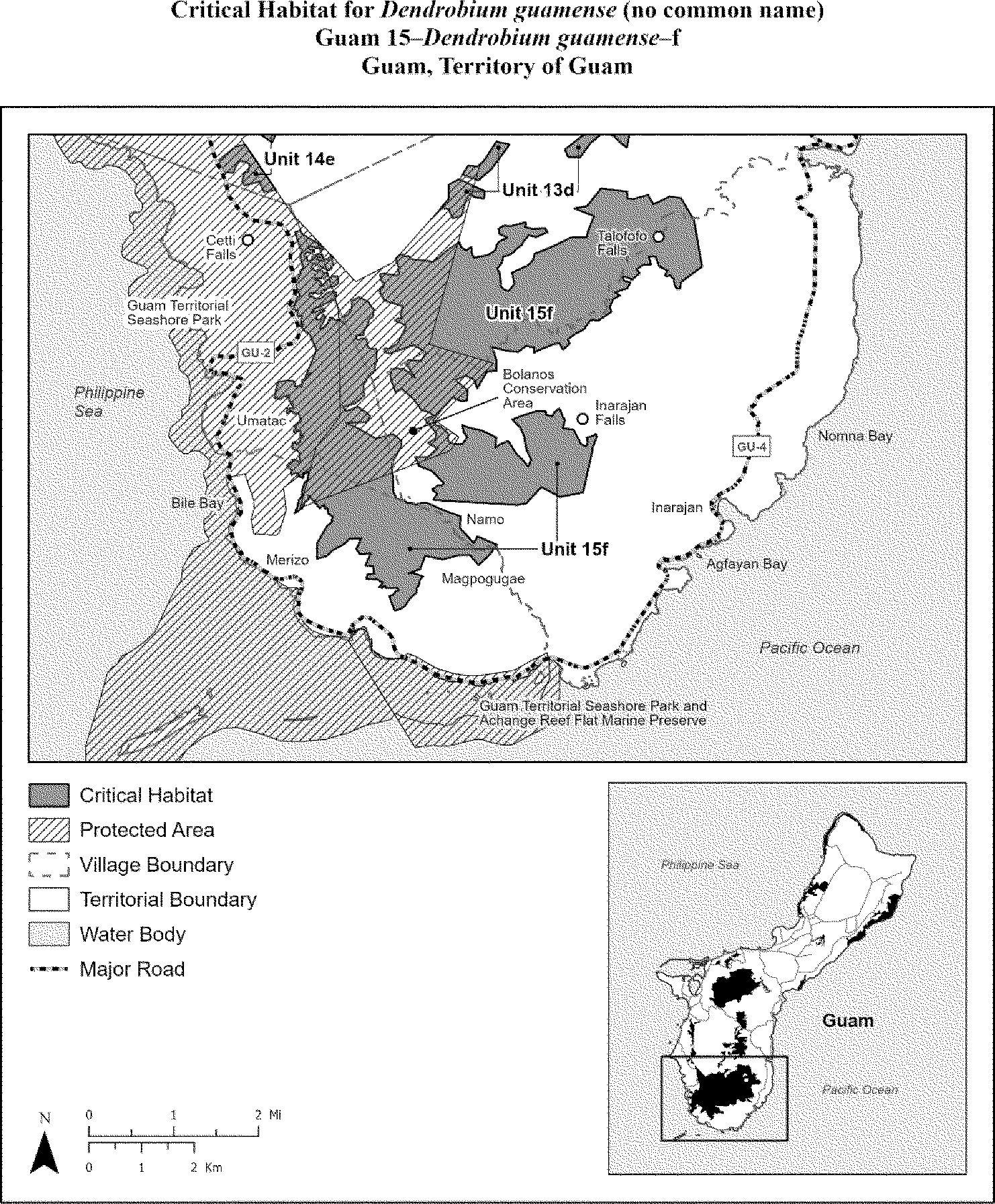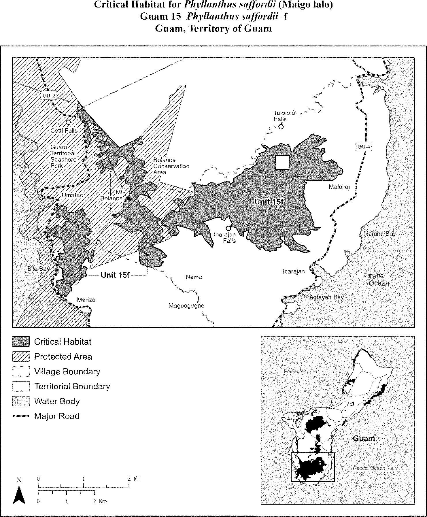 (A) Unit 15f on the island of Guam consists of 6,148 ac (2,488 ha) and is composed of volcanic forests in the southern part of the island. The unit runs from the north of Talofofo Falls along the Ugum and Bubulao Rivers to the south of Namo and runs from the east of Route 2 along the Dante River to Inarajan Falls (the rivers of which are not represented on the map due to unavailable data layers). Another portion of the unit stretches from Cetti Falls in the north through the Bolanos Conservation Area to Magpogugae in the south. Landownership includes 919 ac (372 ha) of Territory government lands, 3,612 ac (1,462 ha) in private ownership, and 1,617 ac (654 ha) that are uncategorized. The central portion of the unit overlaps the Bolanos Conservation Area, and the western portion of the unit overlaps the Guam Territorial Seashore Park.