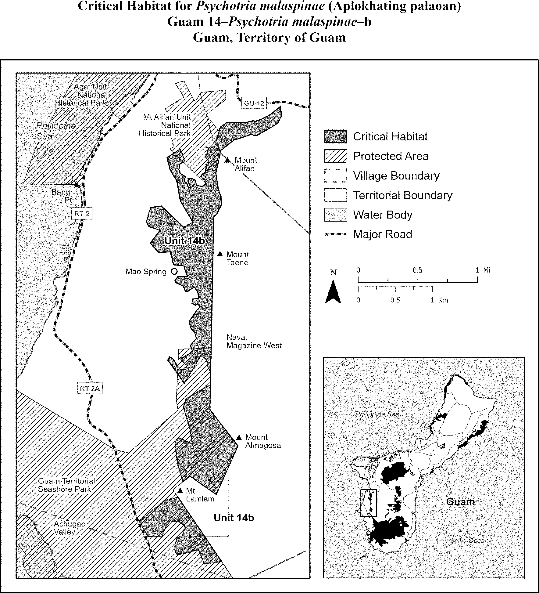 (i) Unit 14b on the island of Guam consists of 629 ac (254 ha) and is composed of three segments of limestone forests on the southwestern side of the island. The unit extends from Route 12 and Mt. Alifan in the north, running along the border of Naval Magazine West and ending south of Mt. Lamlam at Route 2A. Landownership includes 16 ac (6 ha) of Federal lands (War in the Pacific National Historical Park), 84 ac (34 ha) of Territory government lands, 344 ac (139 ha) in private ownership, and 185 ac (75 ha) that are uncategorized. The northern portion of the unit overlaps the Mt. Alifan unit of War in the Pacific National Historical Park. The southern portion of the unit overlaps the Guam Territorial Seashore Park.