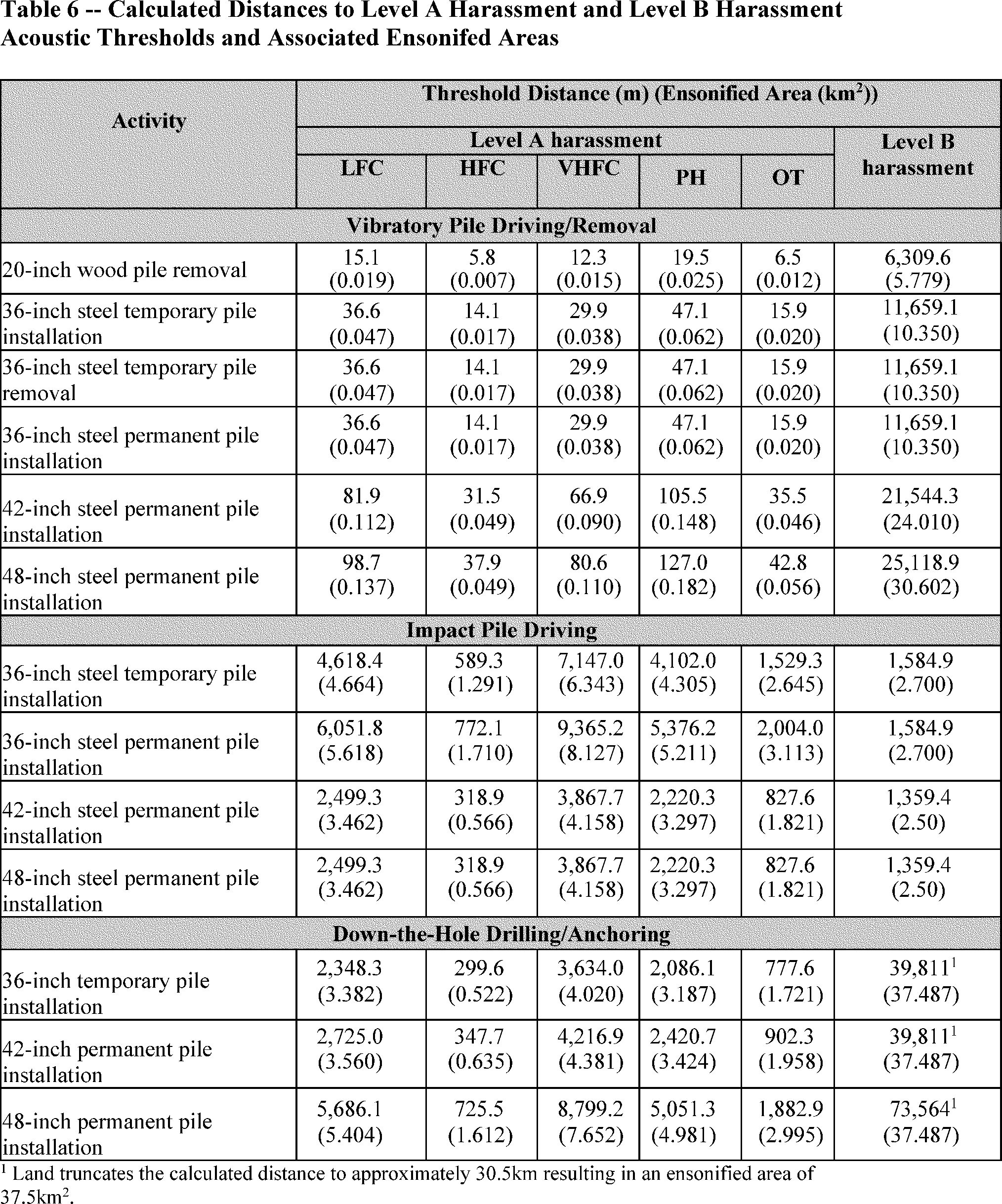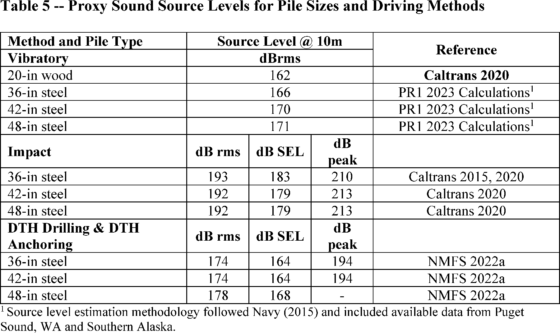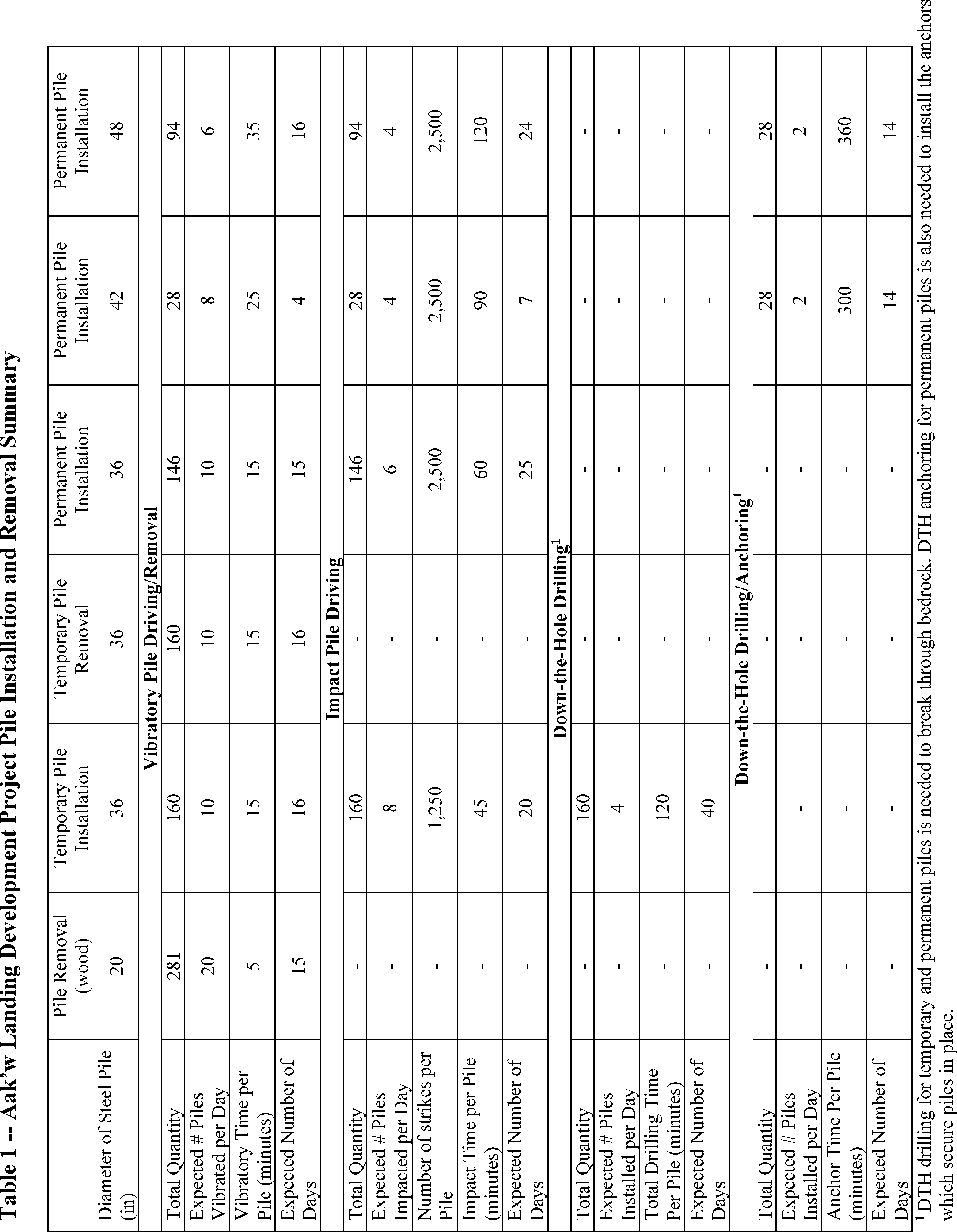 Piles installed below −60 ft would also require DTH drilling given the bedrock layer is shallow, and therefore vibratory and impact driving alone is insufficient to drive the piles to their needed depth. Unlike permanent piles, the piles would not be anchored using a DTH drilling method as they are temporary. In their application, TMC assumes all 160 piles require DTH drilling. Temporary piles would be extracted using the vibratory hammer. Details regarding pile installation and removal specifications are provided in table 1.