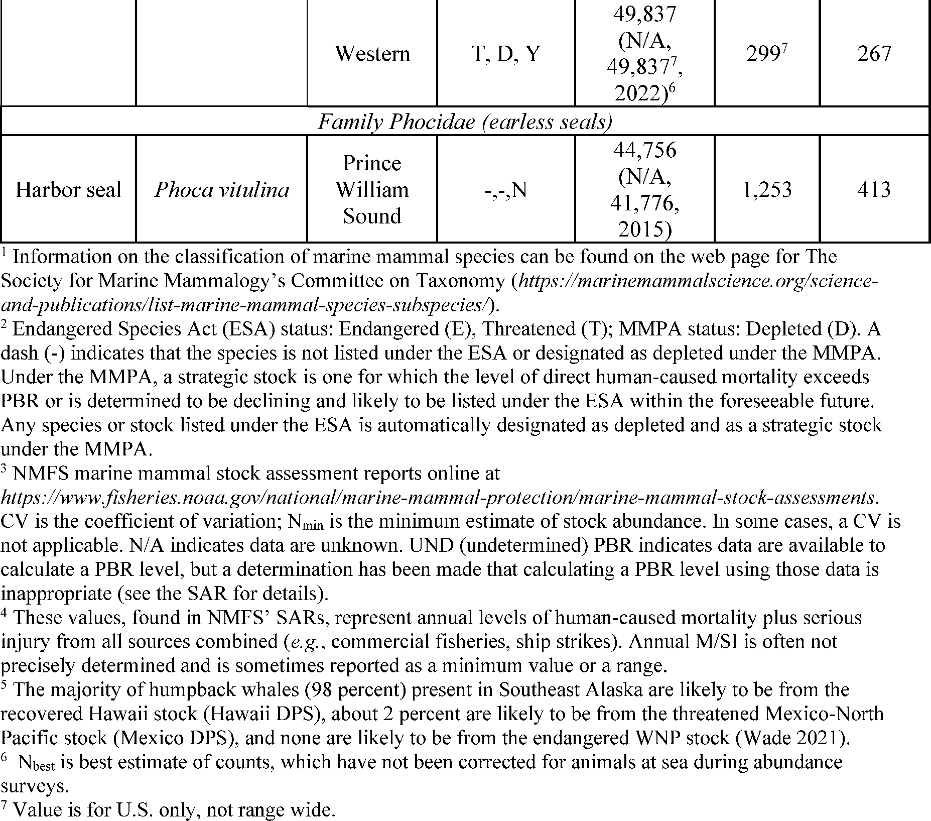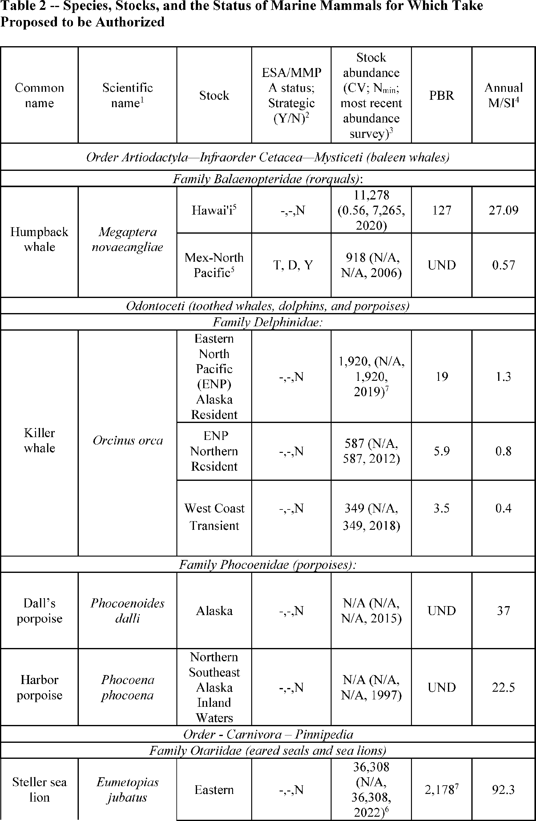 Table 2 lists all the species or stocks for which take may occur and is proposed to be authorized and summarizes information related to the population or stock, including regulatory status under the MMPA and Endangered Species Act (ESA), as well as the potential biological removal (PBR), where known. The MMPA defines PBR as the maximum number of animals, not including natural mortalities, which may be removed from a marine mammal stock while allowing that stock to reach or maintain its optimum sustainable population (as described in NMFS' SARs). While no serious injury or mortality is anticipated or proposed to be authorized, the PBR and annual mortality and serious injury (M/SI) from anthropogenic sources are included here as gross indicators of the status of the species or stocks and other threats.