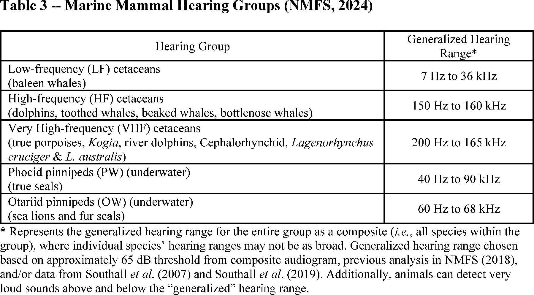 Hearing is the most vital sensory modality for marine mammals underwater, and exposure to anthropogenic sound can have deleterious effects. To appropriately assess the potential effects of sound exposure, it is necessary to understand the frequency ranges that marine mammals can hear. Not all marine mammal species have equal hearing capabilities or hear over the same frequency range (e.g., Richardson et al., 1995; Wartzok and Ketten, 1999; Au and Hastings, 2008). To reflect this, Southall et al. (2007; 2019) recommended that marine mammals be divided into hearing groups based on directly measured (behavioral or auditory evoked potential techniques) or estimated hearing ranges (behavioral response data, anatomical modeling, etc.). Subsequently, NMFS (2018, 2024) described generalized hearing ranges for these marine mammal hearing groups. Generalized hearing ranges were chosen based on the approximately 65-decibel (dB) threshold from the normalized composite audiograms, except for lower limits for low-frequency cetaceans, where the lower bound was deemed to be biologically implausible, and the lower bound from Southall et al. (2007) was retained. In October 2024, NMFS published its 2024 Updated Technical Guidance, which includes updated thresholds and weighting functions to inform auditory injury estimates and replaces the 2018 Technical Guidance referenced above. This 2024 Updated Technical Guidance represents the best available science. Marine mammal hearing groups and their associated hearing ranges are provided in table 3.