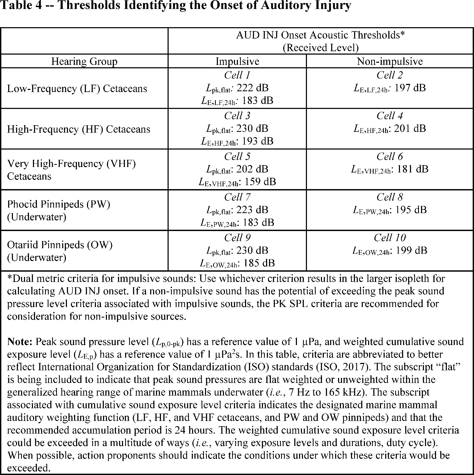 NMFS defines a noise-induced threshold shift (TS) as a change, usually an increase, in the audibility threshold at a specified frequency or portion of an individual's hearing range above a previously established reference level (NMFS, 2018, 2024). The amount of threshold shift is customarily expressed in dB. A TS can be permanent or temporary. As described in NMFS (2018, 2024), there are numerous factors to consider when examining the consequence of TS, including, but not limited to, the signal temporal pattern (e.g., impulsive or non-impulsive), the likelihood an individual would be exposed for a long enough duration or to a high enough level to induce a TS, the magnitude of the TS, the time to recovery (seconds to minutes or hours to days), the frequency range of the exposure (i.e., spectral content), the hearing frequency range of the exposed species relative to the signal's frequency spectrum (i.e., how the animal uses sound within the frequency band of the signal; e.g., Kastelein et al., 2014), and the overlap between the animal and the source (e.g., spatial, temporal, and spectral).