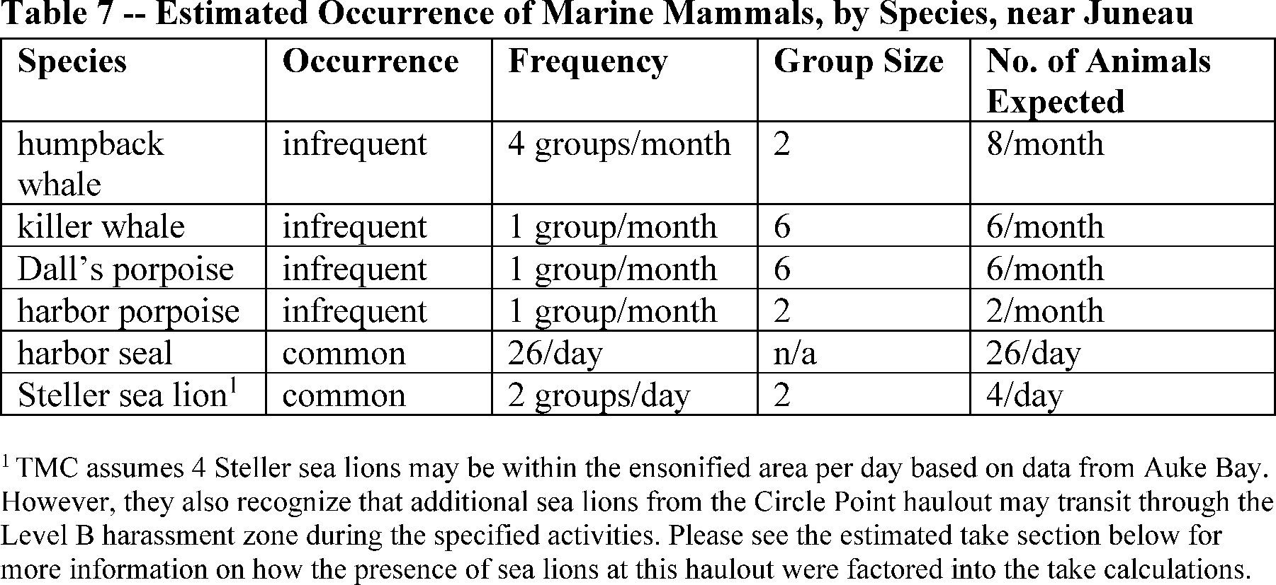 As indicated above, table 2 lists the 6 species (10 total stocks) that temporally and spatially co-occur with the specified activities to the degree that incidental take could potentially occur. TMC's application provides general information on each species and stock provided in table 2 as well as more site-refined information as it relates to the analysis, including information on biologically important areas (BIAs) near the project area. In summary, the occurrence of marine mammals in the project area is species specific with some species (e.g., Dall's porpoise, killer whales) occasionally present while others exhibit more frequent occurrence (e.g., pinnipeds). Marine mammals utilize the project area primarily for foraging and transiting. The northern portion of the Frederick Sound and Stephens Passage humpback whale foraging BIA, which is active June through October, overlaps with the ensonified areas for all DTH drilling activities and vibratory pile driving of 48-in piles. NMFS incorporates this information by reference and therefore does not repeat it here. Please see section 4 in TMC's application for more detailed information on each species.
