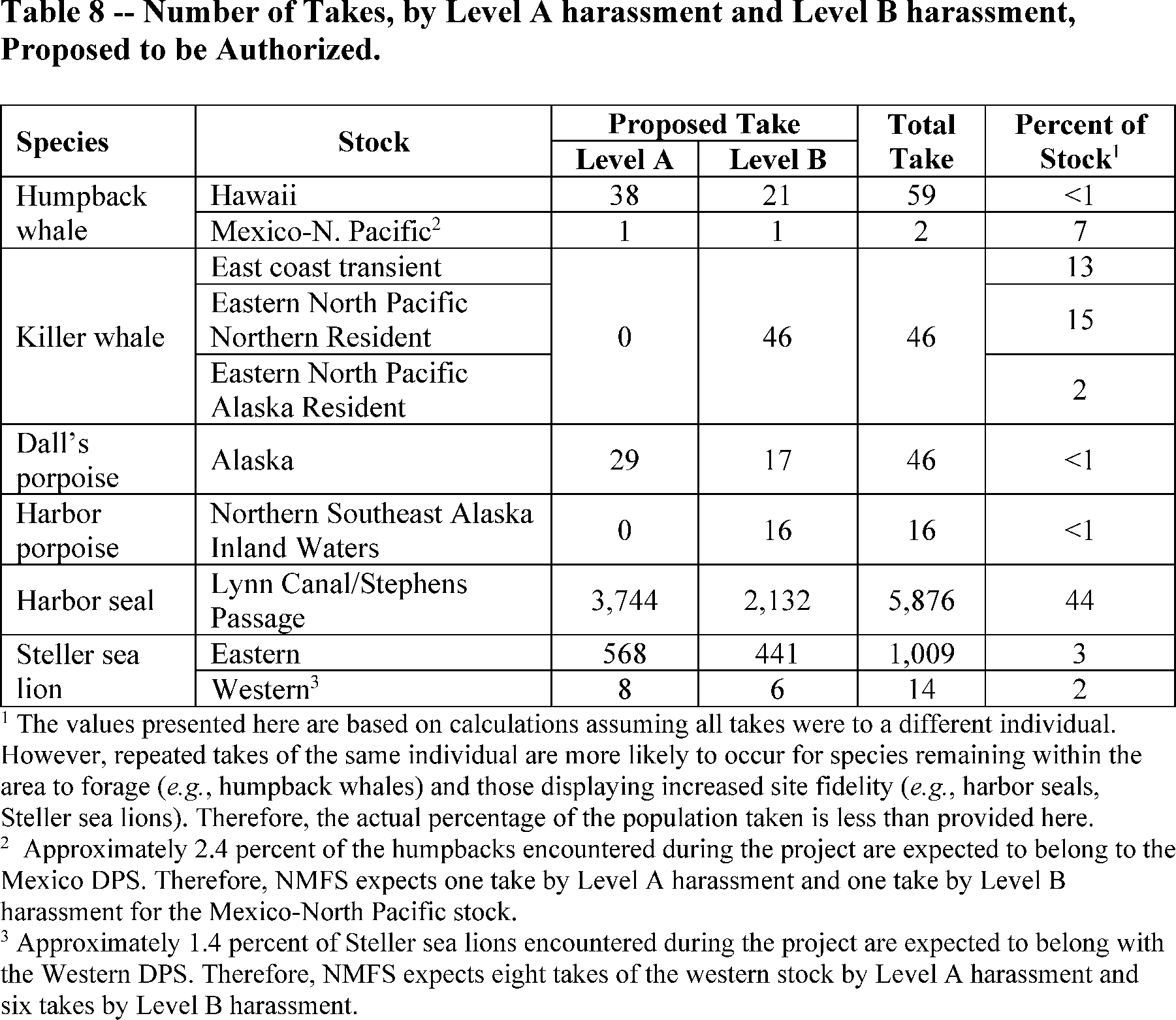 The percentage of the population that may be harassed incidental to the specified activities assuming each take is of a different individual is provided in table 8. The total amount of take proposed to be authorized is less than one-third for 9 of the 10 stocks impacted (see table 8). The total number of takes proposed to be authorized for the Lynn Canal/St. Stephens Passage stock of harbor seals is approximately 44 percent of the total stock abundance estimate (13,388), assuming each take is to a different individual (i.e., no repeated takes to the same individual). However, it is likely that a relatively small subset of harbor seals would be incidentally harassed repeatedly by the specified activities, and therefore, the number of individuals taken is likely less than one-third of our stock. The stock range extends over approximately 4500 km 2 and harbor seals are known to exhibit residency patterns such that repeated exposures are a likely outcome. Overall, NMFS anticipates this percentage to be lower than provided in table 8 for most species as repeated takes of individuals is likely to occur given known persistence in the area, particularly for pinnipeds.