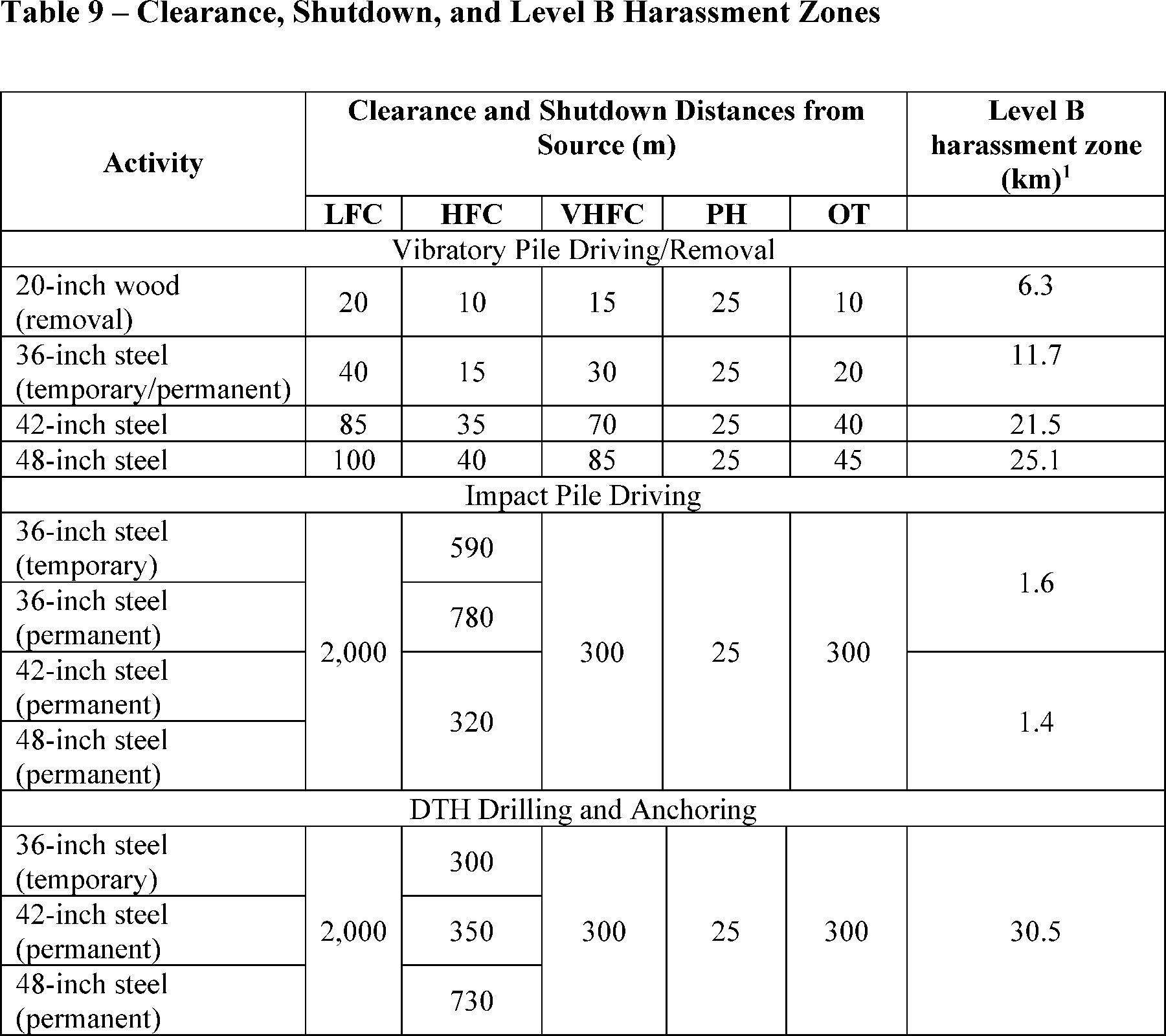 TMC proposed, and NMFS would require, the establishment of clearance and shutdown zones identified in table 10 for pile removal, installation, DTH drilling, and DTH anchoring. The purpose of “clearance” of a particular zone is to prevent potential instances of auditory injury and more severe behavioral disturbance the maximum extent practicable by delaying the commencement of impact pile driving if marine mammals are detected within certain pre-defined distances from the pile being installed. The purpose of a shutdown is to prevent a specific acute impact, such as auditory injury or severe behavioral disturbance of sensitive species, by halting the activity. Additionally, to avoid unauthorized takes, TMC would delay an activity or shut down in the event that a species for ( printed page 20133) which take is not authorized or for which take has been reached is observed within or entering any designated harassment zone. If pile driving or DTH activities are delayed or halted due to the presence of a marine mammal, the activity may not commence or resume until either the animal has voluntarily exited and been visually confirmed beyond the clearance and shutdown zones indicated in table 9 or 15 minutes have passed without re-detection of the animal.