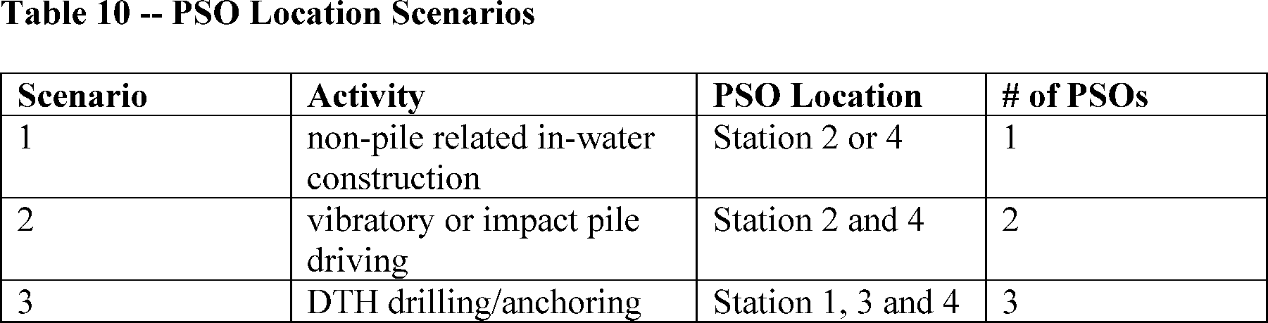 All PSOs must be NMFS-approved and have no other assigned tasks during ( printed page 20135) monitoring periods. At least one PSO must have prior experience performing the duties of a PSO during the specified activities. At least two PSOs will be on duty during pile driving activities and at least three PSOs will be on-duty during DTH drilling and DTH anchoring. Where a team of three or more PSOs is required, a lead observer or monitoring coordinator would be designated. The lead observer must have prior experience working as a marine mammal observer during construction. Additional PSOs may be employed during periods of low or obstructed visibility to ensure the entirety of the shutdown zone is monitored.
