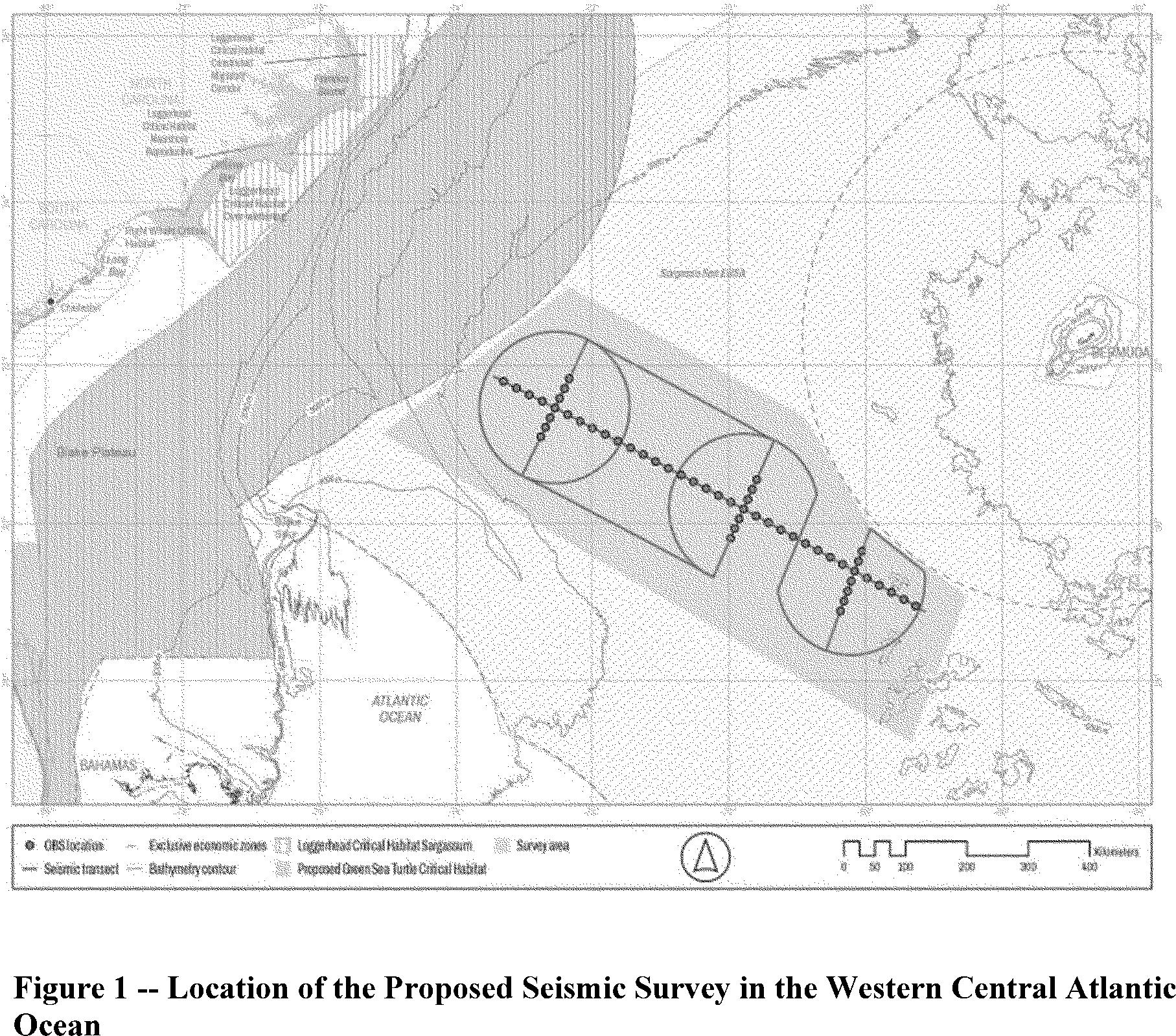 Approximately 4,264 km of seismic acquisition are proposed (691 km of 2-D MCS seismic reflection data and 3,573 km of OBS refraction data). All 52 OBSs will be deployed at the beginning of the survey and recovered at the end after acquiring all seismic data.