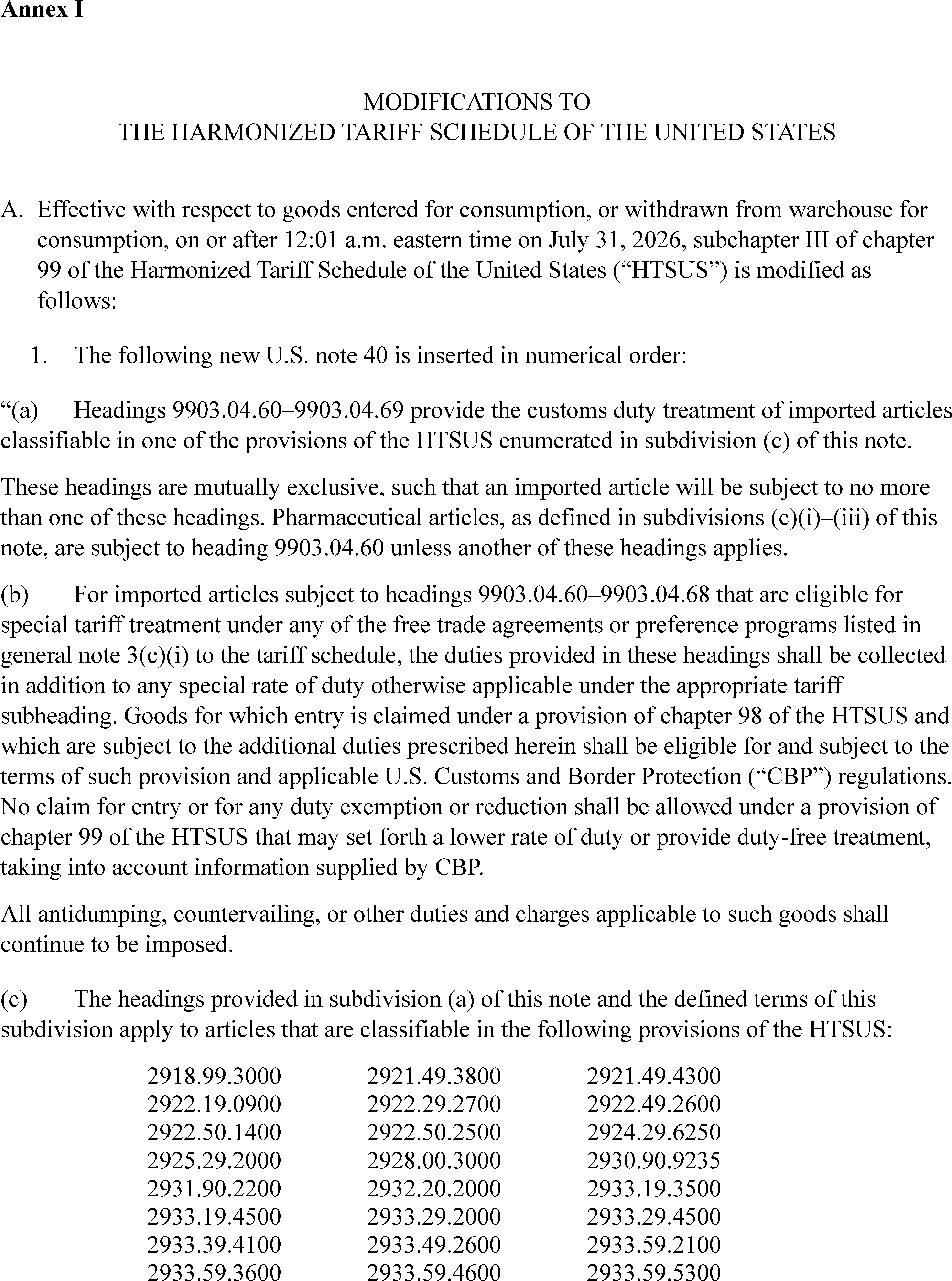 (c) The ad valorem duty rate for patented pharmaceuticals and associated pharmaceutical ingredients, as listed in Annex I to this proclamation, shall be 15 percent for products of Japan, the European Union, the Republic of Korea, and Switzerland and Liechtenstein jointly, unless a lower rate applies under clause (3) of this proclamation. The tariff rate on patented pharmaceuticals and associated pharmaceutical ingredients for products of the United Kingdom shall be 10 percent and then reduce to zero to the extent required by any future agreement between the United States ( printed page 18186) and the United Kingdom on pharmaceutical pricing. The Secretary shall publish a Federal Register notice should the rate for the United Kingdom be reduced to zero.