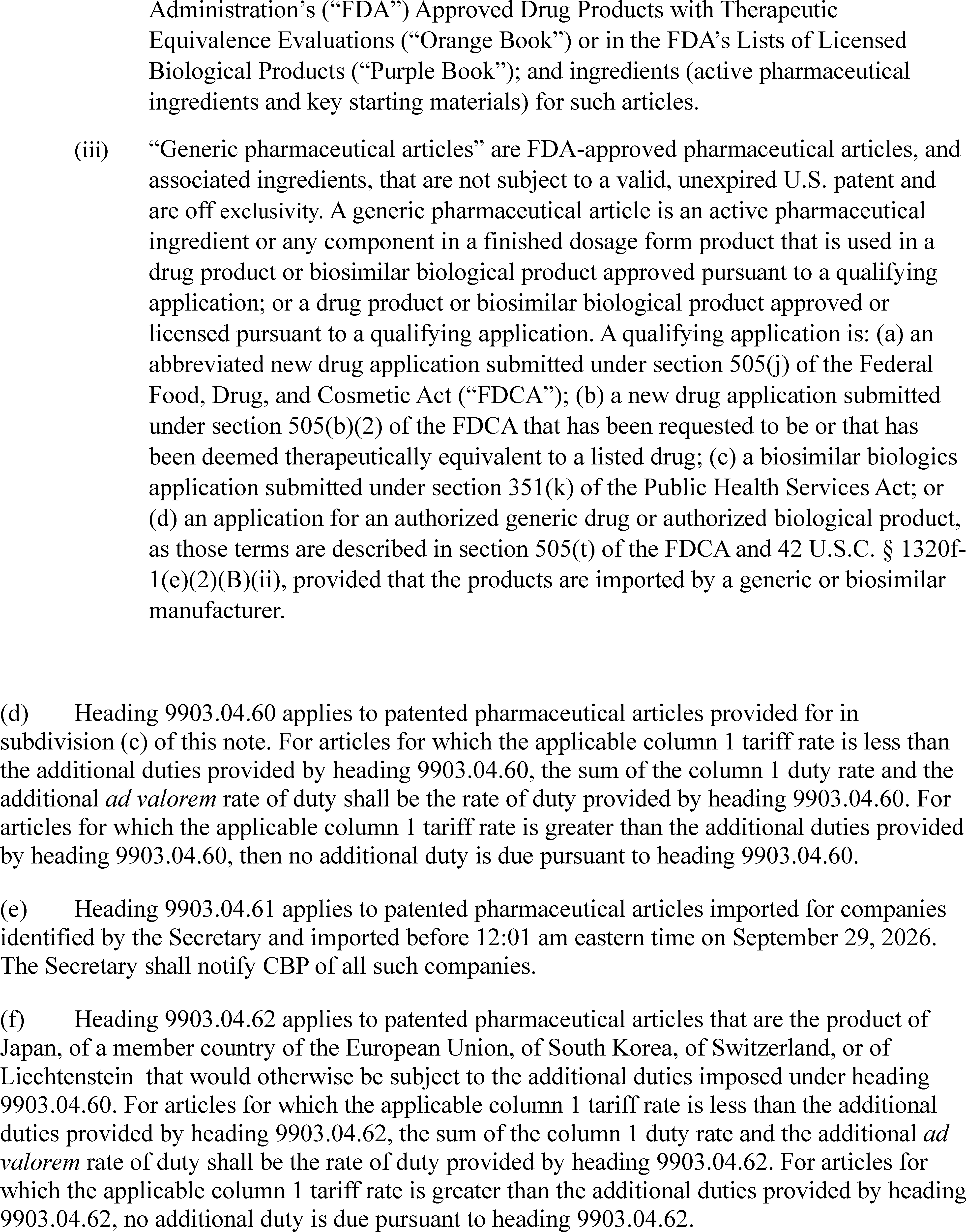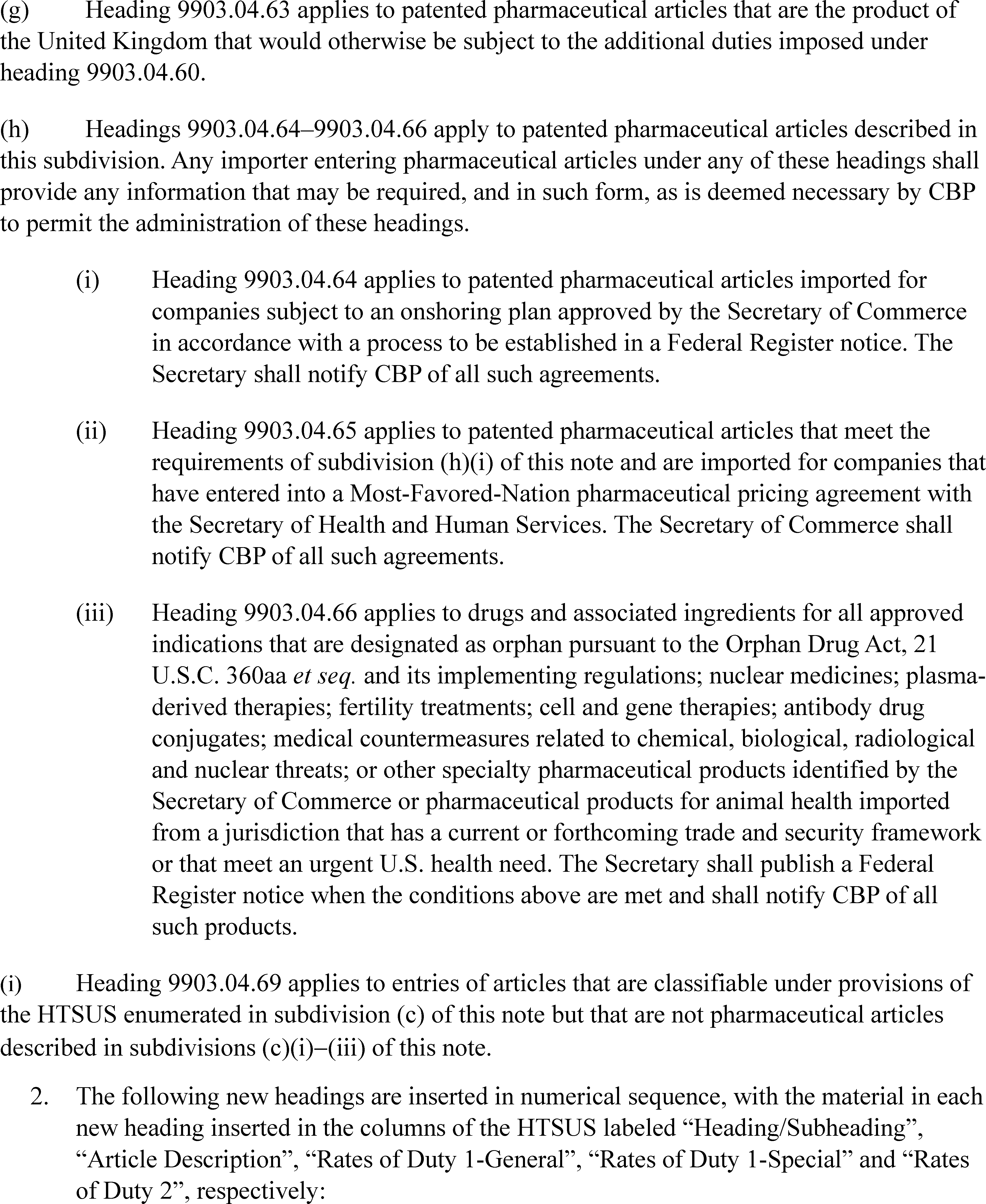 (d) The ad valorem tariff rate shall be zero for drugs and associated ingredients, where all approved indications are designated as orphan pursuant to the Orphan Drug Act, 21 U.S.C. 360aa et seq., and its implementing regulations; nuclear medicines; plasma derived therapies; fertility treatments; cell and gene therapies; antibody drug conjugates; medical countermeasures related to chemical, biological, radiological, and nuclear threats; or other specialty pharmaceutical products to be identified by the Secretary, as well as pharmaceutical products for animal health, provided that the Secretary, in consultation with the United States Trade Representative (Trade Representative) and the Secretary of Health and Human Services, determines that: (1) they are products of a jurisdiction that has a current or forthcoming trade and security framework agreement as referenced in Executive Order 14346 of September 5, 2025 (Modifying the Scope of Reciprocal Tariffs and Establishing Procedures for Implementing Trade and Security Agreements), or (2) they meet an urgent United States health need. The Secretary shall publish a Federal Register notice whenever he makes such a determination.