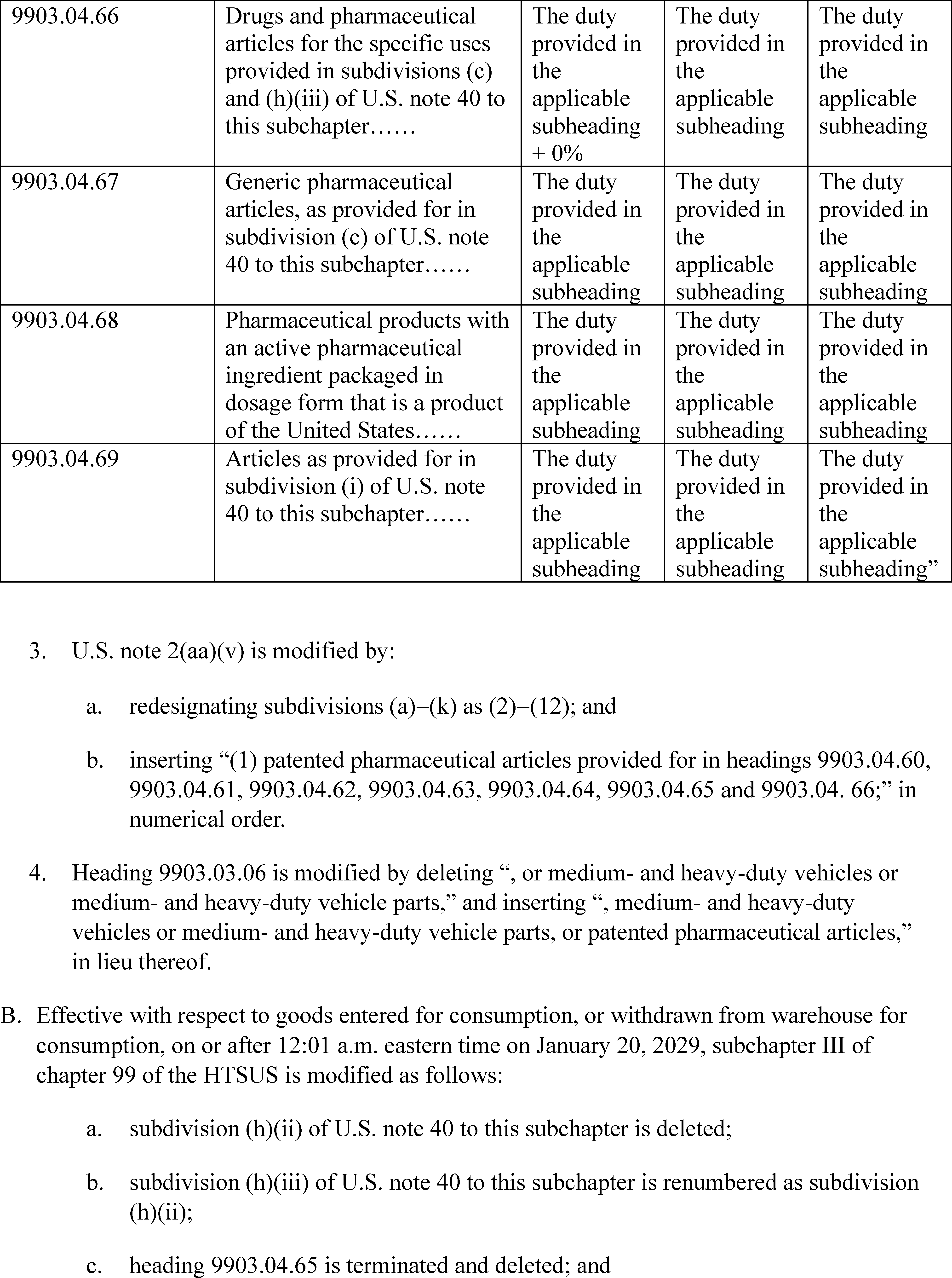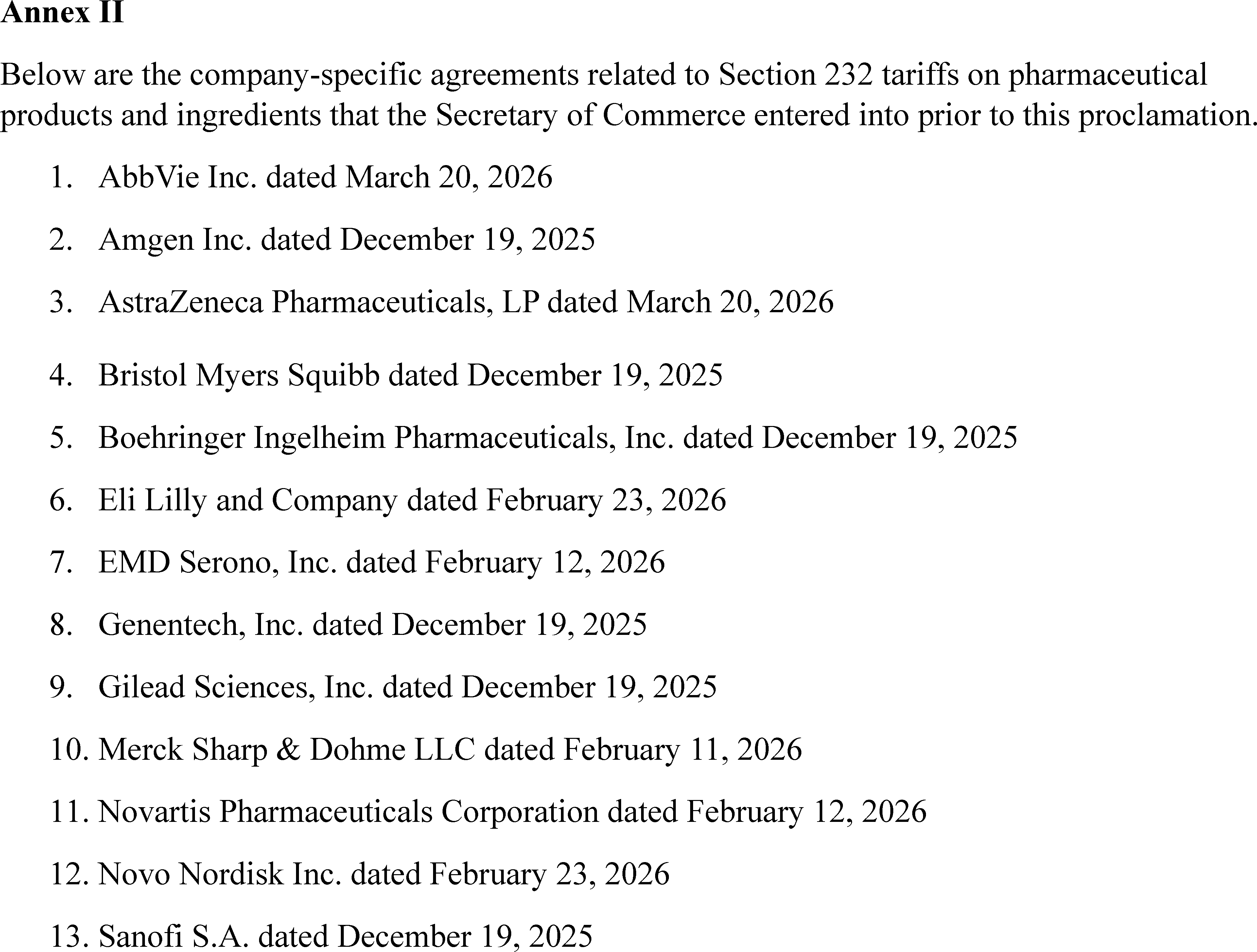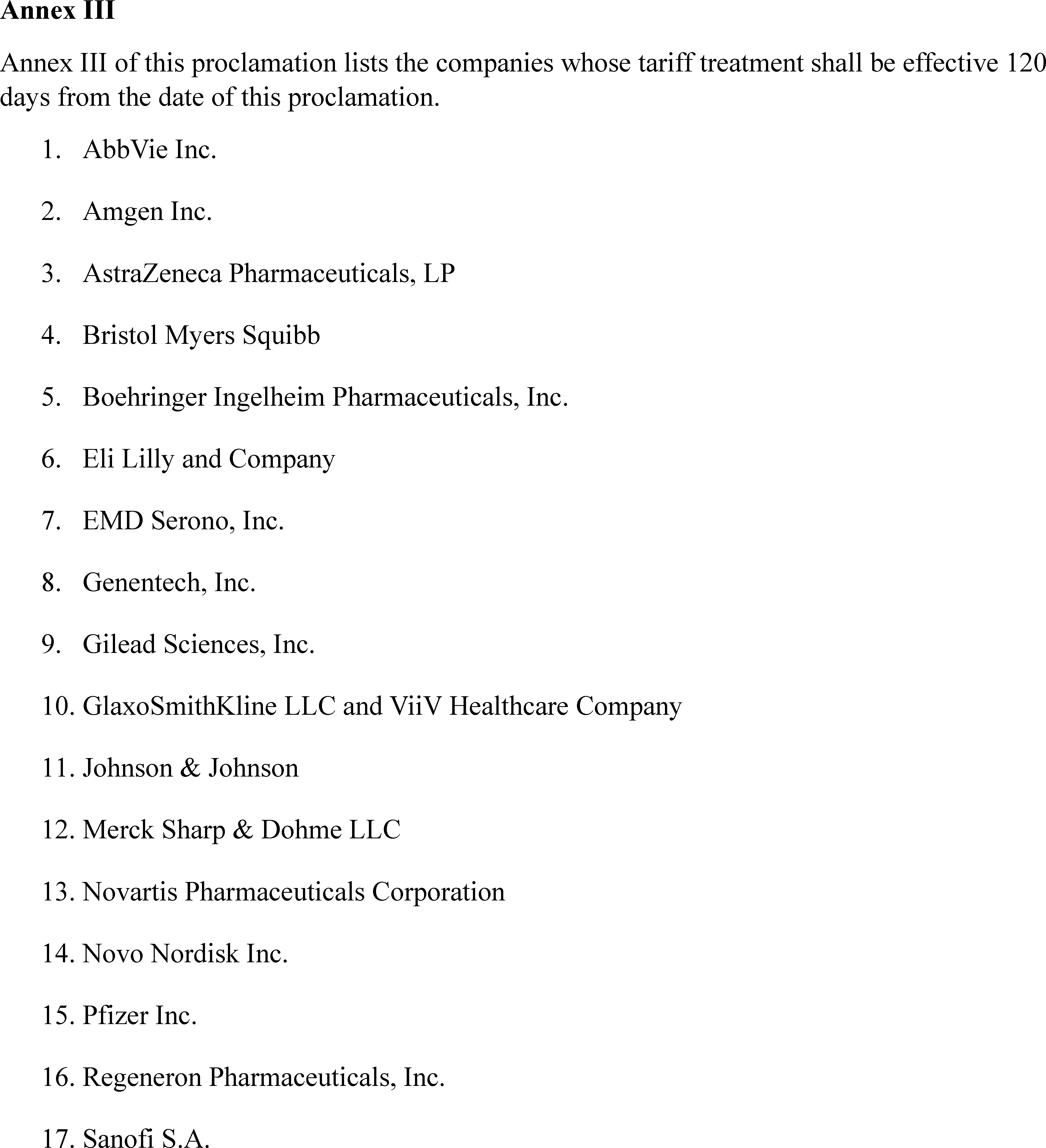(e) For companies that are eligible for the tariff treatment outlined in clause (3)(b) of this proclamation, and that have entered into MFN pharmaceutical pricing agreements with the Secretary of Health and Human Services, the applicable ad valorem tariff rate for pharmaceuticals and associated pharmaceutical ingredients shall be zero until January 20, 2029. The Secretary shall apply this zero tariff rate to companies that he determines are likely to be eligible soon (e.g., because they have agreements in principle with the Secretary and the Secretary of Health and Human Services). For avoidance of doubt, this zero tariff rate shall also apply per the terms of the agreements listed in Annex II to this proclamation.