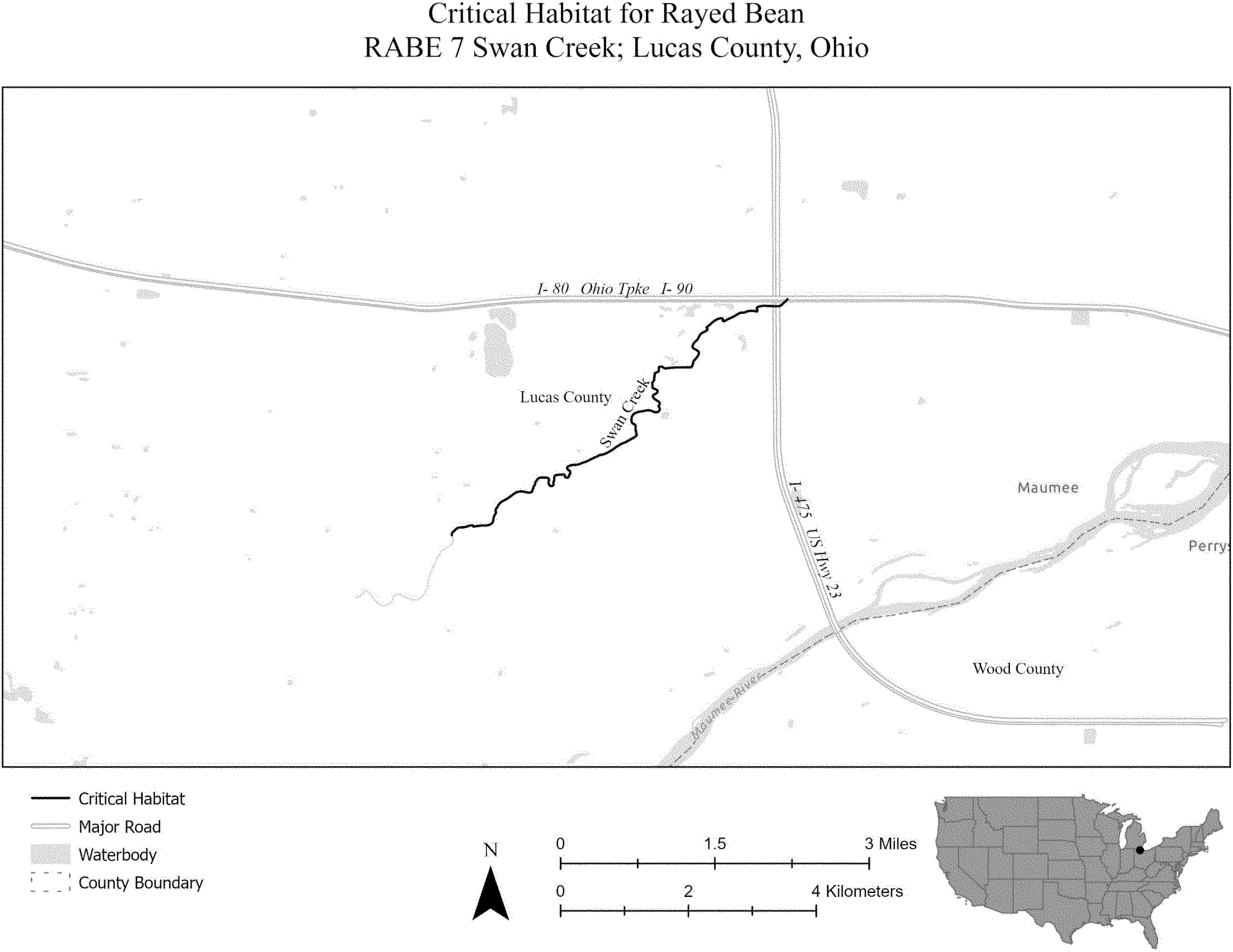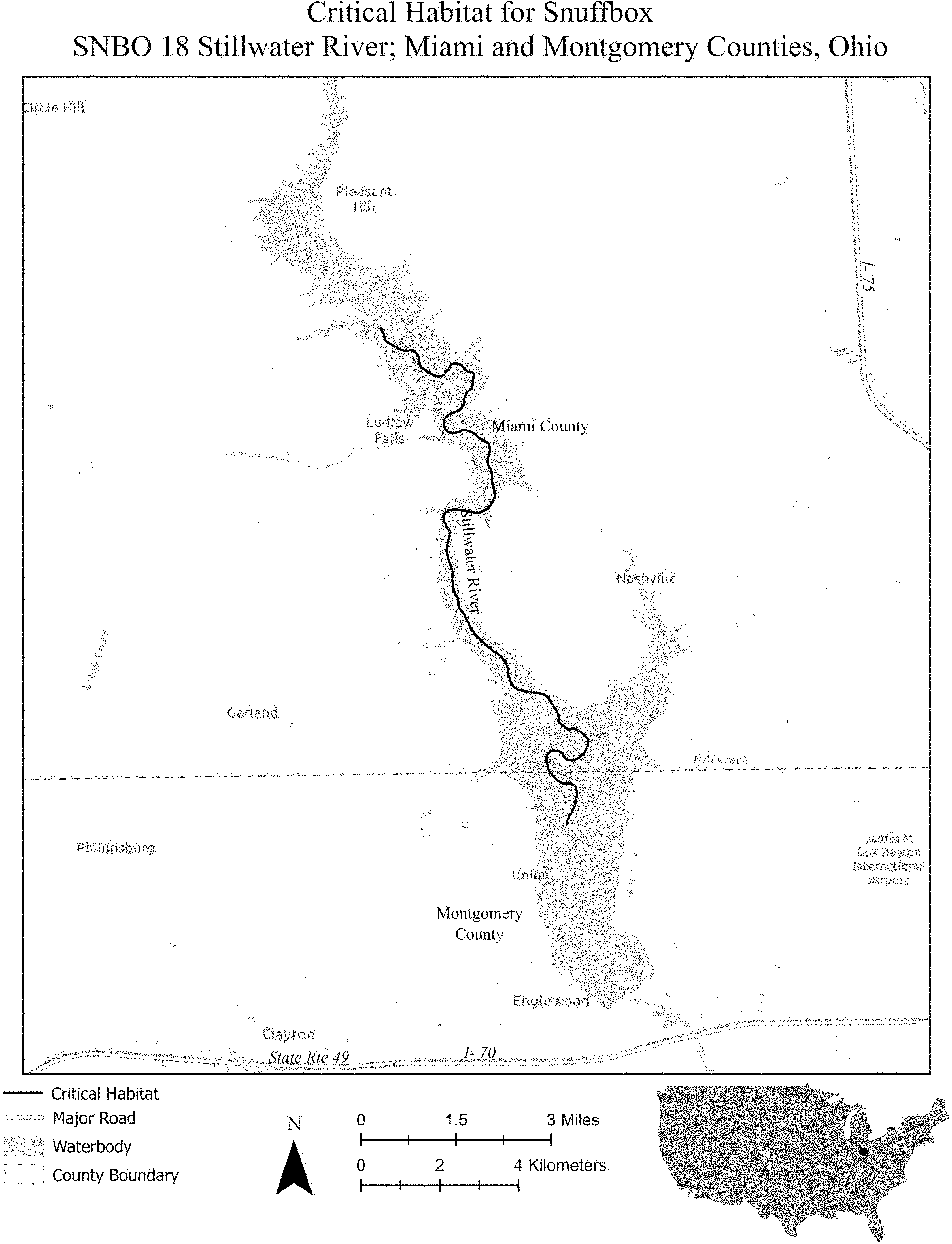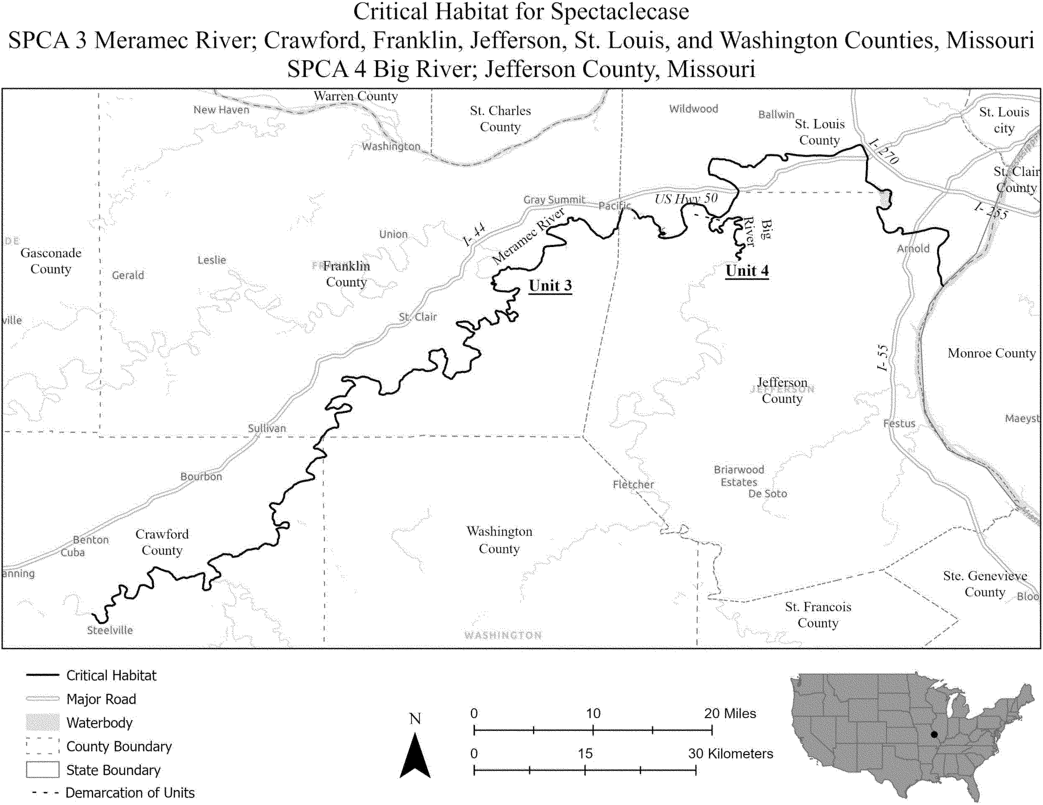 (i) SPCA 3 consists of 156 rmi (251 rkm) of the Meramec River in Jefferson, Saint Louis, Franklin, Crawford, and Washington Counties, Missouri. The unit extends from the downstream side of the Highway 19 bridge near the unincorporated community of Wildwoods (Crawford County, Missouri) downstream to the confluence of the Meramec River with the Mississippi River near the city of Kimmswick (Jefferson County, Missouri). The unit includes the river channel up to the ordinary high-water mark.